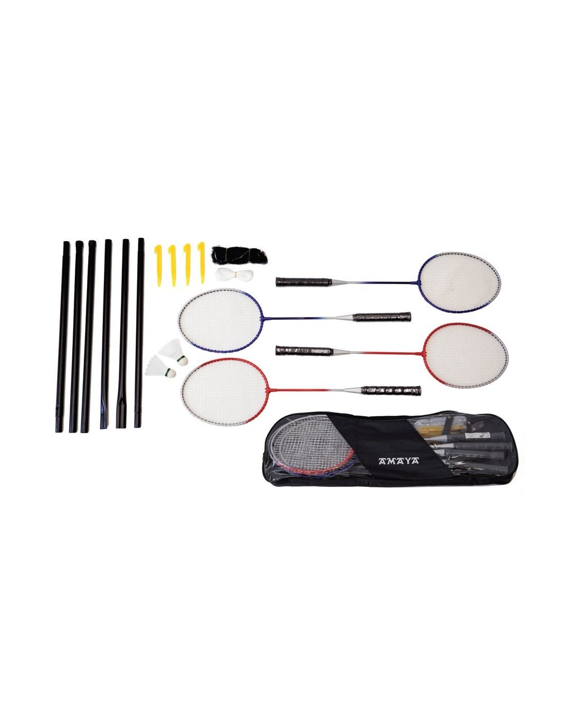 Amaya badmintono rinkinys 4 žaidėjams. Į rinkinį įeina 4 raketės, 2 nailoniniai skraidukai, tinklo laikikliai 180cm, pritvirtinimai, tinklas, dėklas.