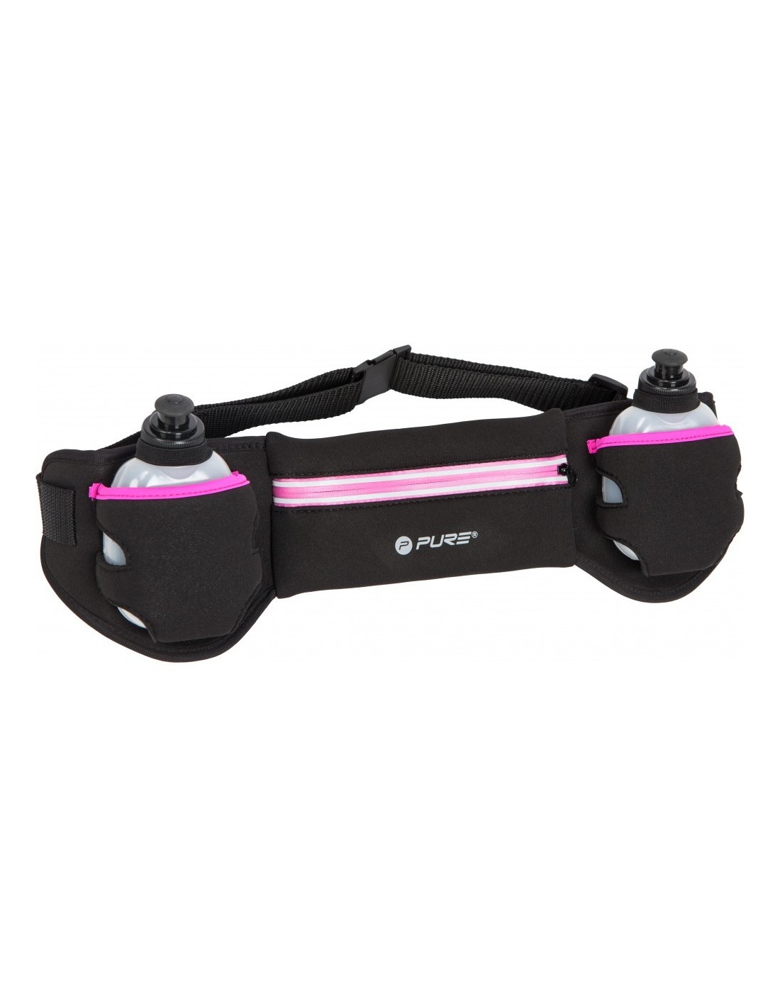 Naudodamiesi „Pure2Improve“ bėgimo diržu, bėgiodami turėsite laisvas rankas. Pagamintas iš neperšlampamos medžiagos su neperšlampamu užtrauktuku, bėgimo diržas leidžia jums pasiimti mažus daiktus, tokius kaip mobilųjį telefoną ar raktus, net ir lietingą dieną.Jame yra dvi 170 ml talpos kišenės vandens buteliams.Be to, diržas yra reguliuojamas taip, kad jis tiktų žmonėms, turintiems skirtingą klubo apimtį.