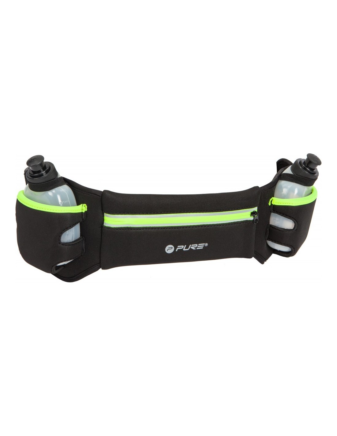 Naudodamiesi „Pure2Improve“ bėgimo diržu, bėgiodami turėsite laisvas rankas. Pagamintas iš neperšlampamos medžiagos su neperšlampamu užtrauktuku, bėgimo diržas leidžia jums pasiimti mažus daiktus, tokius kaip mobilųjį telefoną ar raktus, net ir lietingą dieną.Jame yra dvi 170 ml talpos kišenės vandens buteliams.Be to, diržas yra reguliuojamas taip, kad jis tiktų žmonėms, turintiems skirtingą klubo apimtį.
