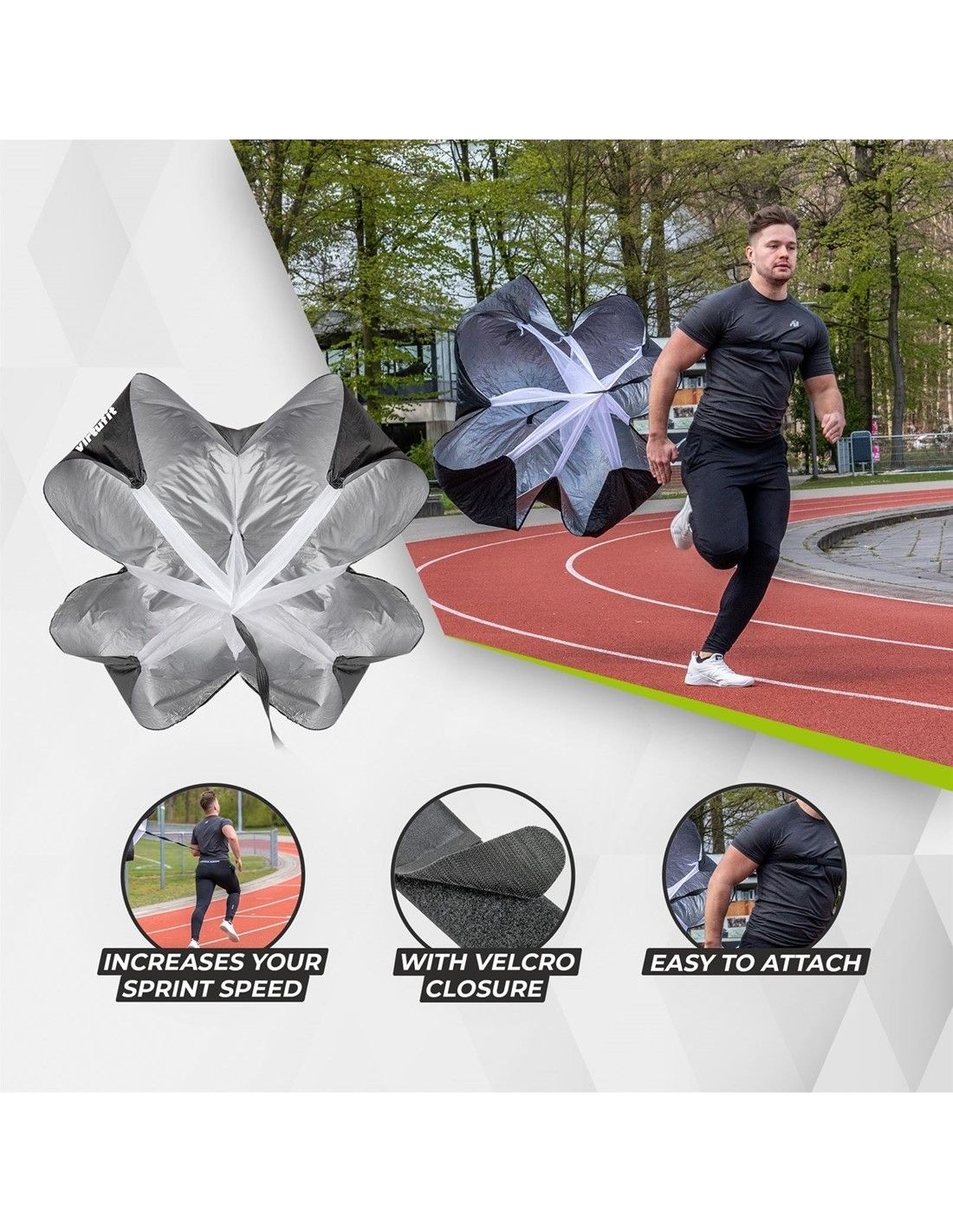 Ant juosmens pritvirtinę „VirtuFit“ greičio parašiutą, sprintuodami sukuriate didesnį pasipriešinimą. Kuo stipriau bėgi, tuo didesnis pasipriešinimas. Kad pasiektumėte tokį patį greitį kaip įprasta, jūsų raumenys turi dirbti sunkiau. Reguliariai įtraukdami parašiutą į savo treniruotes, pastebėsite, kad jūsų sprinto greitis ir pagreitis žymiai pagerės.