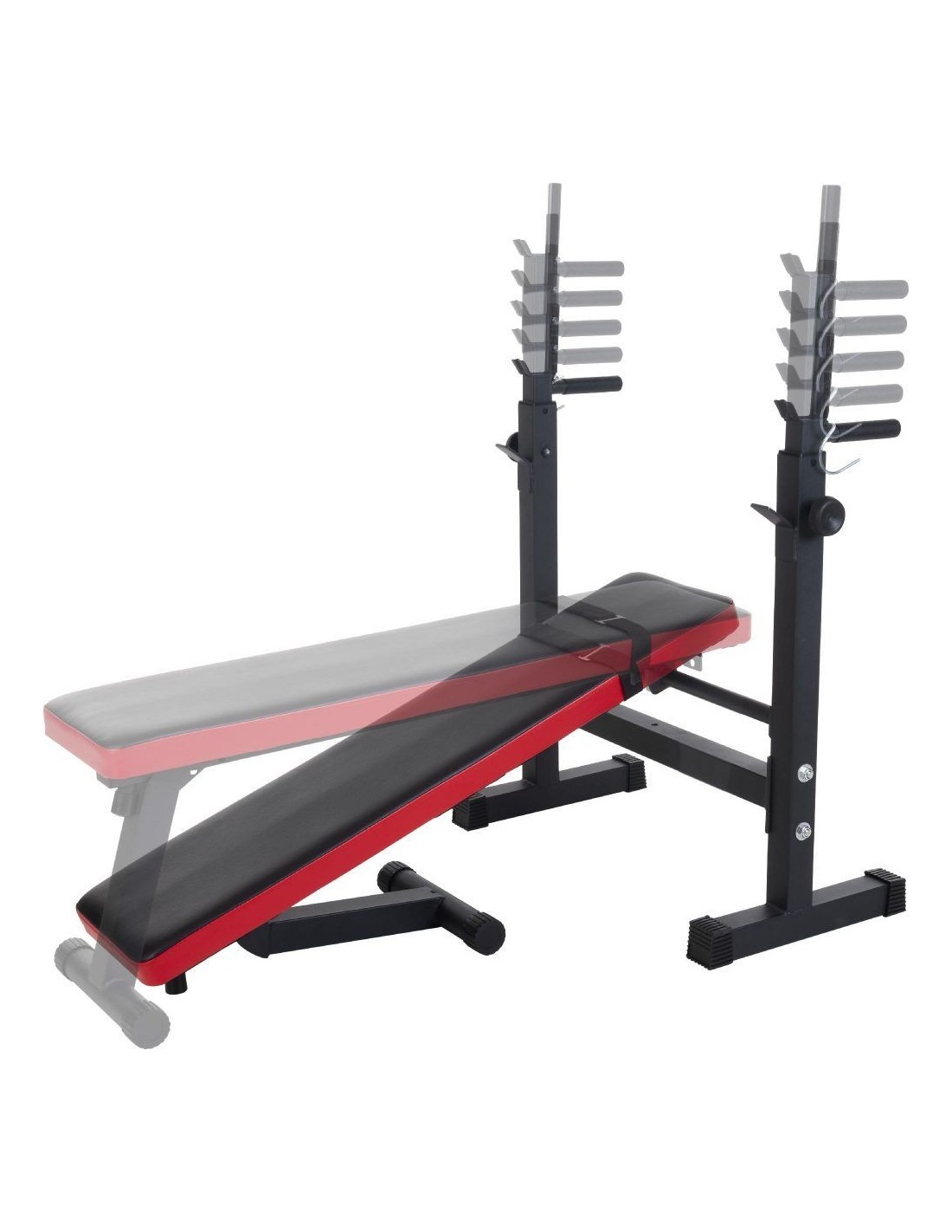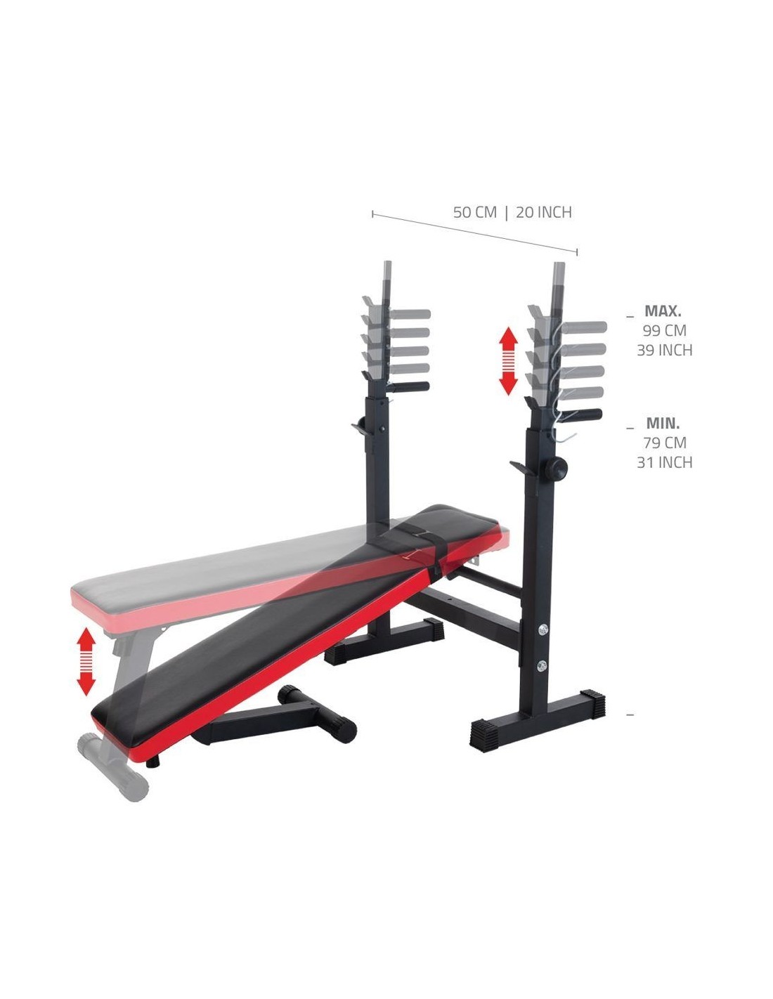 Štangos atramos yra reguliuojamo aukščio, kad būtų patogu spausti. Po štangos atrama yra saugos indikatorius, kai negalite baigti pratimo.