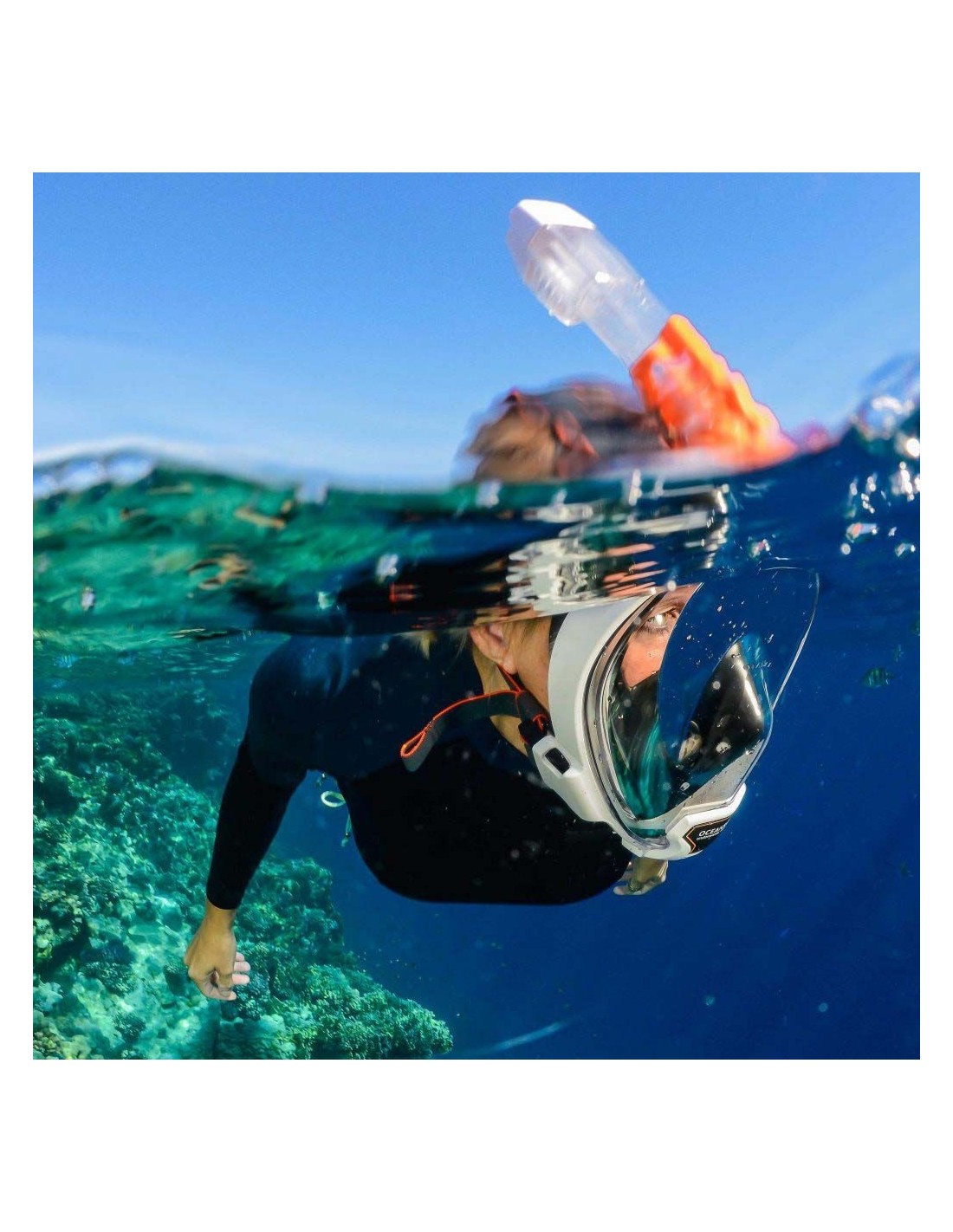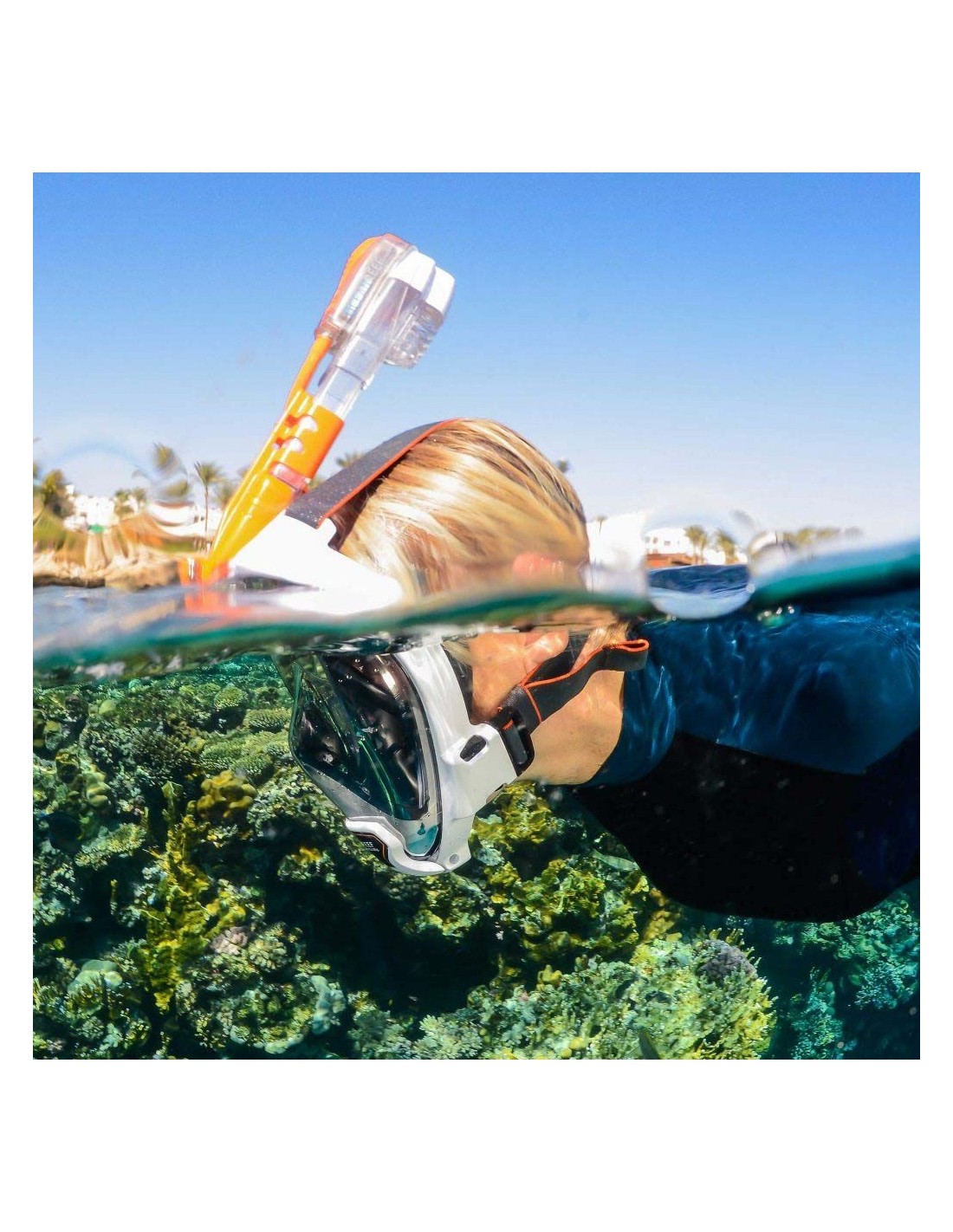 Tai perversmas plaukiojime su vamzdeliu, kadangi Jūs galite laisvai kvėpuoti tiek per nosį tiek per burną, nereikia būti įsikandus vamzdelio kandiklio. Kaukė nerasoja, didelis matomumo laukas. Sauso tipo vamzdelis panėrus neleidžia vandeniui patekti į kaukės vidų. Komplekte GO-PRO laikiklis pritvirtintas ant vamzdelio. Komplekte sauso tipo maišelis su nešiojimo dirželiu.