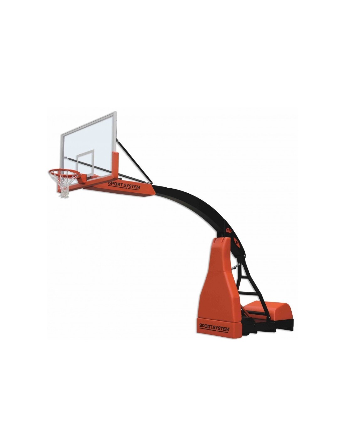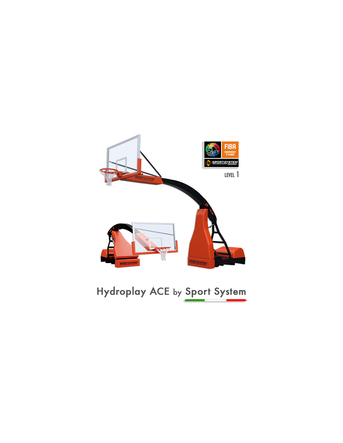 Mobilus krepšinio stovas „HYDROPLAY ACE“, projekcija 3,25 m, hidrauliškai sulankstoma su elektros variklio atrama, teleskopinis aukščio reguliavimas, grūdinto stiklo lenta 105x180 cm, profesionalus spyruokliuojantis lankas, apsaugos ant lentos ir stovo, lanko tinklelis. Pilna komplektacija skirta uakščiausio lygio tarptautinėms varžyboms.