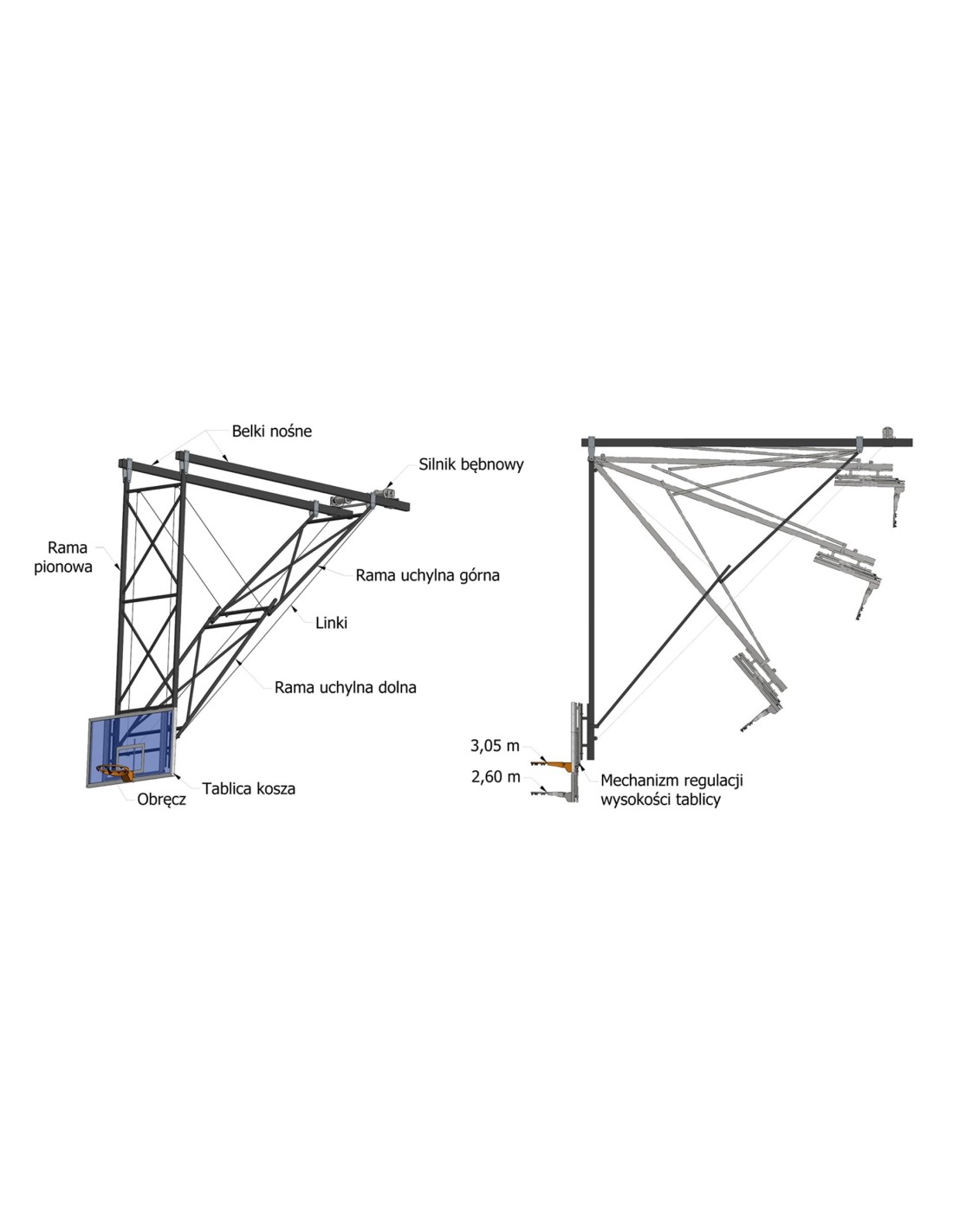 Krepšnio konstrukcija montuojama prie esmų stogo konstrukcijų. Užlenkiama į priekį arba atgal elektrinio variklio pagalba. Konstrukcija pagaminta iš plieno profiliu. Besilankstančiose vietose sujungta taip kad išliktų stabili esant dideliems krūviams. Konstrukcijos visada yra taikomos prie individualaus projekto ir lubų geometrijos.