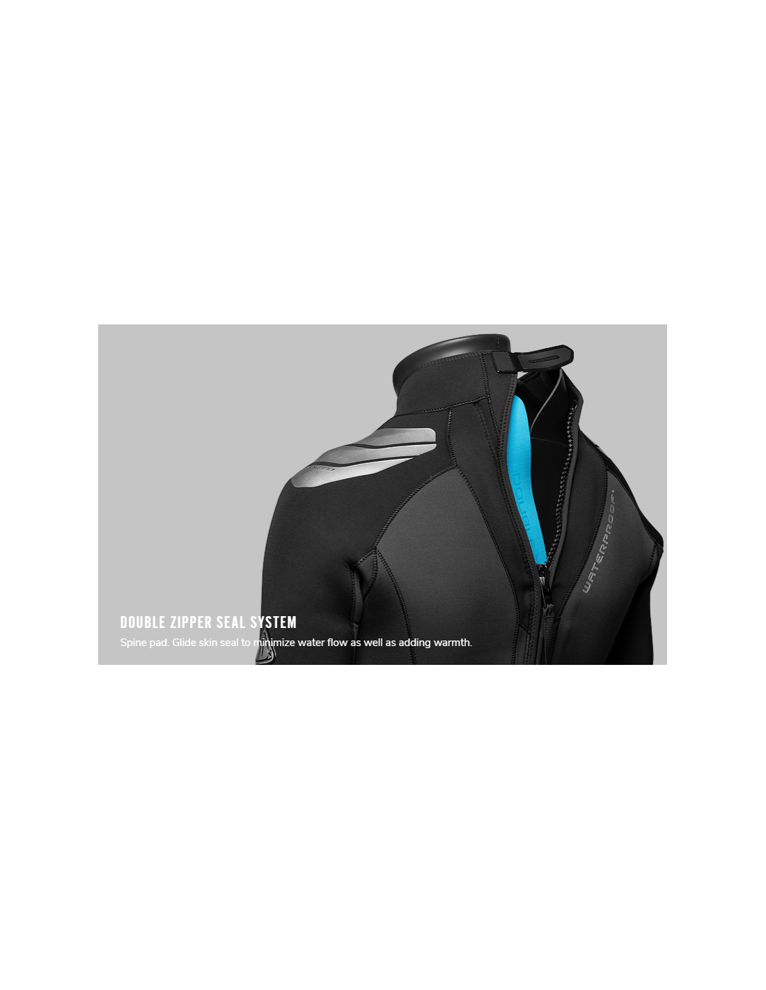 Pastorinto neopreno sluoksnio stuburo pagalvėlė. Dviguba užtrauktuko sandarinimo sistema su papildomu atvirų porų neopreno sluoksniu, kuris veikia kaip sandariklis, kad sumažintumėte vandens tekėjimą ir pridėtumėte šilumos.