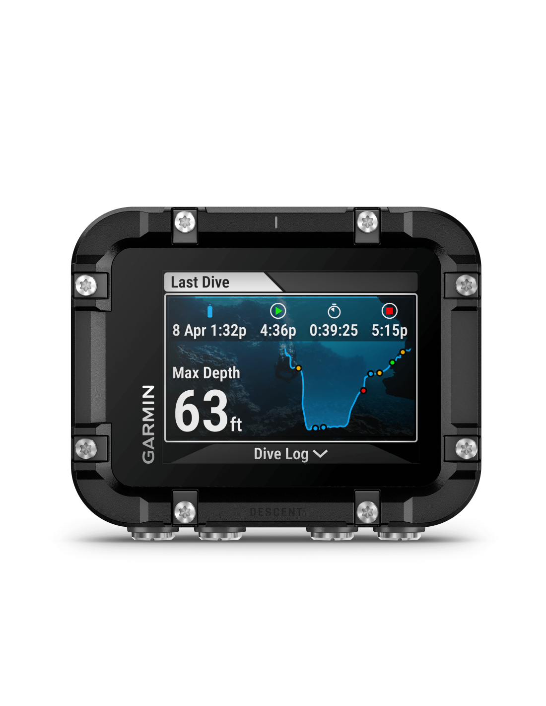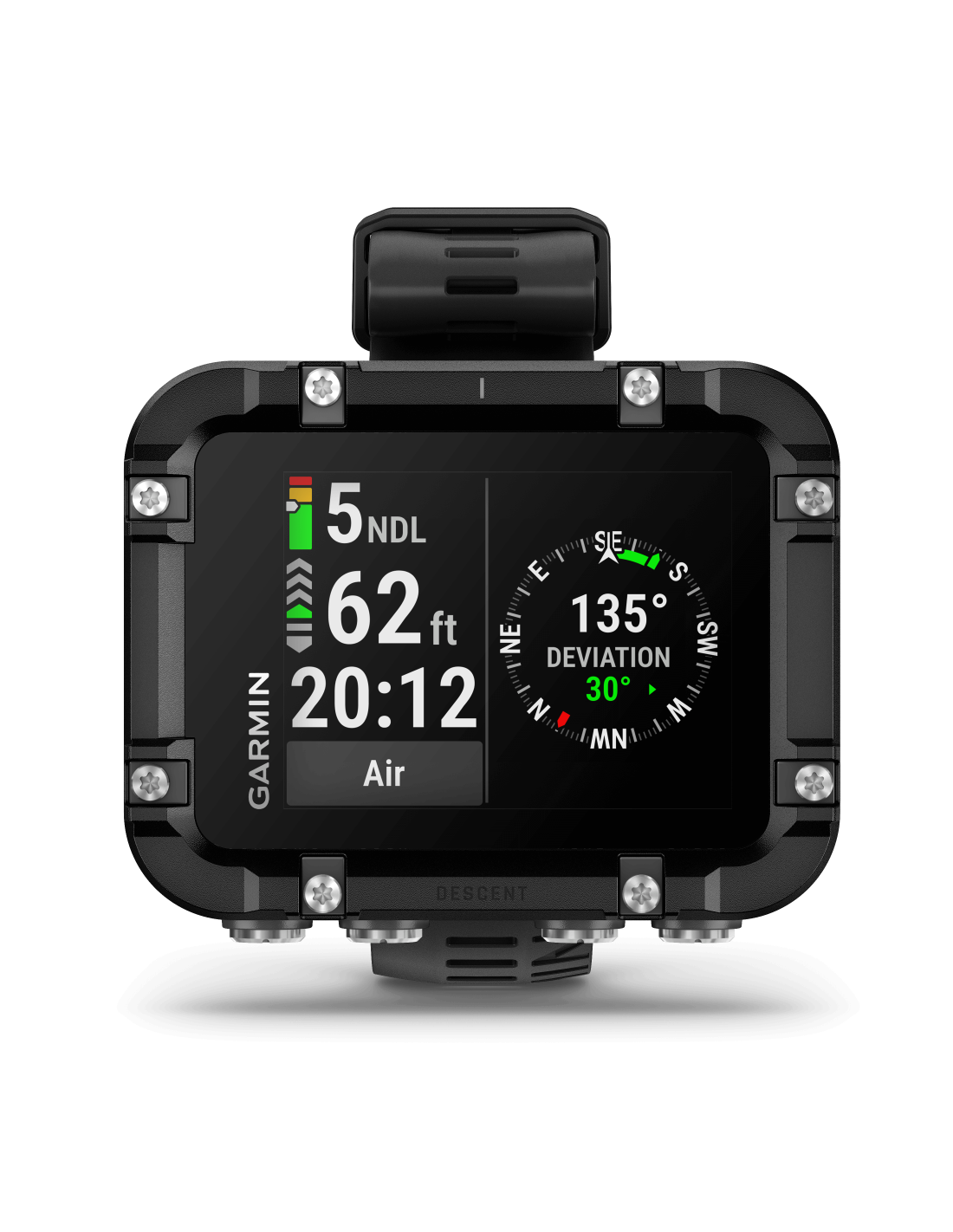 Matykite svarbią informaciją ir pasirinktinius nardymo ekranus vos žvilgtelėję į didelį, lengvai įskaitomą spalvinį ekraną.