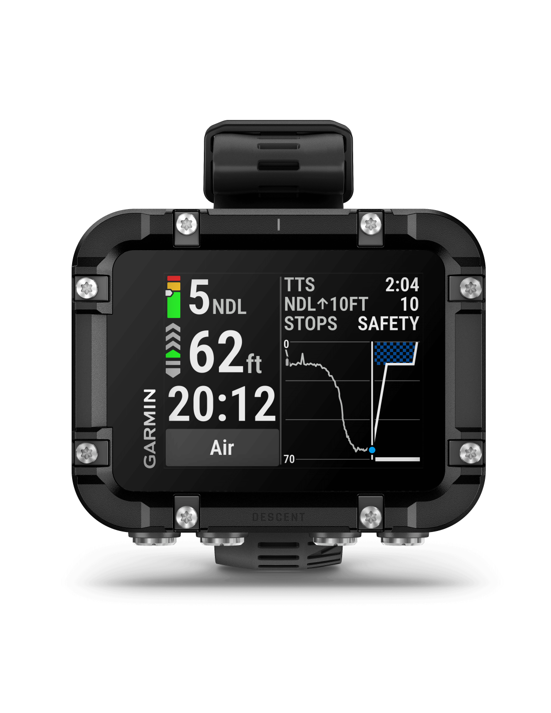 Ilgiau išbūkite po vandeniu naudodamiesi „NDL Aware“ gylio rodikliais, teikiamais realiuoju laiku ir nurodančiais, kaip konkretūs gylio pokyčiai gali paveikti jūsų laiko be dekompresijos ribą (NDL).