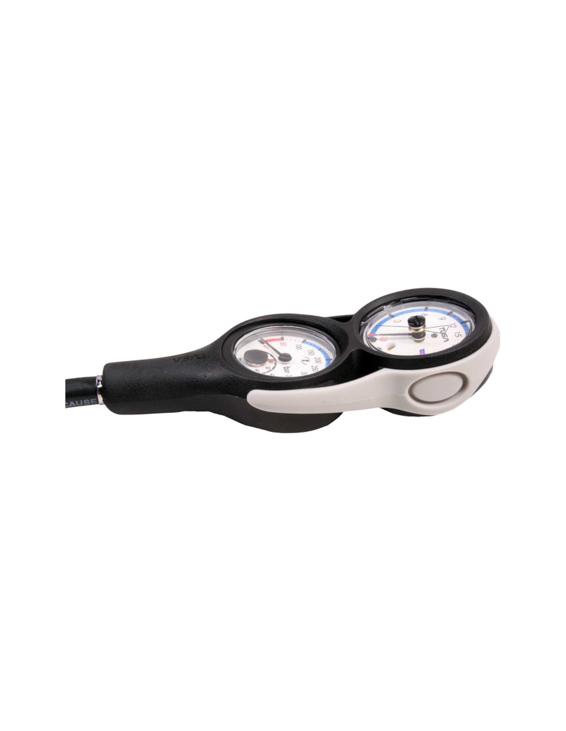 Kompaktiškoje 2 dalių prietaisų konsolėje yra gylio matuoklis ir aukšto slėgio matuoklis.