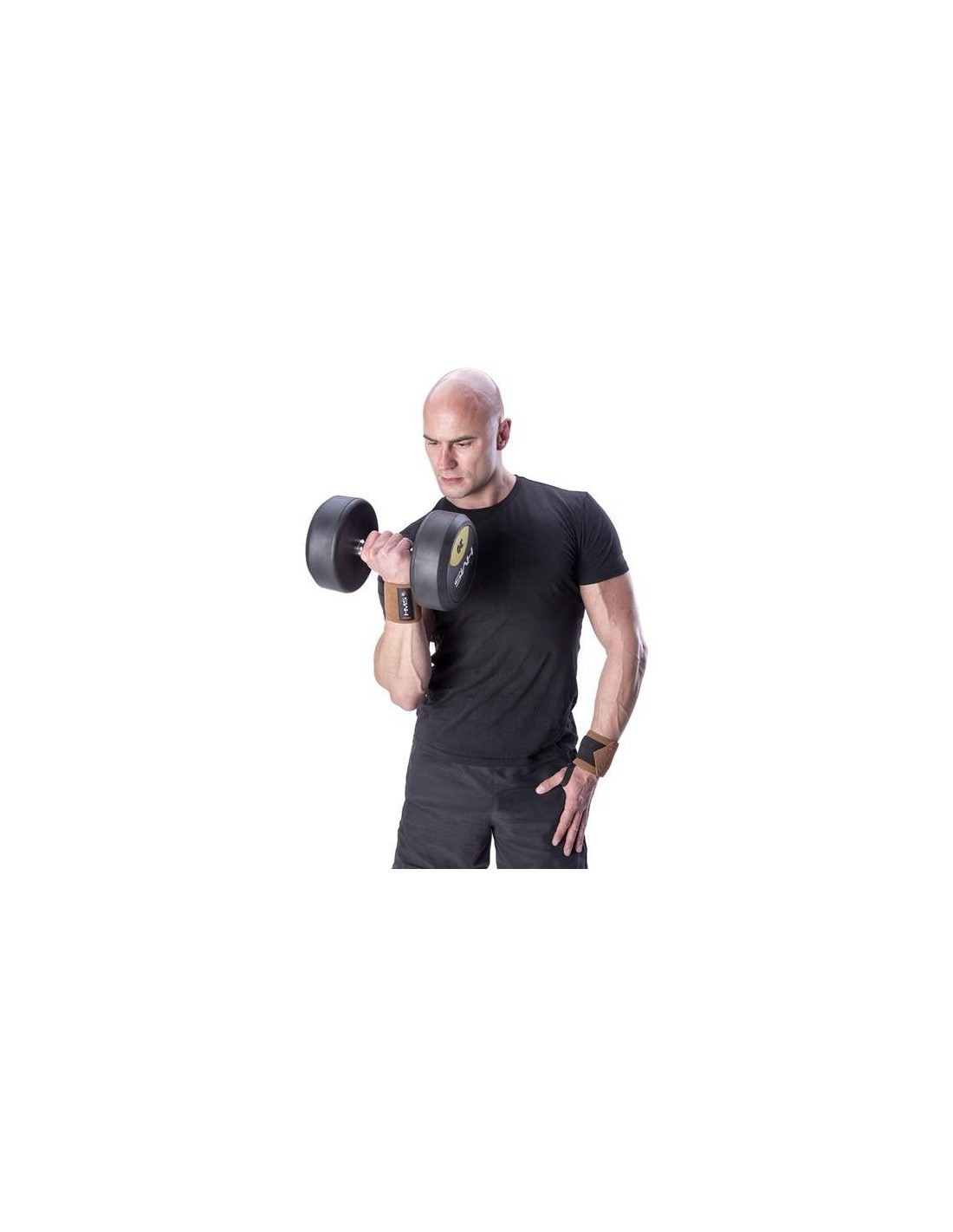 Šis gaminys idealiai sutvirtina riešus, todėl išvengiama traumų treniruojantis su dideliu krūviu. Dirželis turi "Velcro" tvirtinimą, kuriuo galima reguliuoti jo apimtį, taip pat nykščio rankenėlę, kad dirželis tvirtai laikytųsi ant rankos. Riešų apvyniojimai suteikia papildomą komfortą ir apsaugą riešams, sumažina patempimų ir traumų riziką intensyvių treniruočių metu. Pagaminti iš labai patvarios karvės odos, kuri nesukelia diskomforto treniruočių metu ir užtikrina puikų sutvirtinimą.