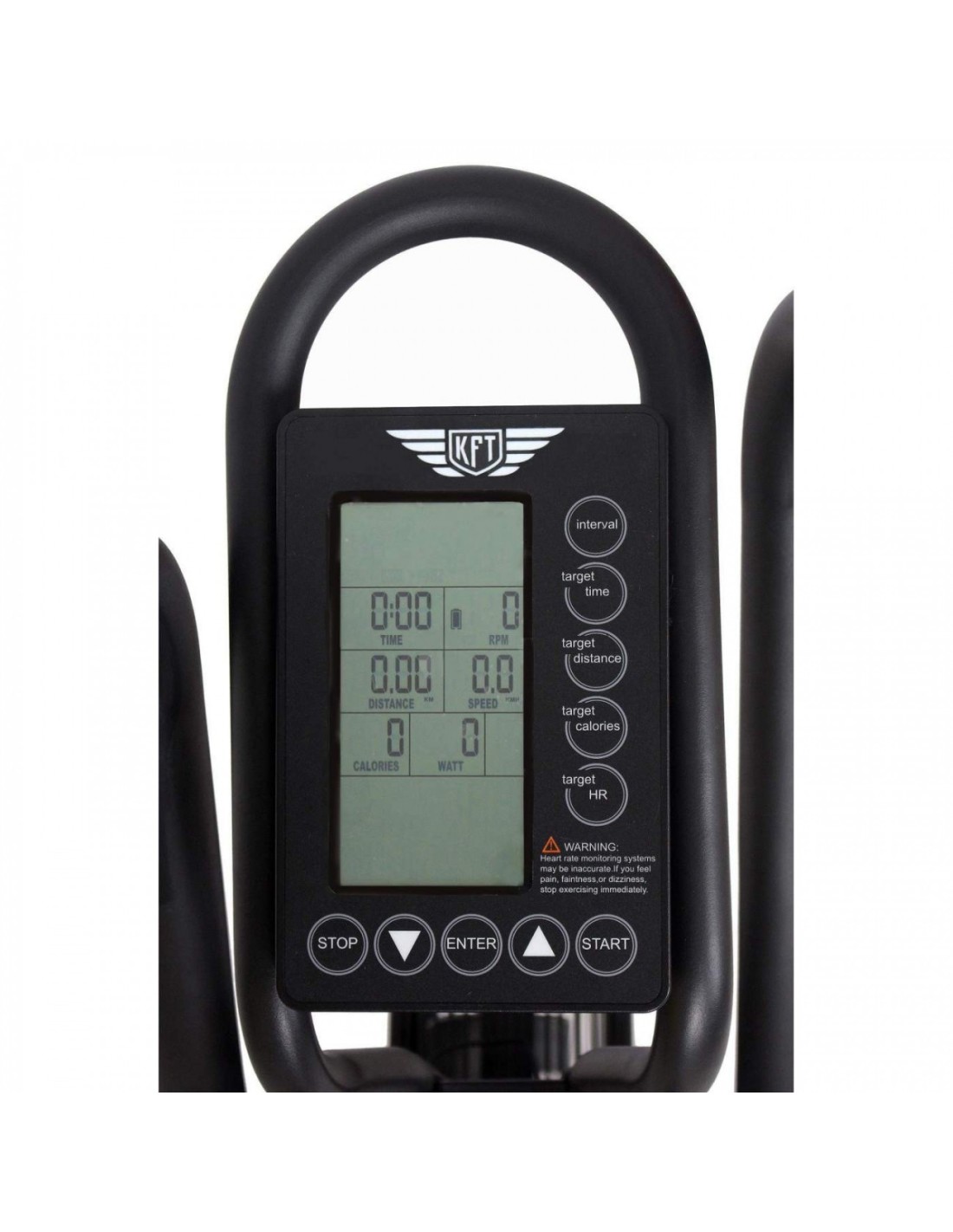 KFT oro dviratis turi viską, prie ko esate įpratę, ir dar daugiau! Pradėkite minti pedalus iš karto, konsolėje stebėdami atstumą, laiką, greitį, kalorijas, vatus ir širdies ritmą. Konsolė taip pat leidžia perjungti matavimo vienetus: metrus arba mylias, taip pat matuoti kalorijas šimtosiomis kalorijos dalimis, kad žinotumėte tikslią savo pažangą. Taip pat įtraukėme galimybę nustatyti atstumą, kalorijas ir laiką, kol konsolė skaičiuoja iki jūsų konkretaus tikslo, kad žinotumėte, kiek dar laiko reikia treniruotis.