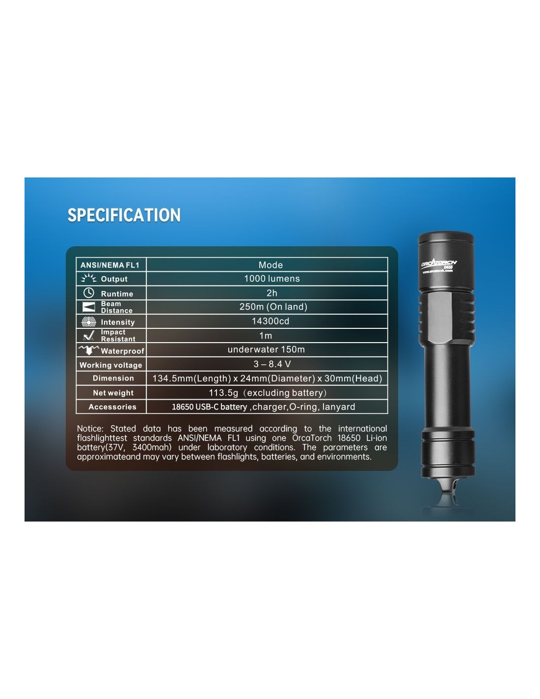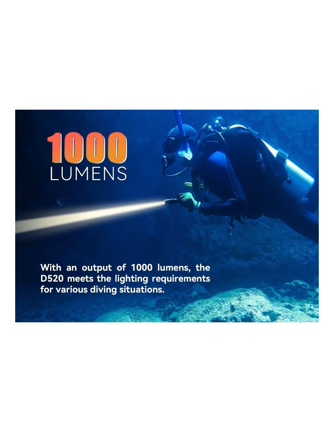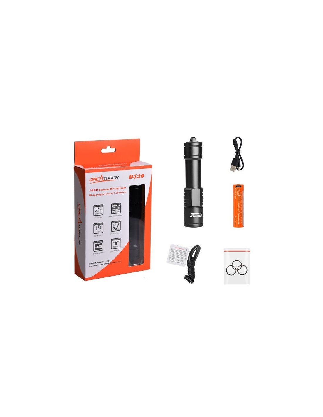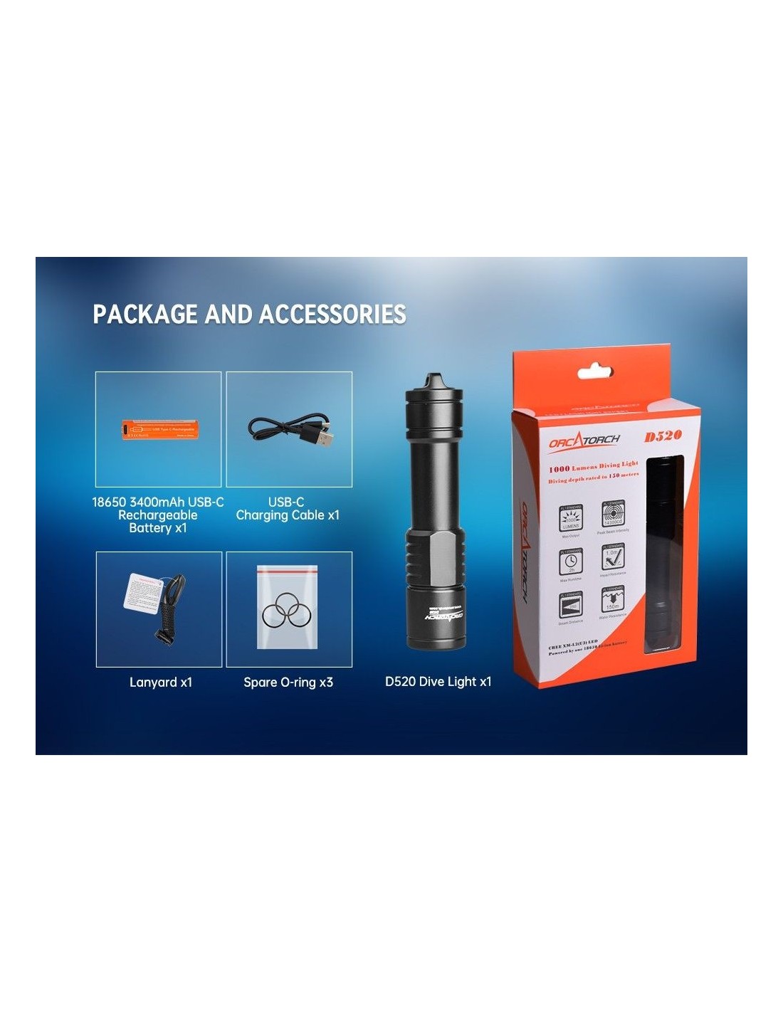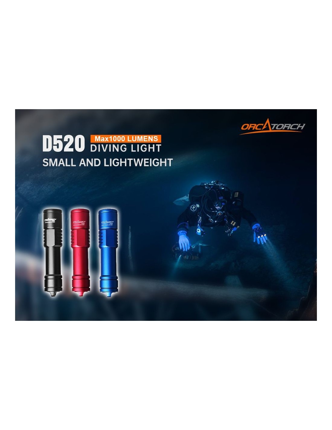 „OrcaTorch D520“ – tai delno dydžio nardymo žibintas su mechaniškai sukamuoju jungikliu. Sukamasis jungiklis užtikrina didelį patikimumą po vandeniu. Naudojamas JAV CREE XM-L2(U4) neutralios baltos spalvos LED, maksimalus šviesos srautas gali siekti 1000 liumenų, o 5000 K LED spalvos temperatūra užtikrina puikų spalvų atkūrimą. Maitinamas viena USB-C 18650 baterija, maksimalus veikimo laikas gali siekti 2 valandas.