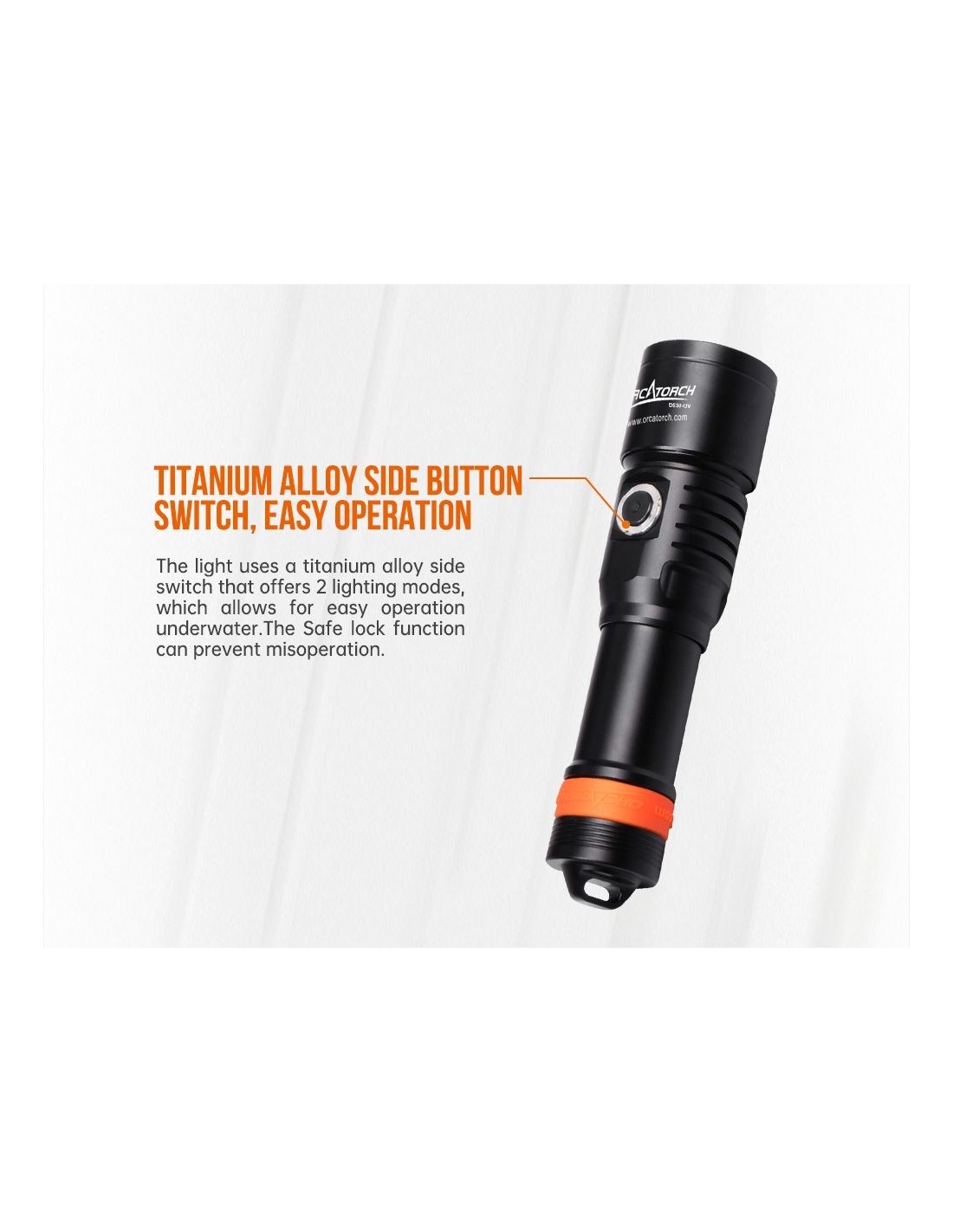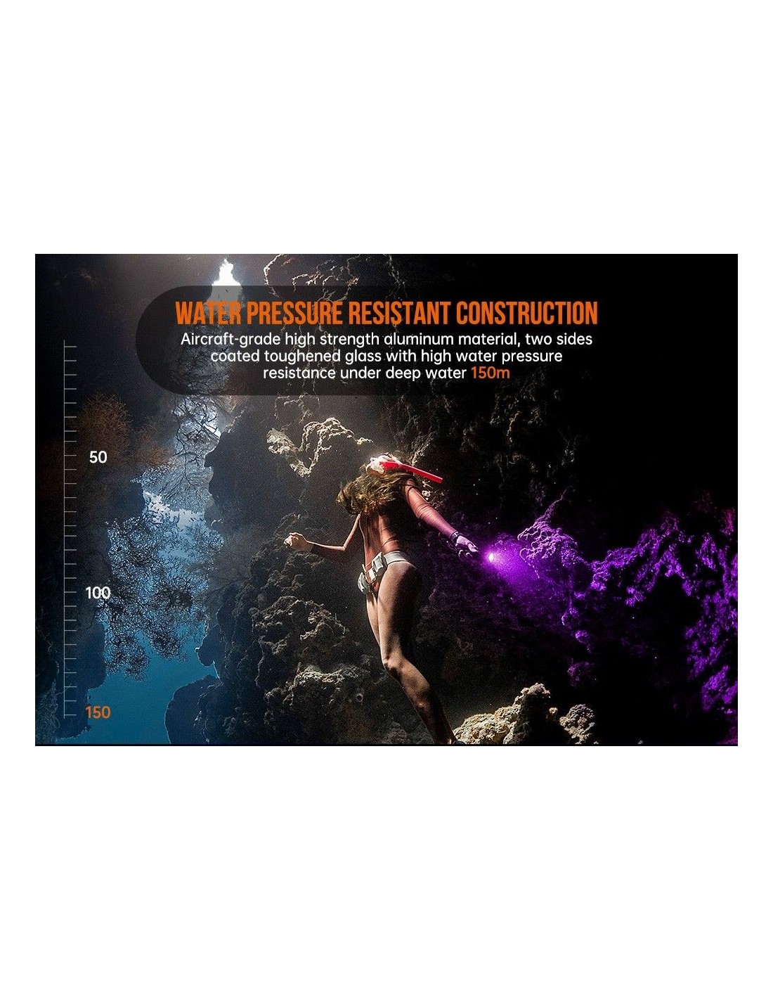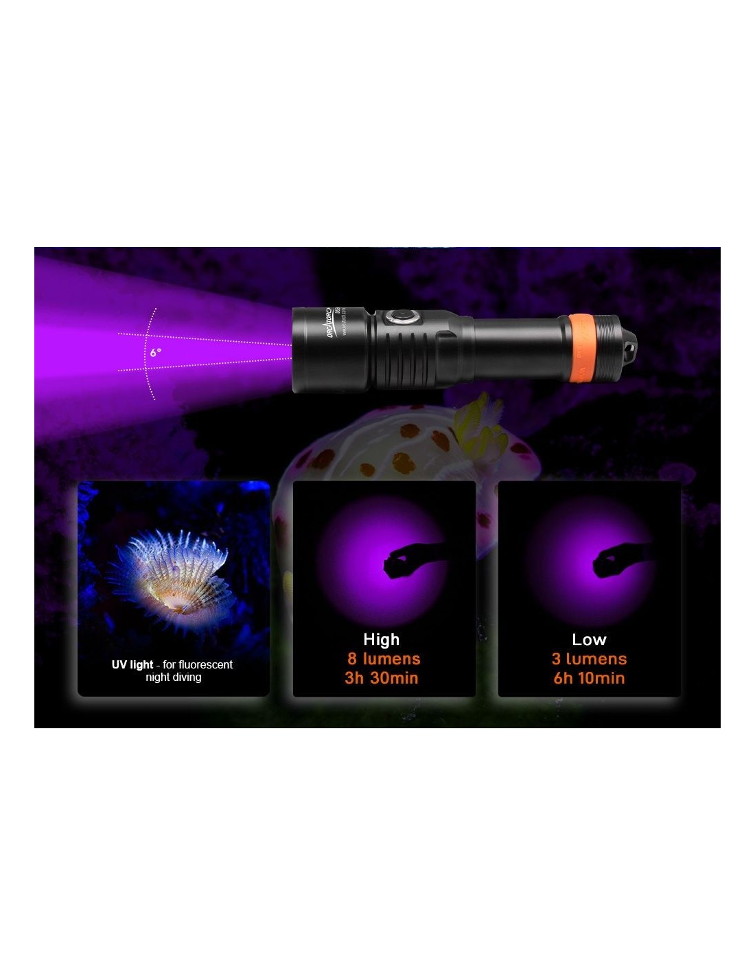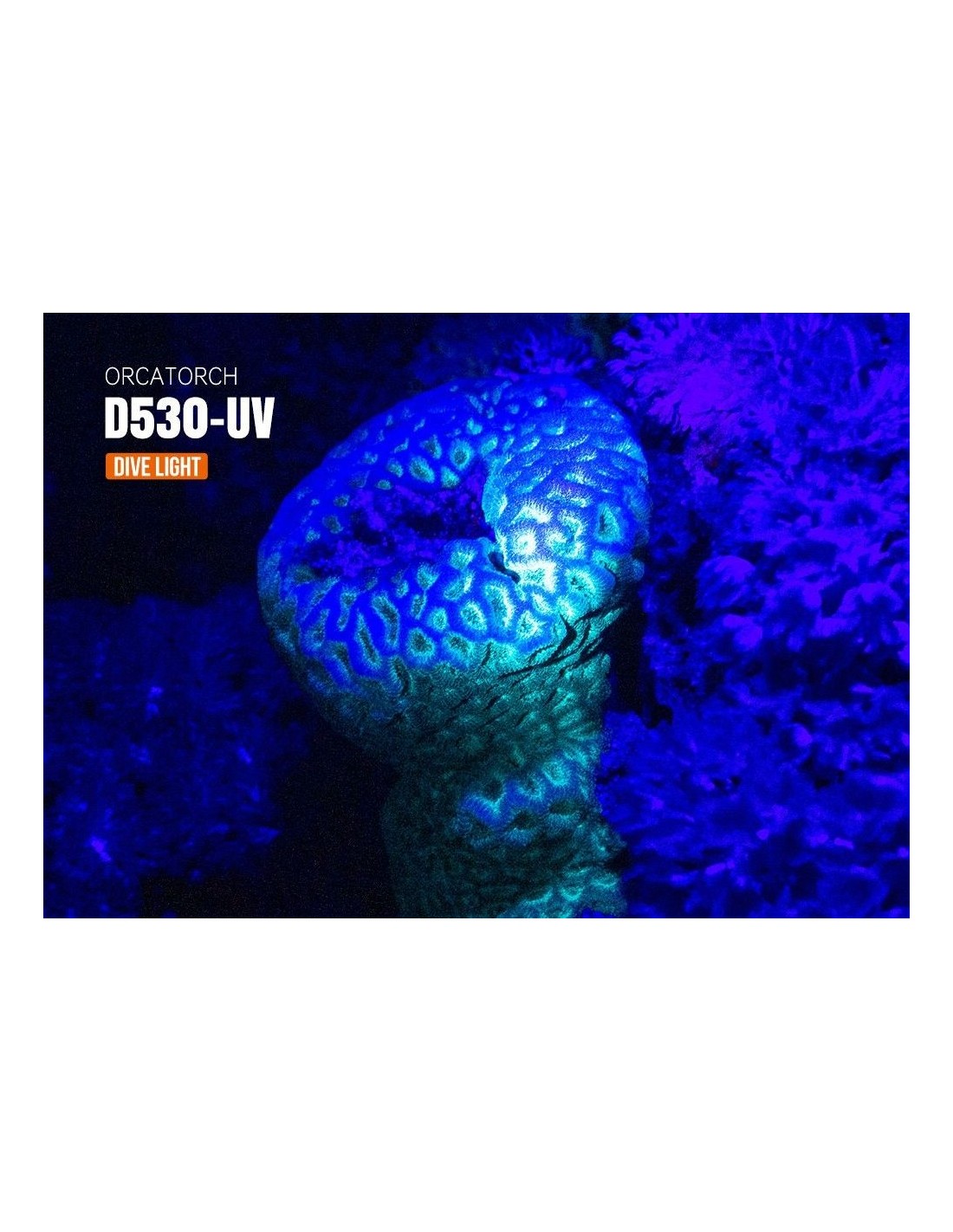 „OrcaTorch D530“ UV LED yra būtinas pagrindinis nardymo žibintas povandeniniams fotografams, jis puikiai papildo įprastus narų žibintus. 395 nm šviesos diodas sukuria nuostabų fluorescencinį efektą. Jis gali atgaivinti rifą! UV šviesa beveik nematoma plika akimi, todėl matomos tik fluorescencinės spalvos. Dėl 6 laipsnių itin fokusuoto spindulio kampo galite išryškinti neįtikėtinas jūros gyvūnijos spalvas ir detales. Žibintuvėlyje naudojamas titano lydinio šoninis jungiklis, turintis 2 apšvietimo režimus, leidžiančius lengvai jį naudoti po vandeniu. Ant jungiklio mygtuko esantis LED indikatorius taip pat rodo likusį akumuliatoriaus įkrovą.