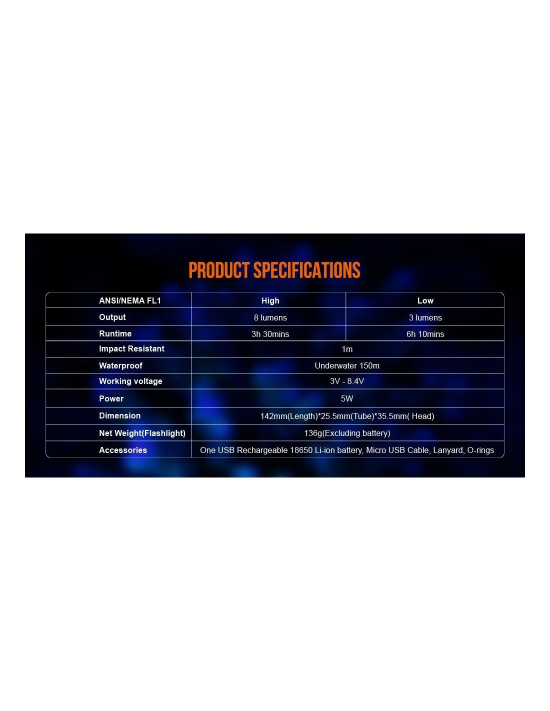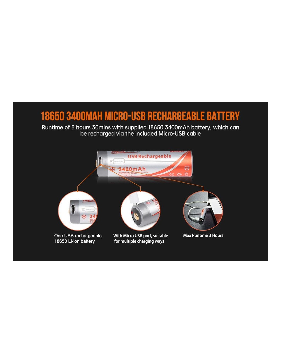 * Naudojama 1 x 18650 ličio jonų įkraunama baterija