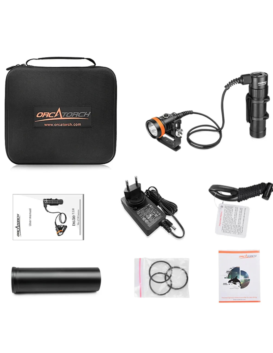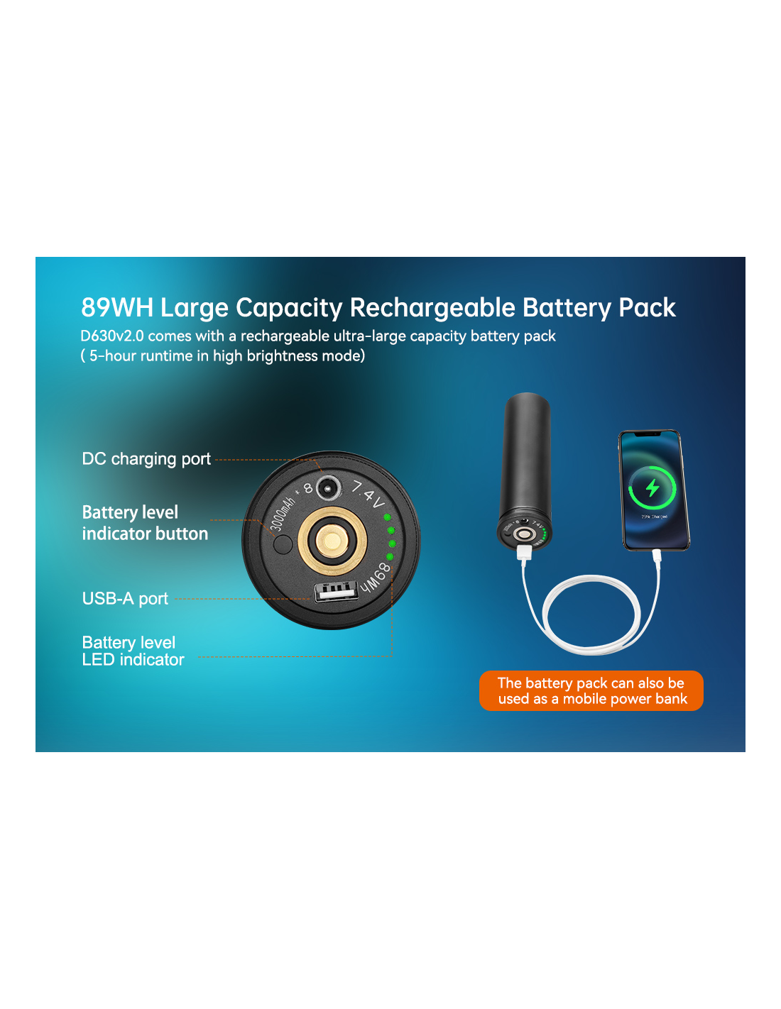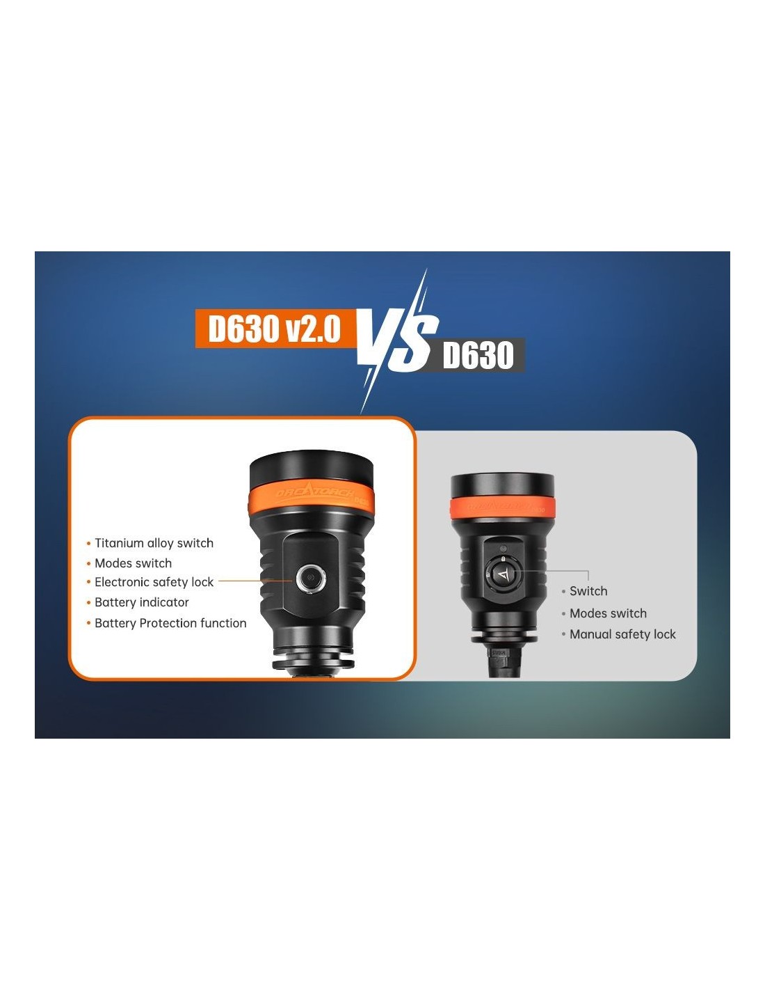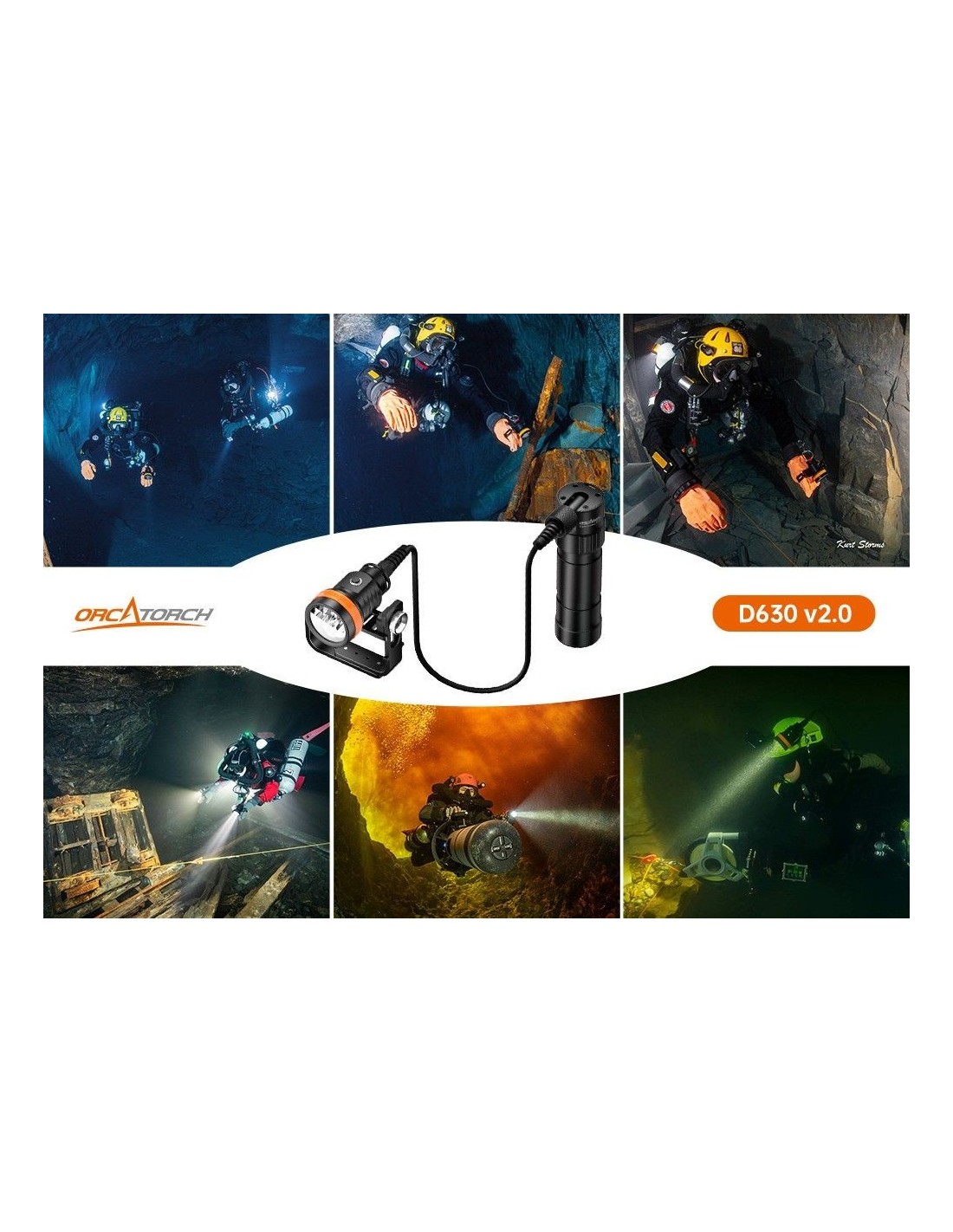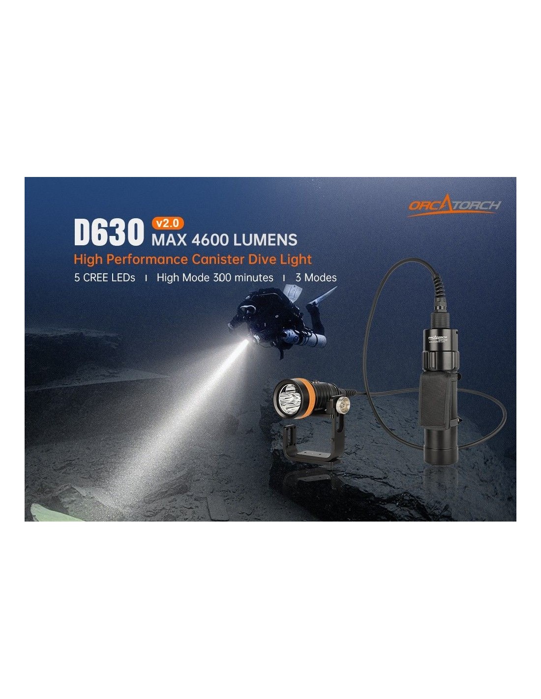 „OrcaTorch D630 v2.0“ – tai cilindrinis nardymo žibintas, specialiai sukurtas nardymui urvuose, nardymui po nuolaužas ir kitai techninei nardymo veiklai. Jis pasižymi maksimaliu 4600 liumenų ryškumu. „D630 v2.0“ turi 1,2 m ilgio reguliuojamo kampo laidą, kurį galima tvirtinti tiek 90° kampu gale, tiek 180° kampu šone, kad atitiktų įvairius naudojimo poreikius. Integruotas didelės talpos akumuliatorius užtikrina 4 valandų ir 20 minučių veikimo laiką esant dideliam ryškumui ir taip pat gali būti naudojamas kaip išorinė baterija. Kai akumuliatoriaus lygis nukrenta žemiau 10 % (6,2 V), akumuliatoriaus apsaugos funkcija automatiškai įjungia avarinį apšvietimą, siūlydama 120 liumenų šviesos srautą ir maždaug 5 valandų veikimo laiką, kad būtų užtikrintas jūsų saugumas.