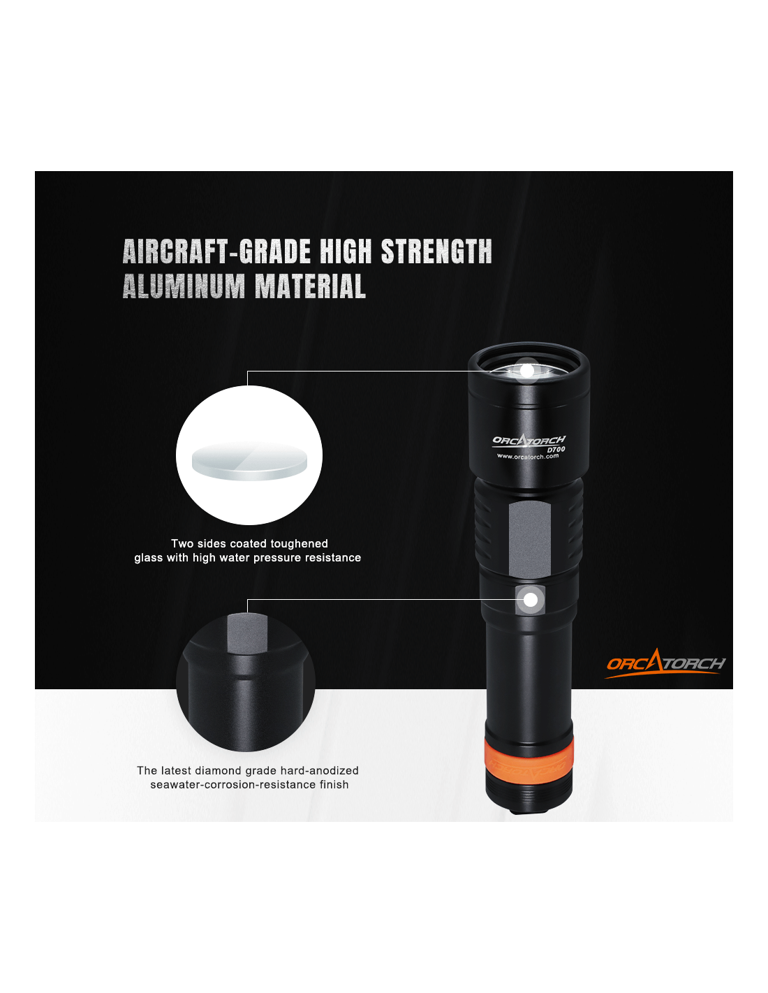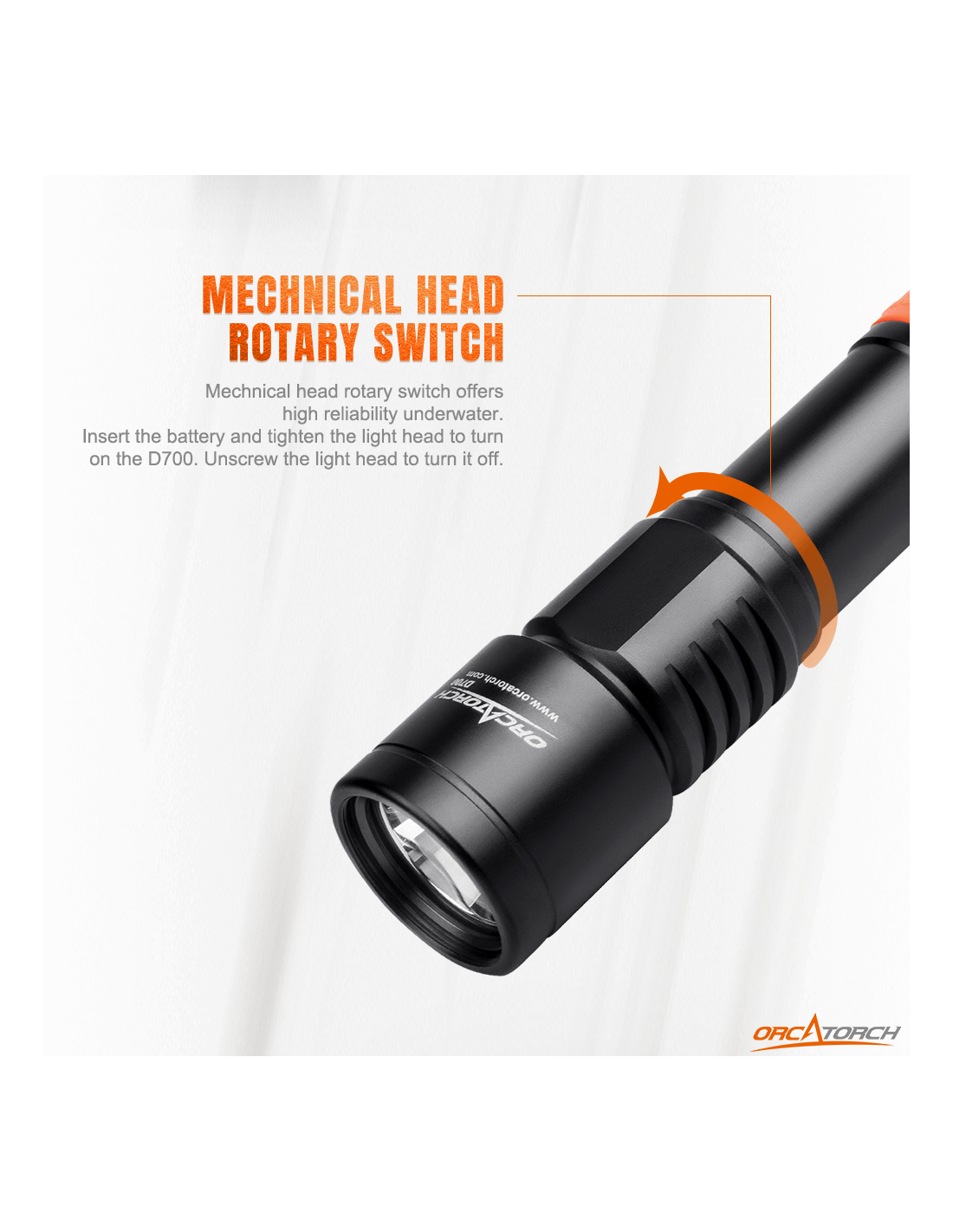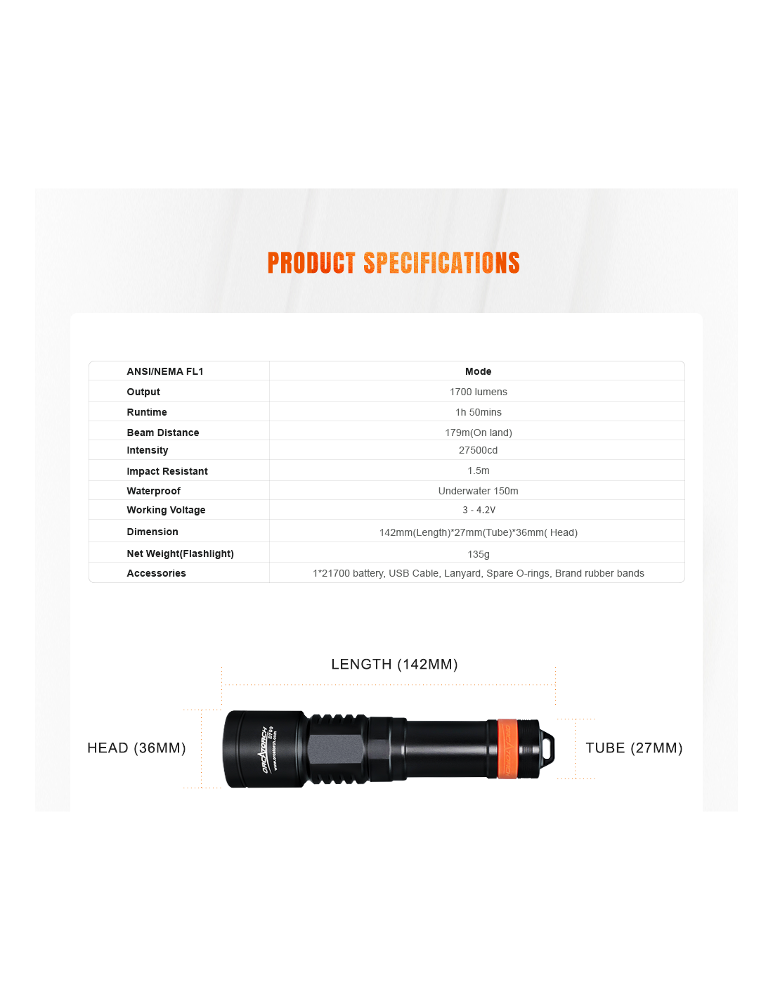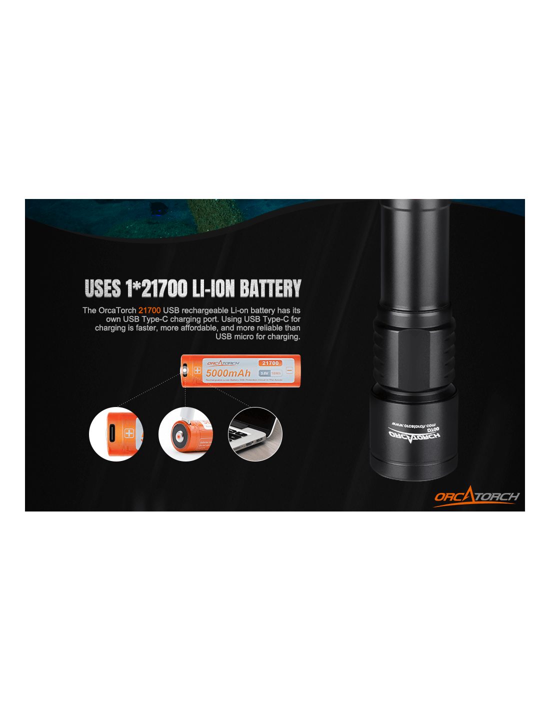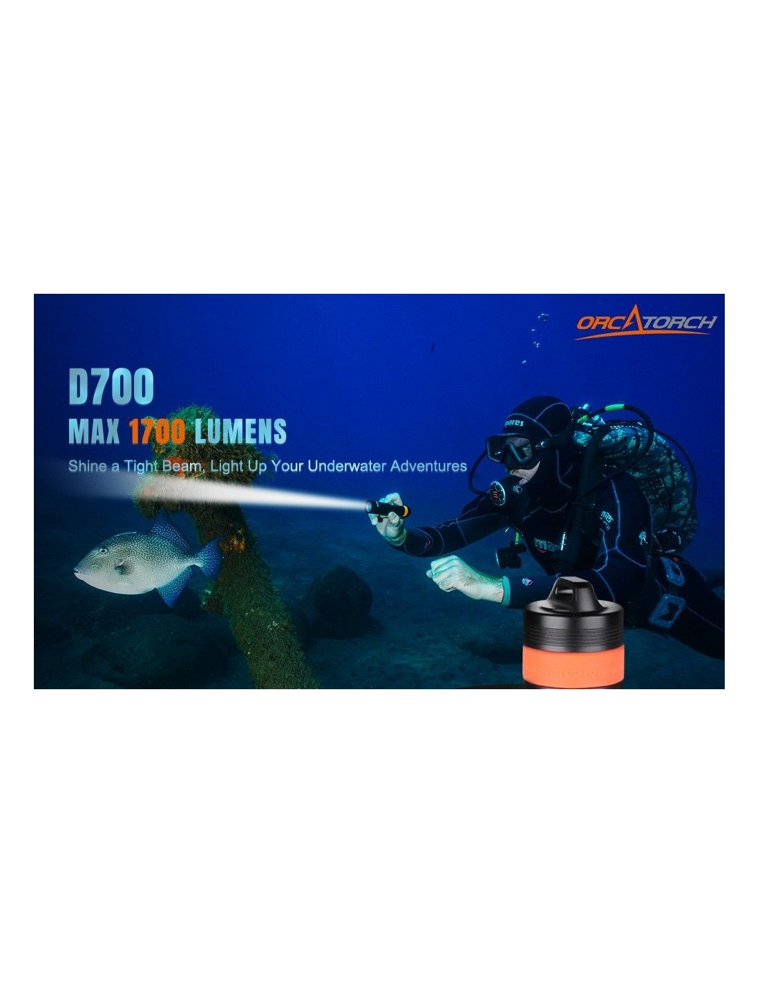 Turėdamas galingą maksimalų 1700 liumenų ryškumo lygį, „OrcaTorch D700“ nardymo žibintas apšvies jūsų povandeninius nuotykius, kuriems reikalingas ryškus spindulys, paprastas valdymas ir ilgas veikimo laikas. Jei esate iš tų narų, kurie renkasi paprastą, lengvai naudojamą įrangą, „OrcaTorch D700“ gali būti geriausias jūsų pasirinkimas. Prie jo pridedama viena „OrcaTorch 21700 5000 mAh“ įkraunama baterija su USB C tipo įkrovimo prievadu. Jis skleidžia siaurą ir sufokusuotą šviesos spindulį, puikiai tinkantį padėti naršyti tamsiausioje aplinkoje, įskaitant urvus ir laivų nuolaužas.