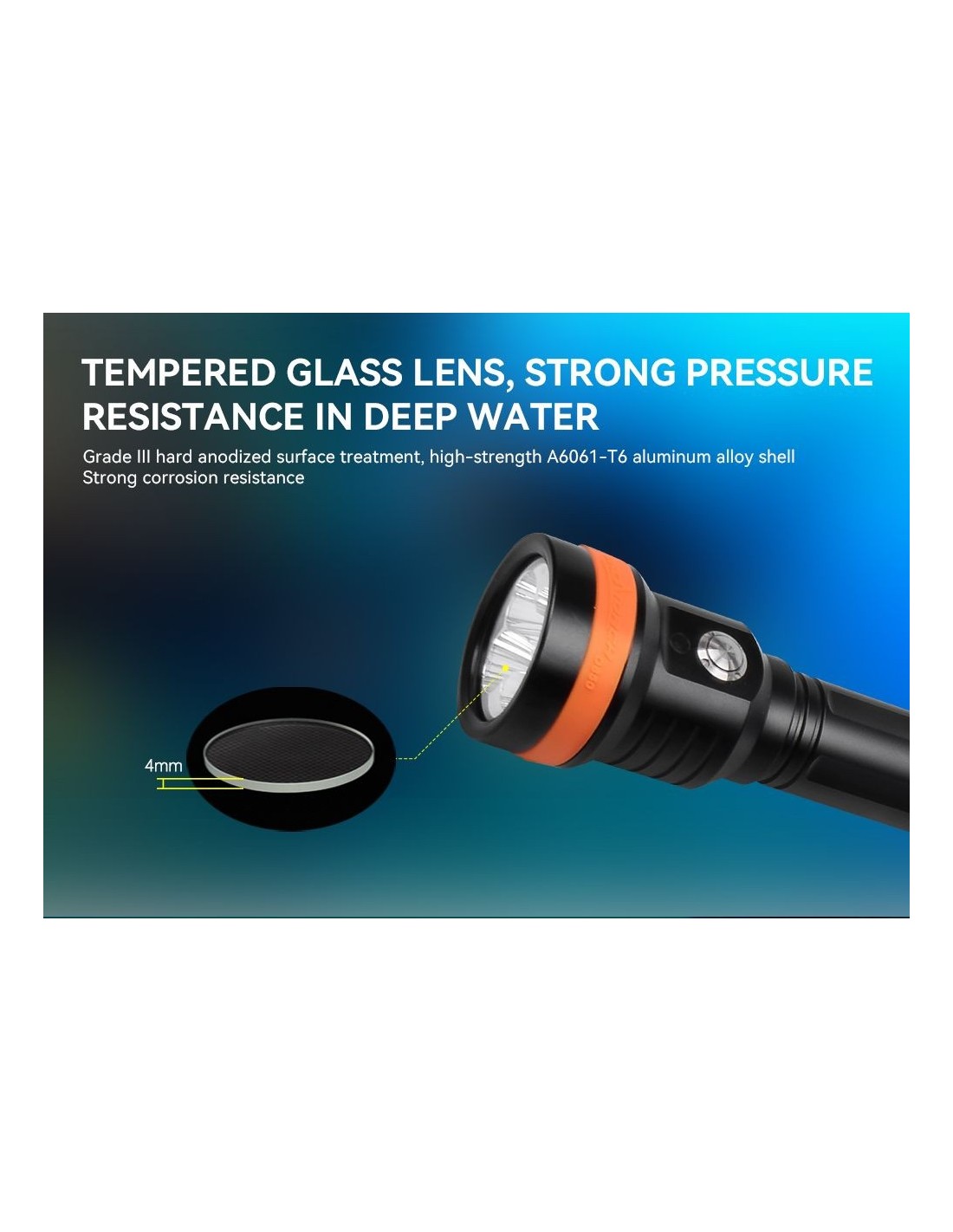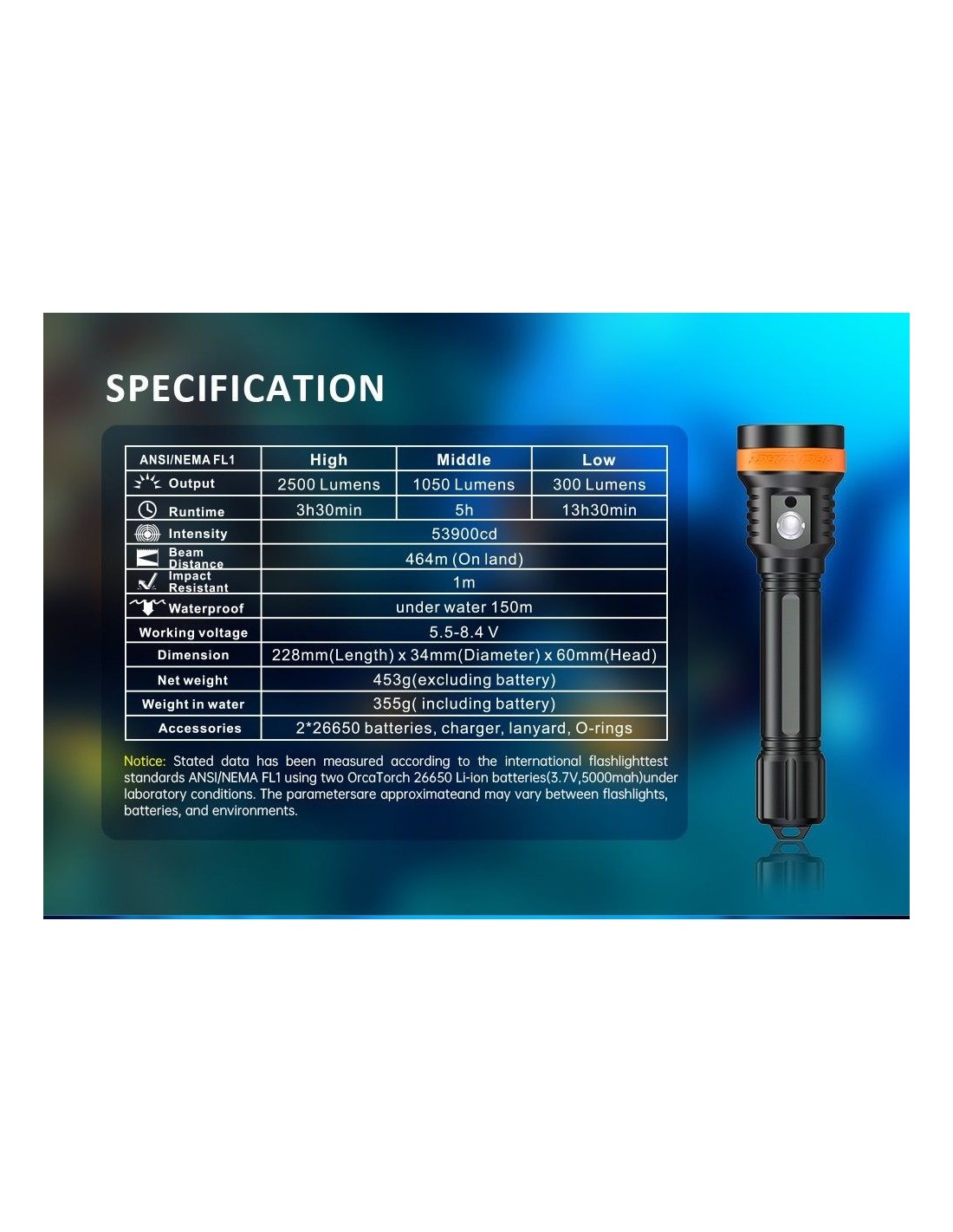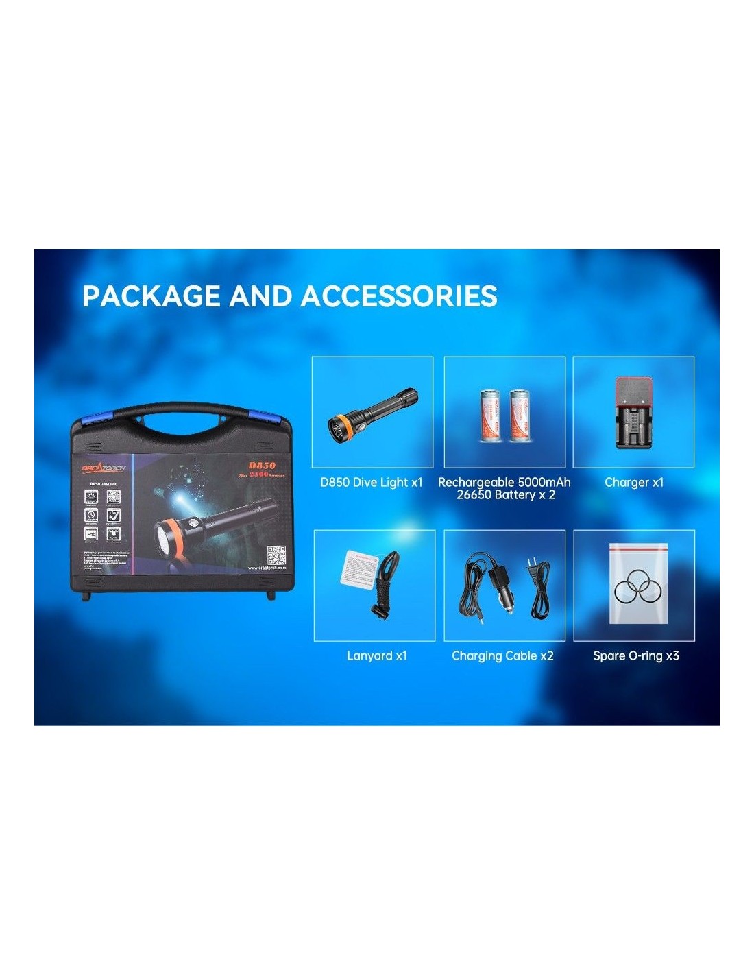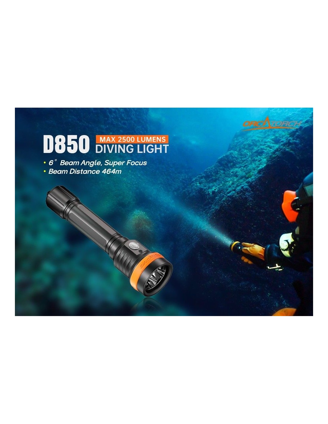 „OrcaTorch D850“ – tai nešiojamas nardymo žibintas, puikiai derinantis didelį šviesos srautą ir ilgą spindulio atstumą. Penki CREE šviesos diodai ir itin fokusuotas optinis dizainas užtikrina išskirtinį apšvietimą. Žibintas turi 3 apšvietimo režimus ir yra aprūpintas unikaliu „OrcaTorch“ titano lydinio šoniniu mygtuku, užtikrinančiu lengvą ir stabilų veikimą. Žibinto akumuliatoriaus indikatorius akimirksniu rodo likusį akumuliatoriaus veikimo laiką. Be to, unikali užrakinimo funkcija puikiai apsaugo nuo atsitiktinio naudojimo.