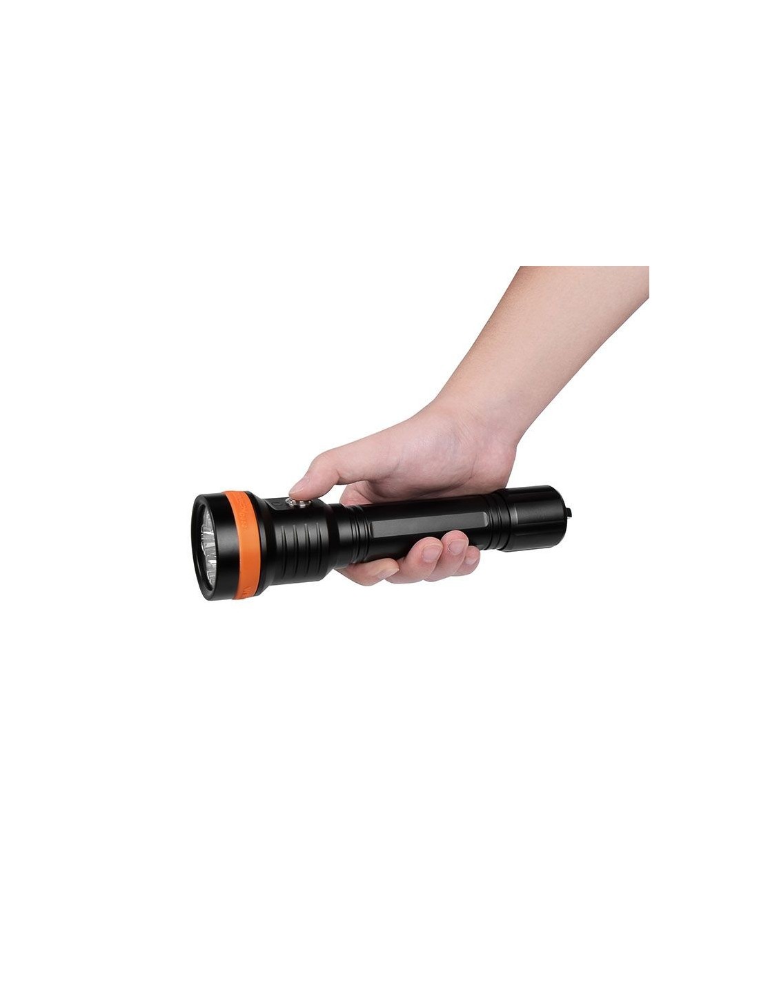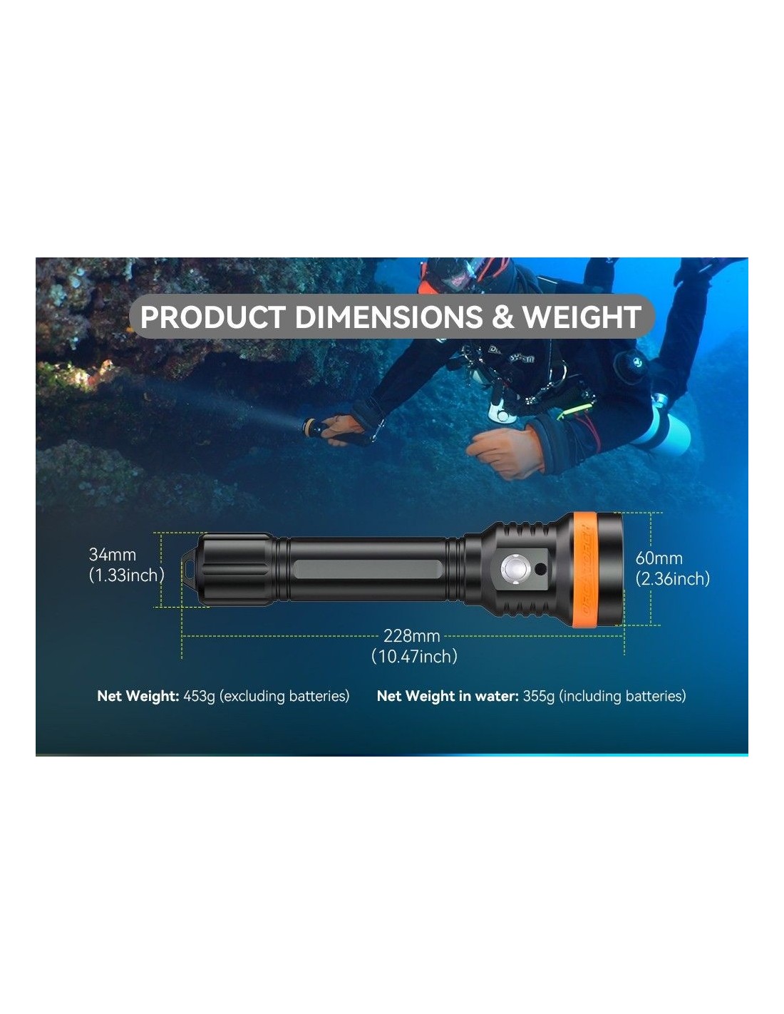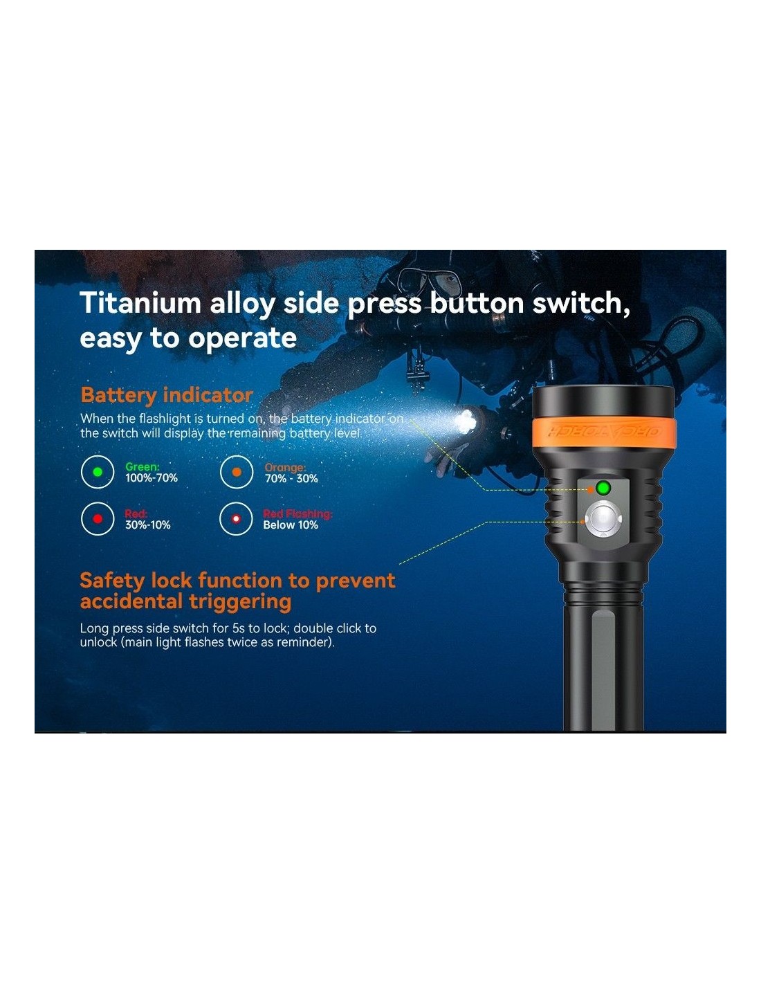 „OrcaTorch D850“ – tai nešiojamas nardymo žibintas, puikiai derinantis didelį šviesos srautą ir ilgą spindulio atstumą. Penki CREE šviesos diodai ir itin fokusuotas optinis dizainas užtikrina išskirtinį apšvietimą. Žibintas turi 3 apšvietimo režimus ir yra aprūpintas unikaliu „OrcaTorch“ titano lydinio šoniniu mygtuku, užtikrinančiu lengvą ir stabilų veikimą. Žibinto akumuliatoriaus indikatorius akimirksniu rodo likusį akumuliatoriaus veikimo laiką. Be to, unikali užrakinimo funkcija puikiai apsaugo nuo atsitiktinio naudojimo.