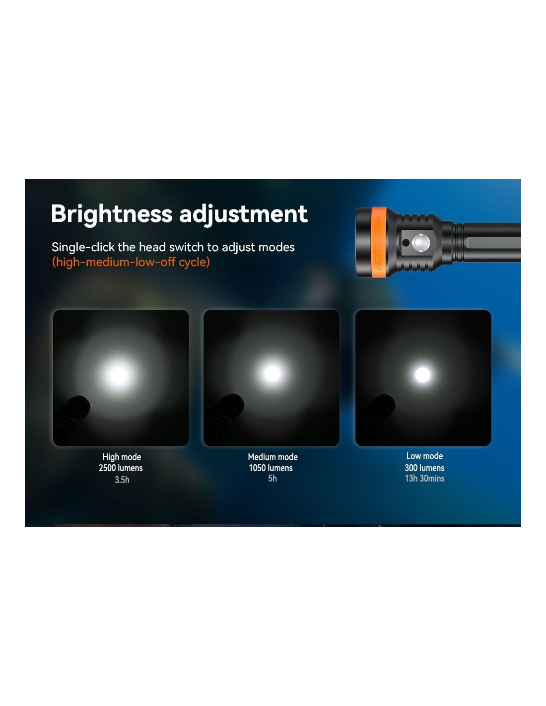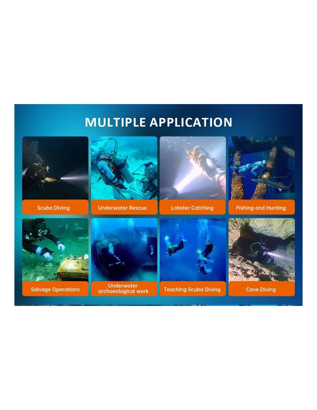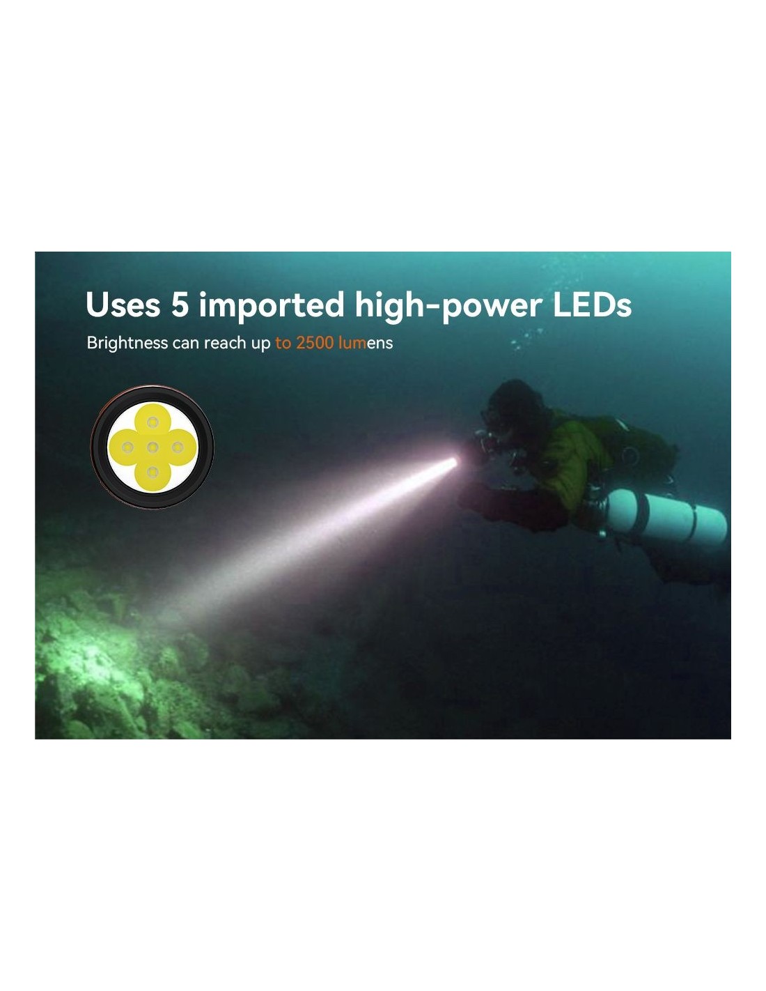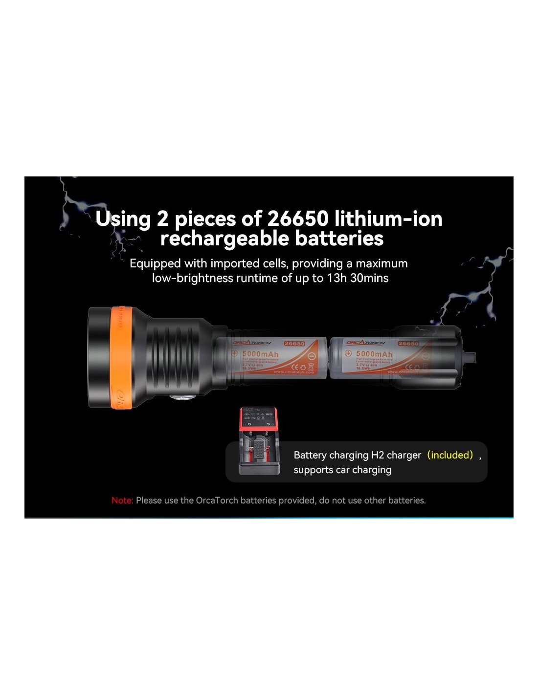„OrcaTorch D850“ – tai nešiojamas nardymo žibintas, puikiai derinantis didelį šviesos srautą ir ilgą spindulio atstumą. Penki CREE šviesos diodai ir itin fokusuotas optinis dizainas užtikrina išskirtinį apšvietimą. Žibintas turi 3 apšvietimo režimus ir yra aprūpintas unikaliu „OrcaTorch“ titano lydinio šoniniu mygtuku, užtikrinančiu lengvą ir stabilų veikimą. Žibinto akumuliatoriaus indikatorius akimirksniu rodo likusį akumuliatoriaus veikimo laiką. Be to, unikali užrakinimo funkcija puikiai apsaugo nuo atsitiktinio naudojimo.
