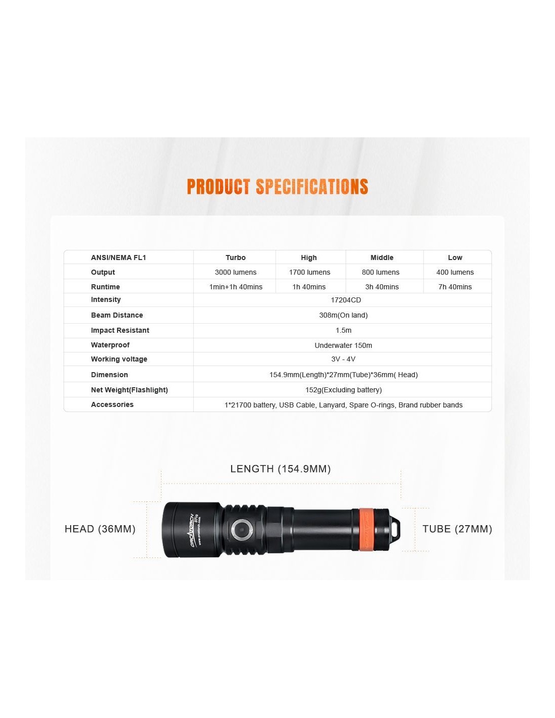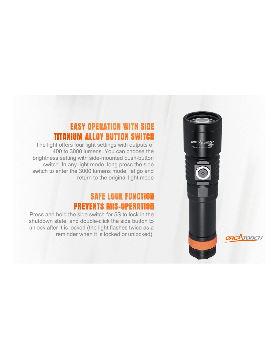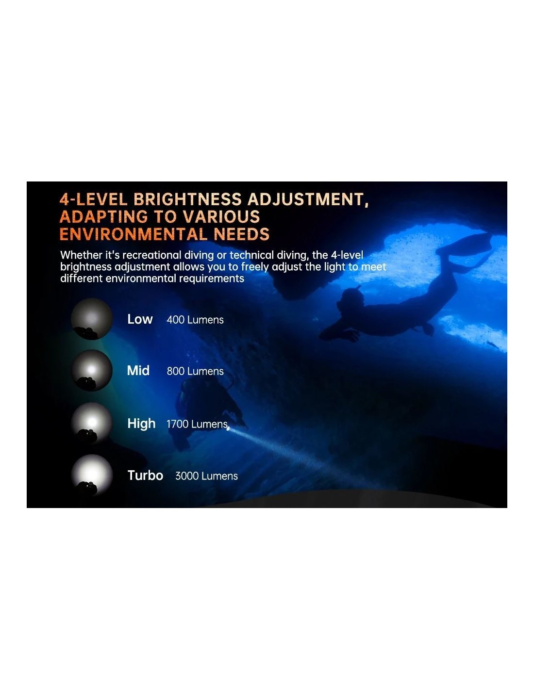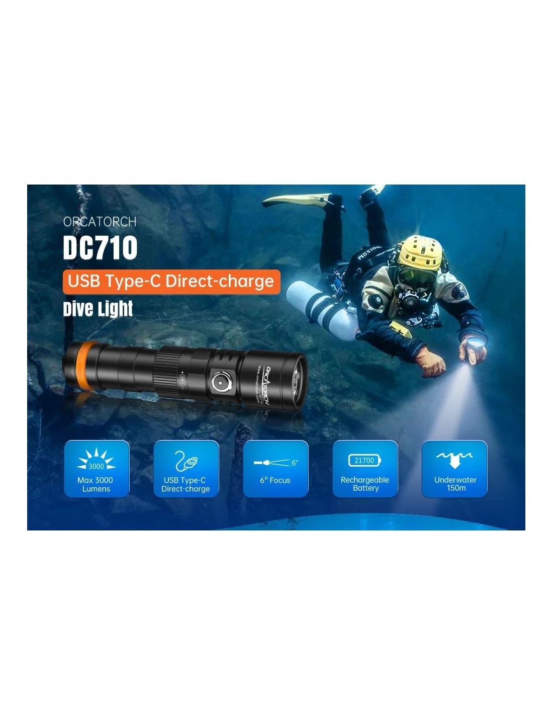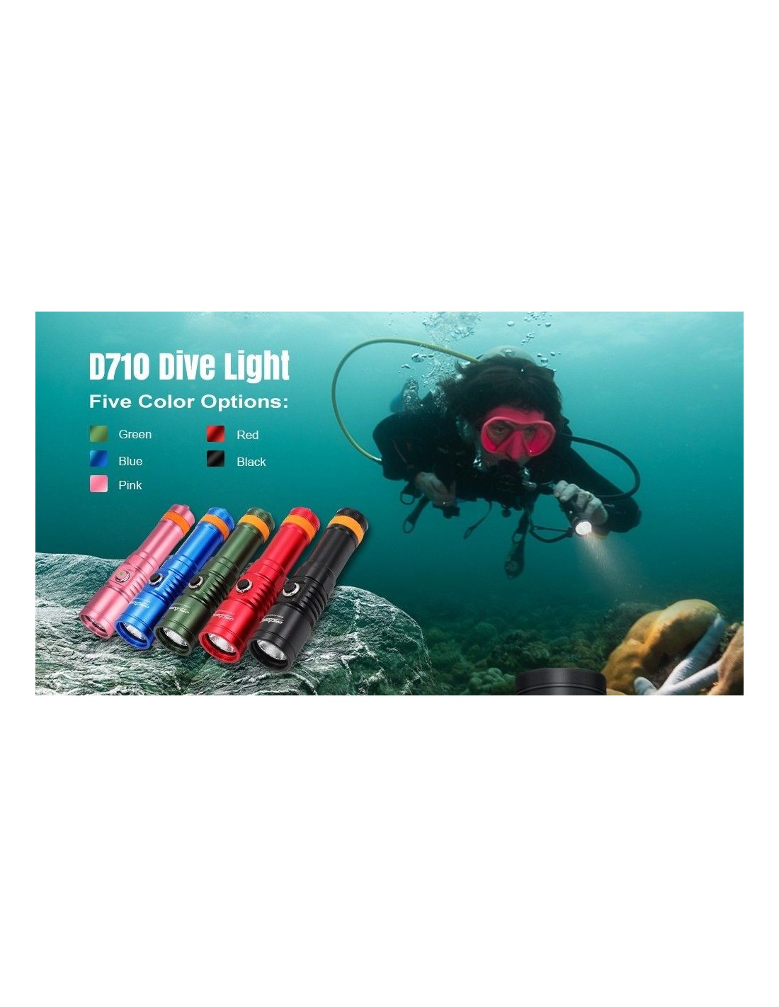 Nesvarbu, ar esate mėgėjas, ar profesionalus naras, „OrcaTorch D710“ nardymo žibintas pravers jūsų povandeninėje veikloje. Turėdamas maksimalų 3000 liumenų srautą, „D710“ yra vienas galingiausių žibintuvėlių savo klasėje. Tačiau jei norite mažesnės galios, galite rinktis iš daugybės ryškumo nustatymų. Jis veikia su viena „OrcaTorch 21700 5000 mAh“ įkraunama baterija su C tipo įkrovimo prievadu, todėl jį lengviau įkrauti bet kur. Dabar jis siūlomas su keturiomis išorinėmis spalvų parinktimis: juoda, žalia, raudona ir mėlyna, kad patenkintų įvairius jūsų poreikius.