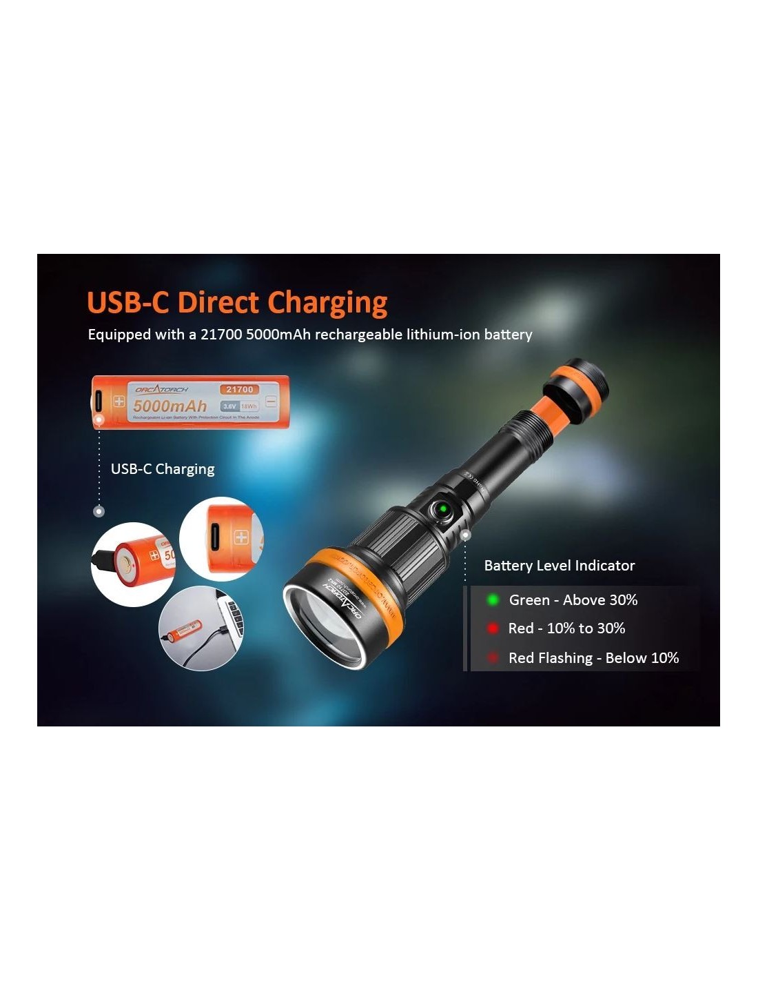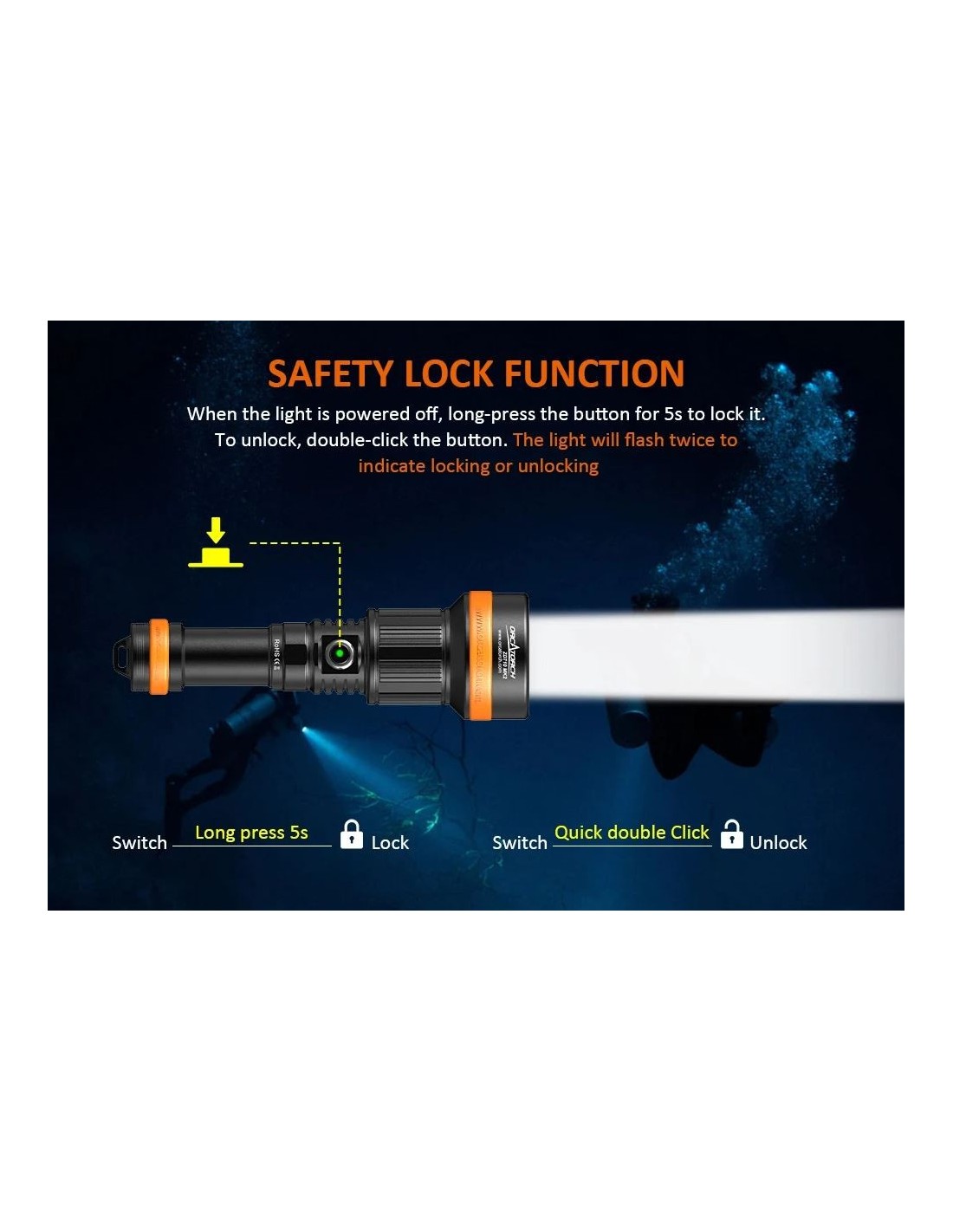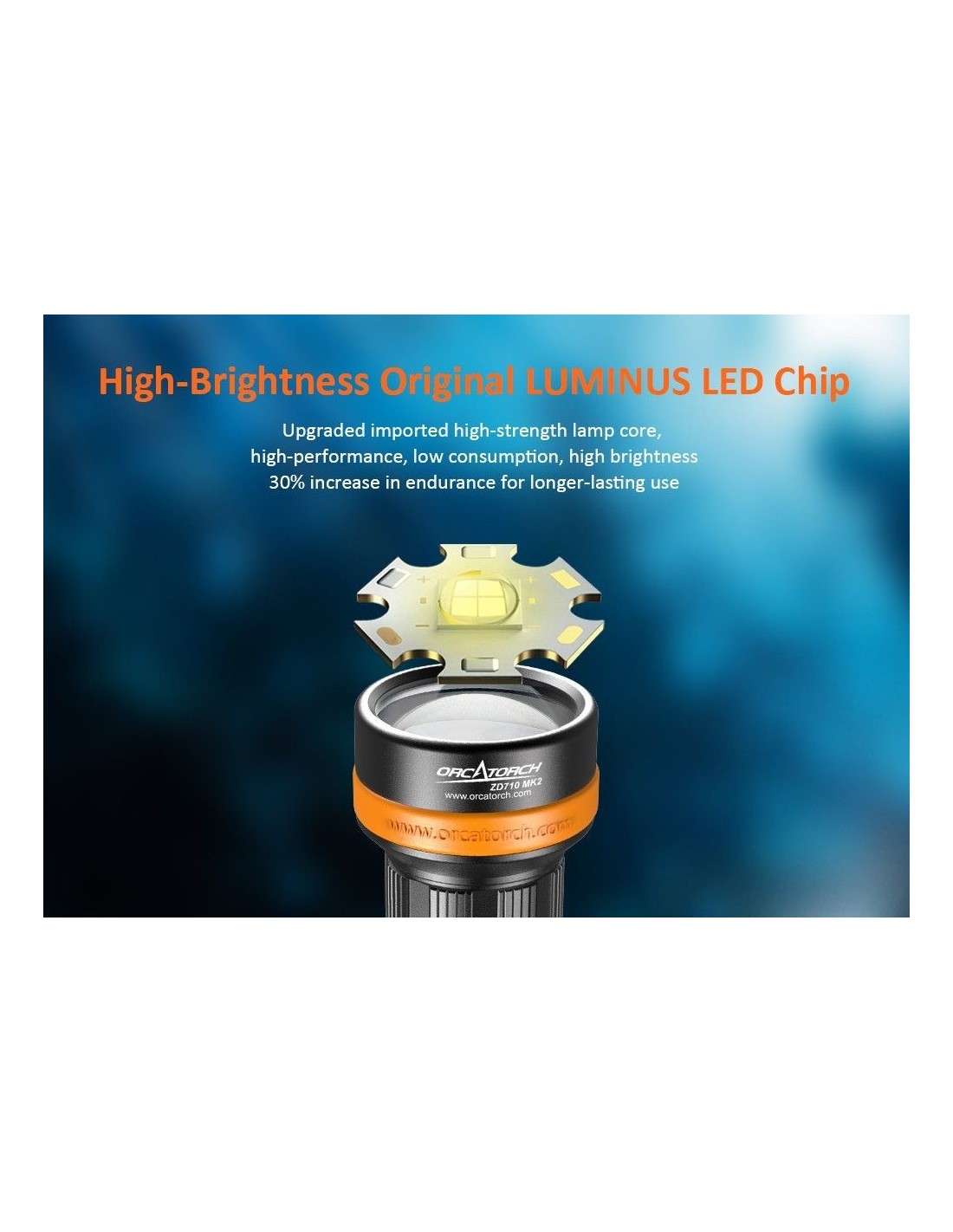 „OrcaTorch ZD710 MK2“ – tai universalus povandeninis nardymo žibintas su reguliuojamu spindulio kampu, maksimaliu 212500 cd spindulio intensyvumu ir 920 metrų spindulio atstumu. Reguliuojamas spindulio kampas (nuo 4° iki 72°) suteikia lankstumo įvairiems povandeninio apšvietimo poreikiams, nesvarbu, ar tyrinėjate urvus, stebite jūros gyvūniją, fotografuojate povandeninę fotografiją ir kt. „ZD710 MK2“ turi 5000 mAh 21700 USB-C įkraunamą bateriją patogiam įkrovimui. Jis turi saugaus užrakinimo funkciją, apsaugančią nuo atsitiktinio įjungimo, todėl tai idealus nardymo žibintas iki 150 metrų gylyje, galintis prisitaikyti prie įvairios povandeninės aplinkos.