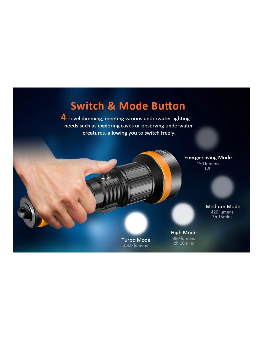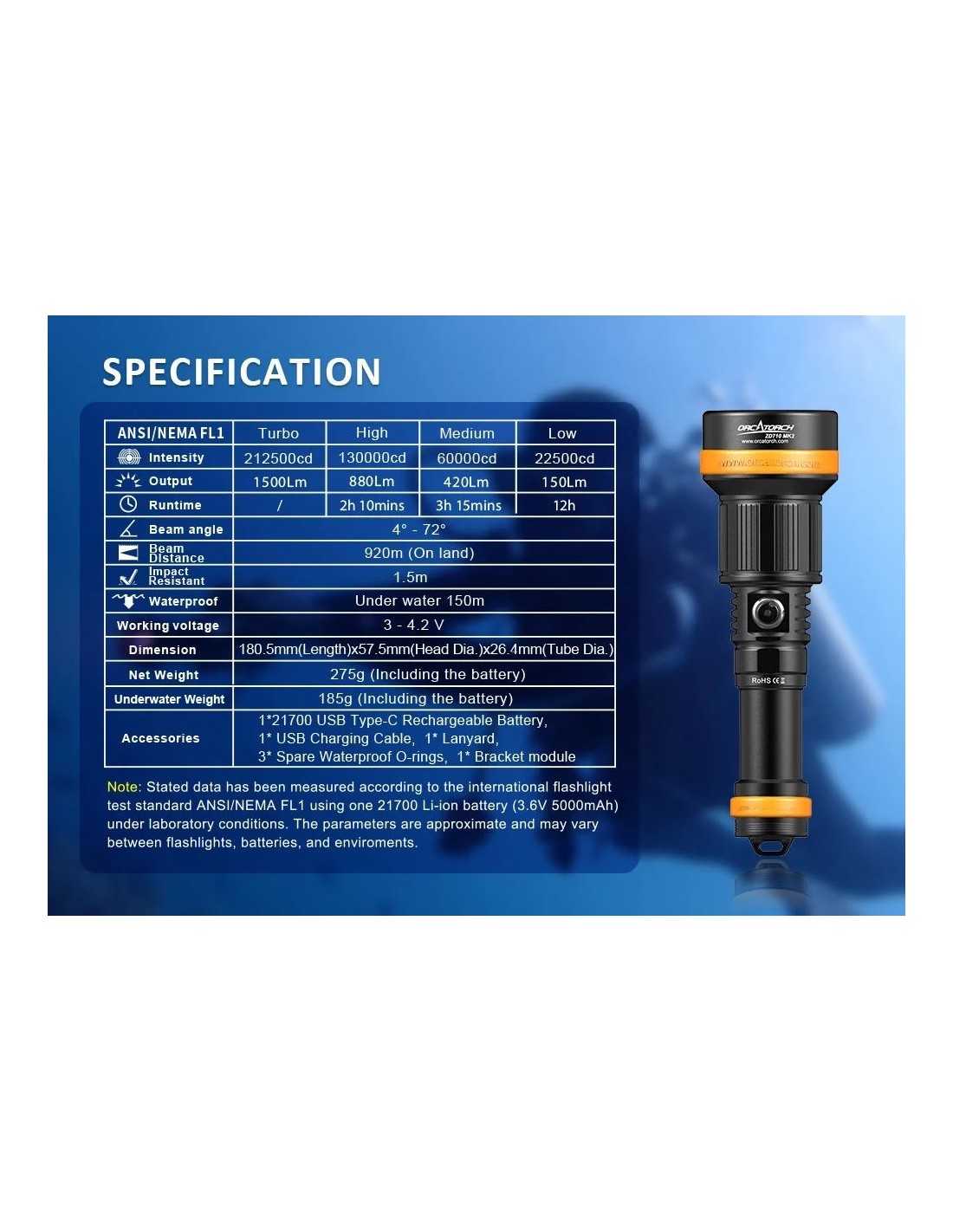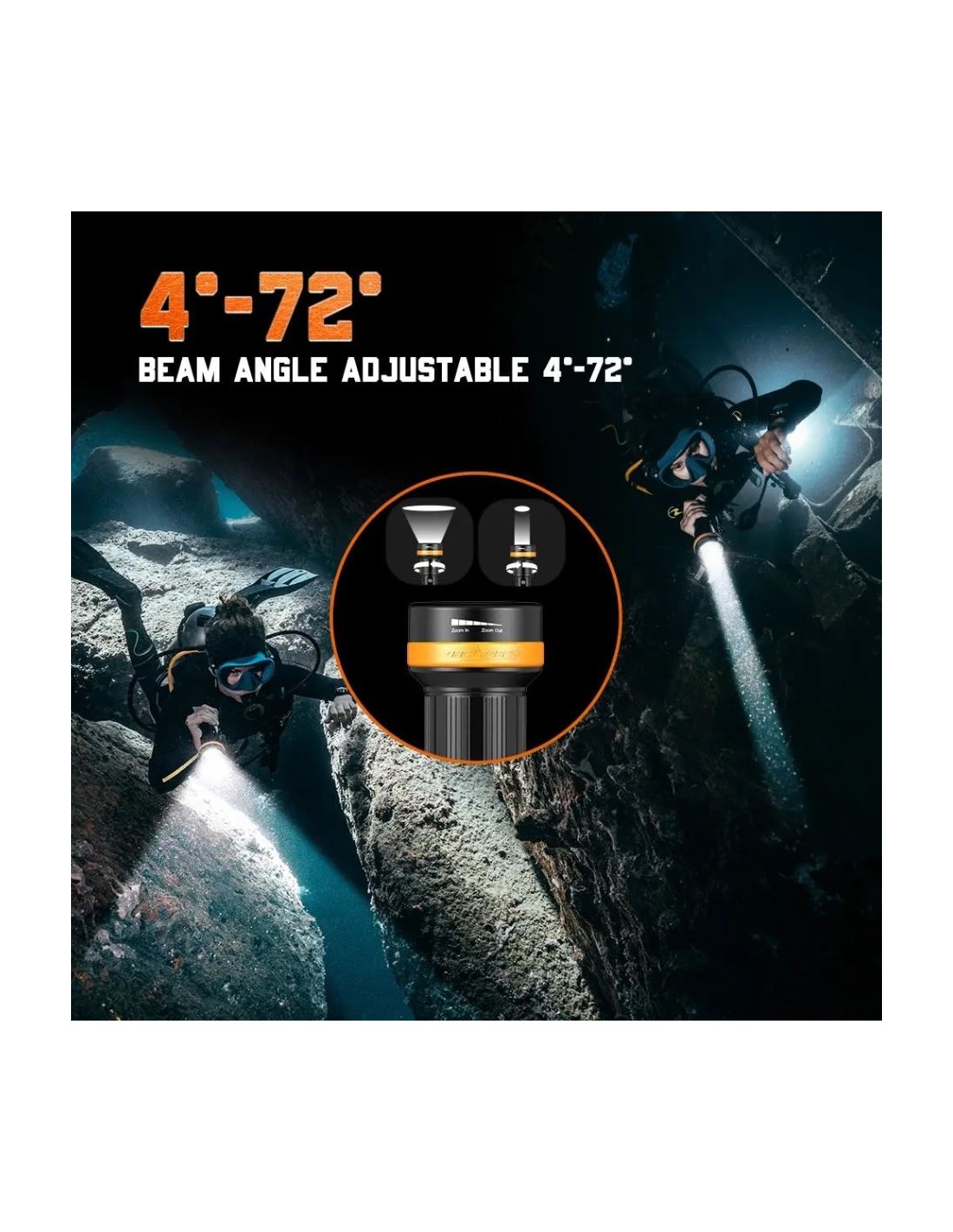 „OrcaTorch ZD710 MK2“ – tai universalus povandeninis nardymo žibintas su reguliuojamu spindulio kampu, maksimaliu 212500 cd spindulio intensyvumu ir 920 metrų spindulio atstumu. Reguliuojamas spindulio kampas (nuo 4° iki 72°) suteikia lankstumo įvairiems povandeninio apšvietimo poreikiams, nesvarbu, ar tyrinėjate urvus, stebite jūros gyvūniją, fotografuojate povandeninę fotografiją ir kt. „ZD710 MK2“ turi 5000 mAh 21700 USB-C įkraunamą bateriją patogiam įkrovimui. Jis turi saugaus užrakinimo funkciją, apsaugančią nuo atsitiktinio įjungimo, todėl tai idealus nardymo žibintas iki 150 metrų gylyje, galintis prisitaikyti prie įvairios povandeninės aplinkos.