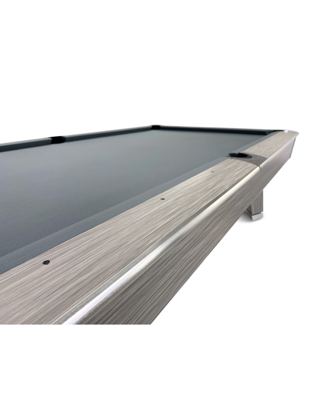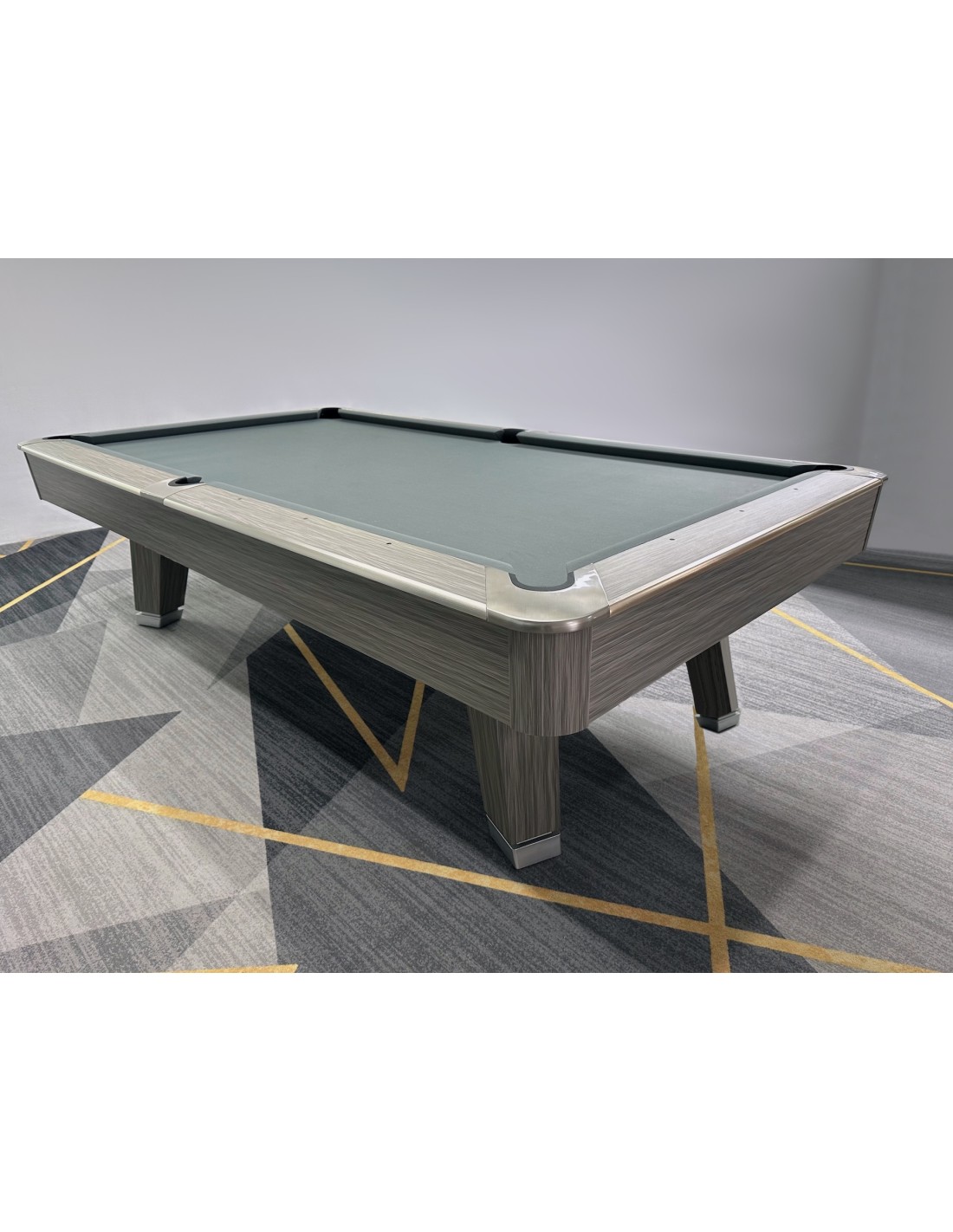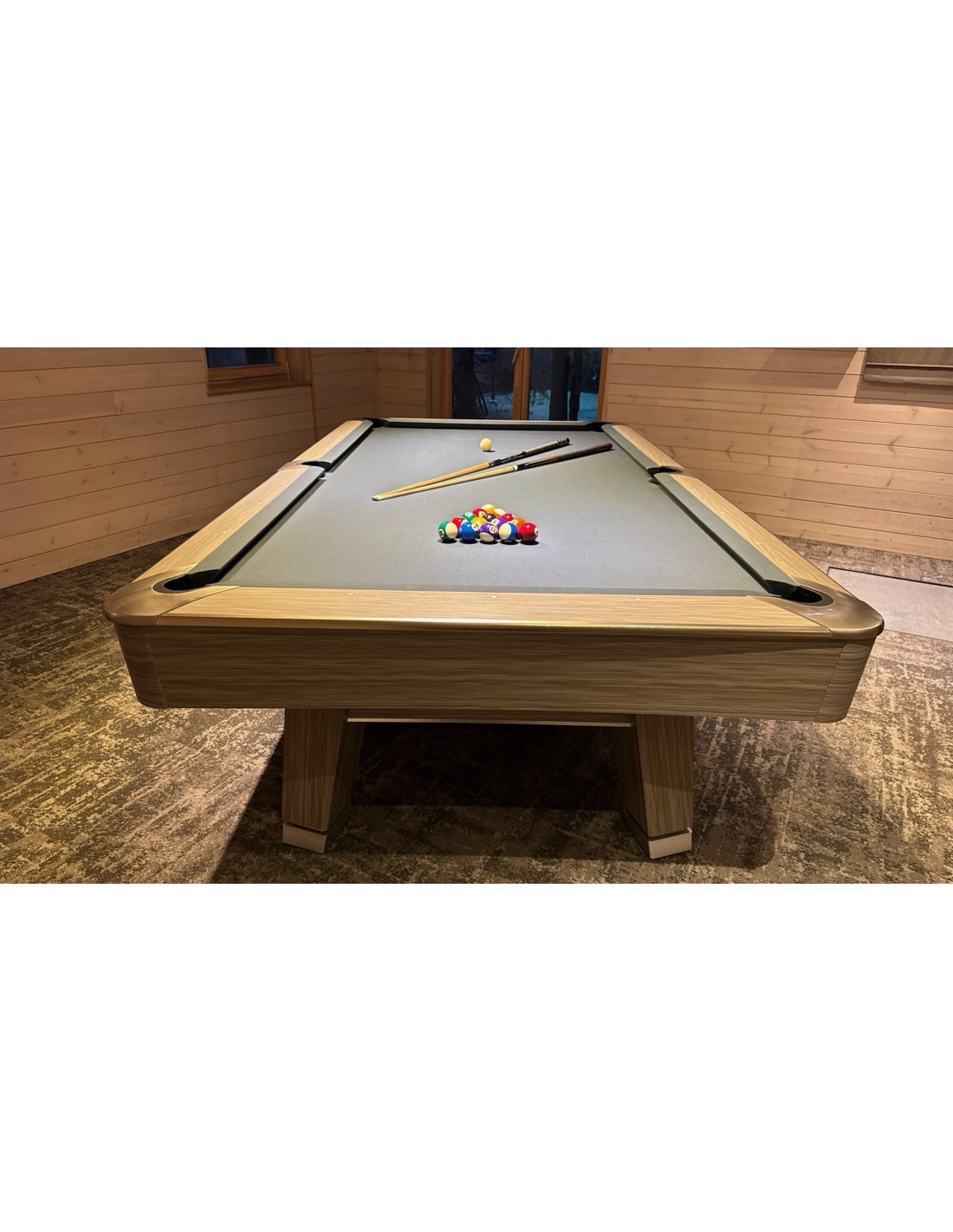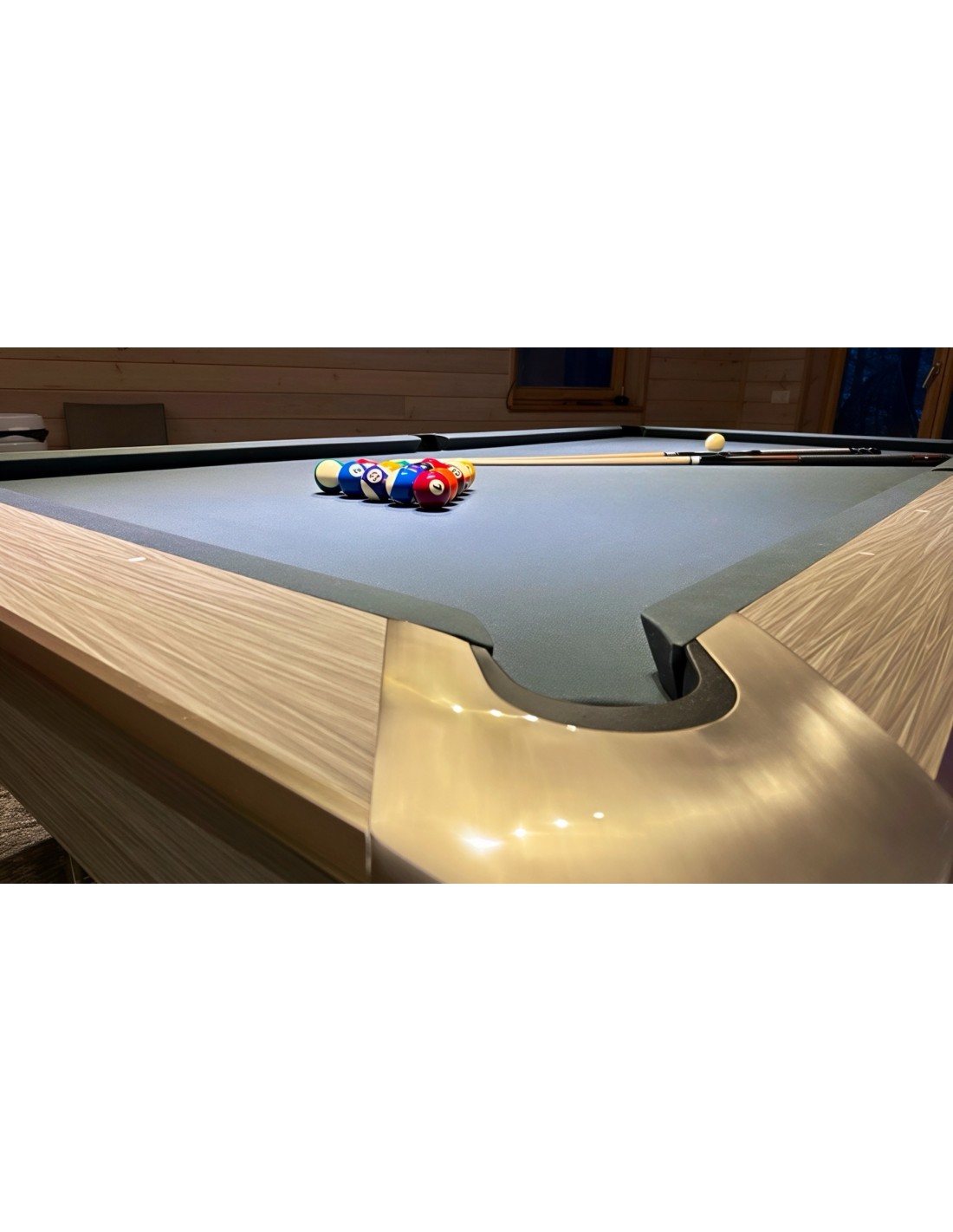 Stalo kojos formuojamos kaip pedestalo tipo konstrukcija, imituojanti raidę „A“, suteikianti modernų ir unikalų stilių. Žaidimo aikštelė pagaminta iš 3 dalių 25 mm akmens, tiksliai šlifuota, užtikrinanti optimalų svajonių kamuoliuko riedėjimą ir stabilumą. Tvirta konstrukcija su plieninėmis bei medinėmis atramomis palaiko pastovų stabilumą intensyviai žaidžiant. Bortai pagaminti iš HPL su medžio lukšto apdaila, dekoruoti aliuminio detalėmis, derančiomis prie viso stalo dizaino. Bortų sistema – K55 profilio gumos, užtikrinanti profesionalų atšokimą. Žaidimo aikštelė 254 × 127 cm. Komplekte: profesionalus pilkos spakvos audinys (galimi įvairūs audinio spalvos variantai)