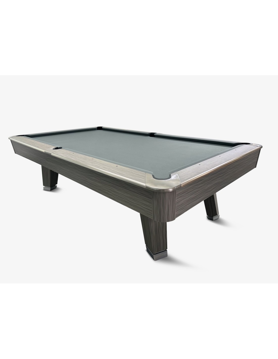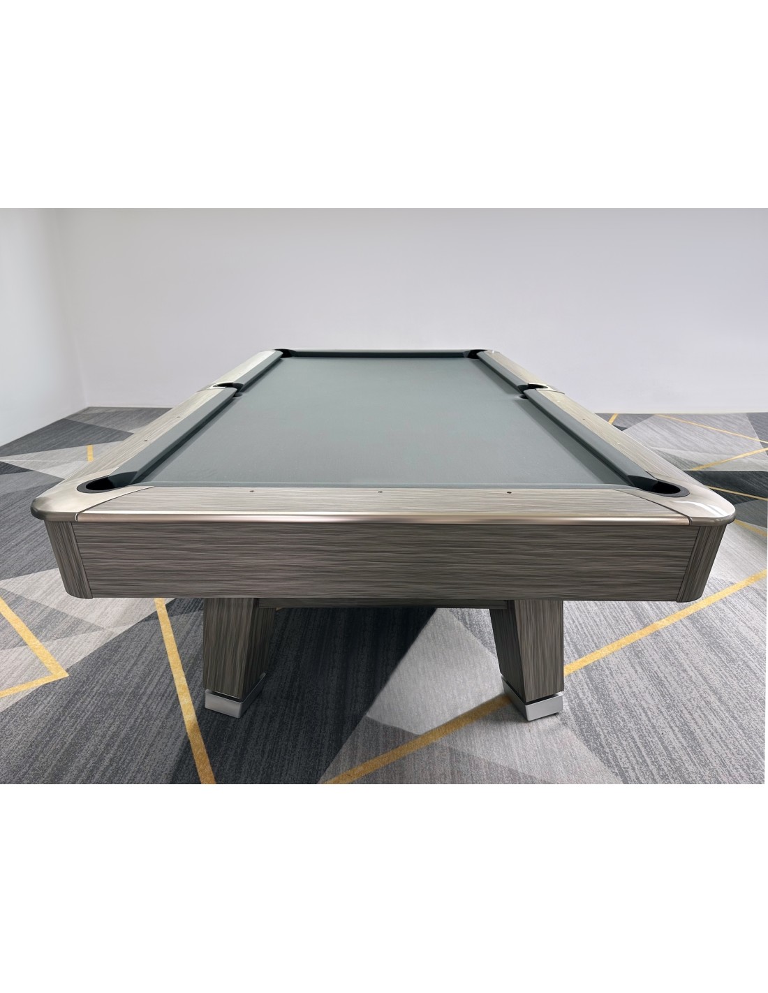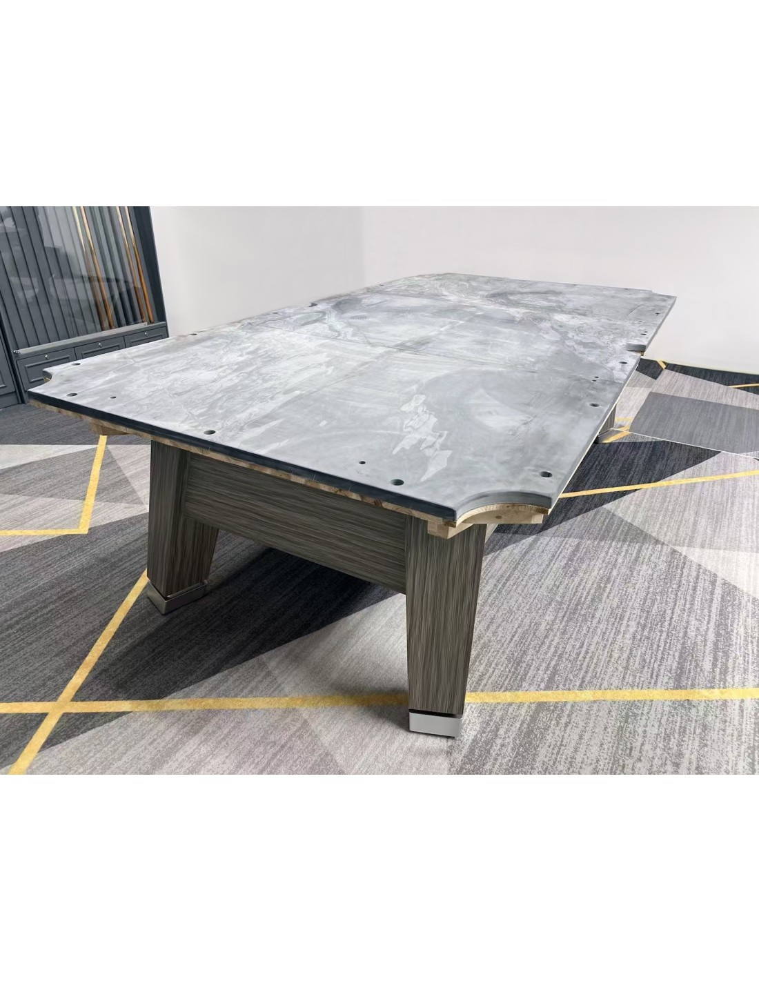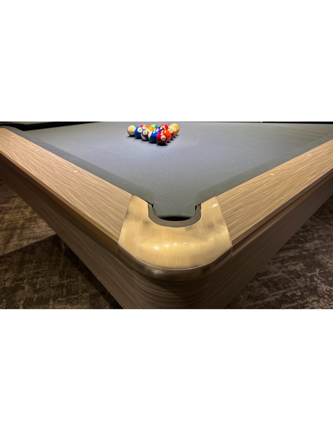 Stalo kojos formuojamos kaip pedestalo tipo konstrukcija, imituojanti raidę „A“, suteikianti modernų ir unikalų stilių. Žaidimo aikštelė pagaminta iš 3 dalių 25 mm akmens, tiksliai šlifuota, užtikrinanti optimalų svajonių kamuoliuko riedėjimą ir stabilumą. Tvirta konstrukcija su plieninėmis bei medinėmis atramomis palaiko pastovų stabilumą intensyviai žaidžiant. Bortai pagaminti iš HPL su medžio lukšto apdaila, dekoruoti aliuminio detalėmis, derančiomis prie viso stalo dizaino. Bortų sistema – K55 profilio gumos, užtikrinanti profesionalų atšokimą. Žaidimo aikštelė 254 × 127 cm. Komplekte: profesionalus pilkos spakvos audinys (galimi įvairūs audinio spalvos variantai)