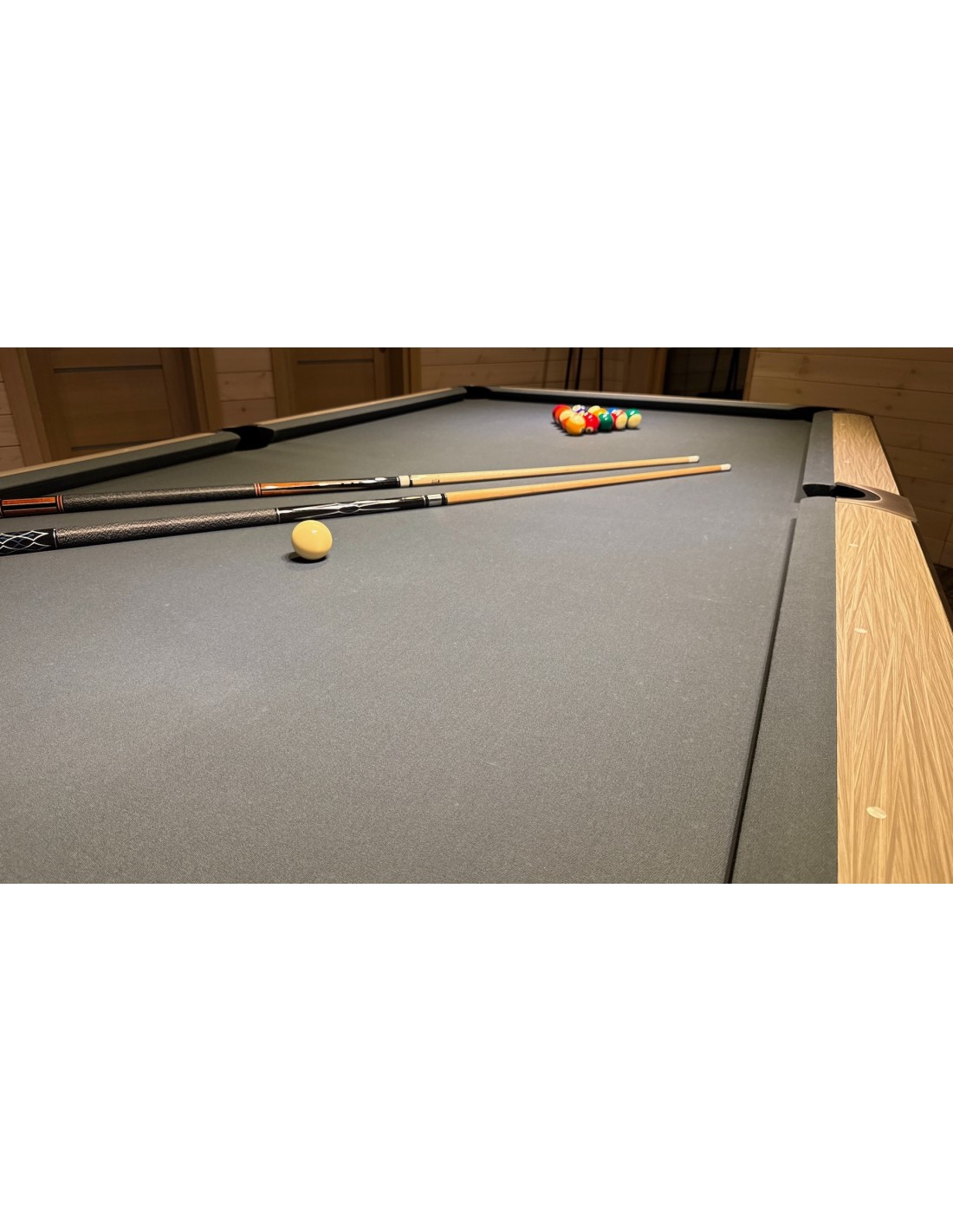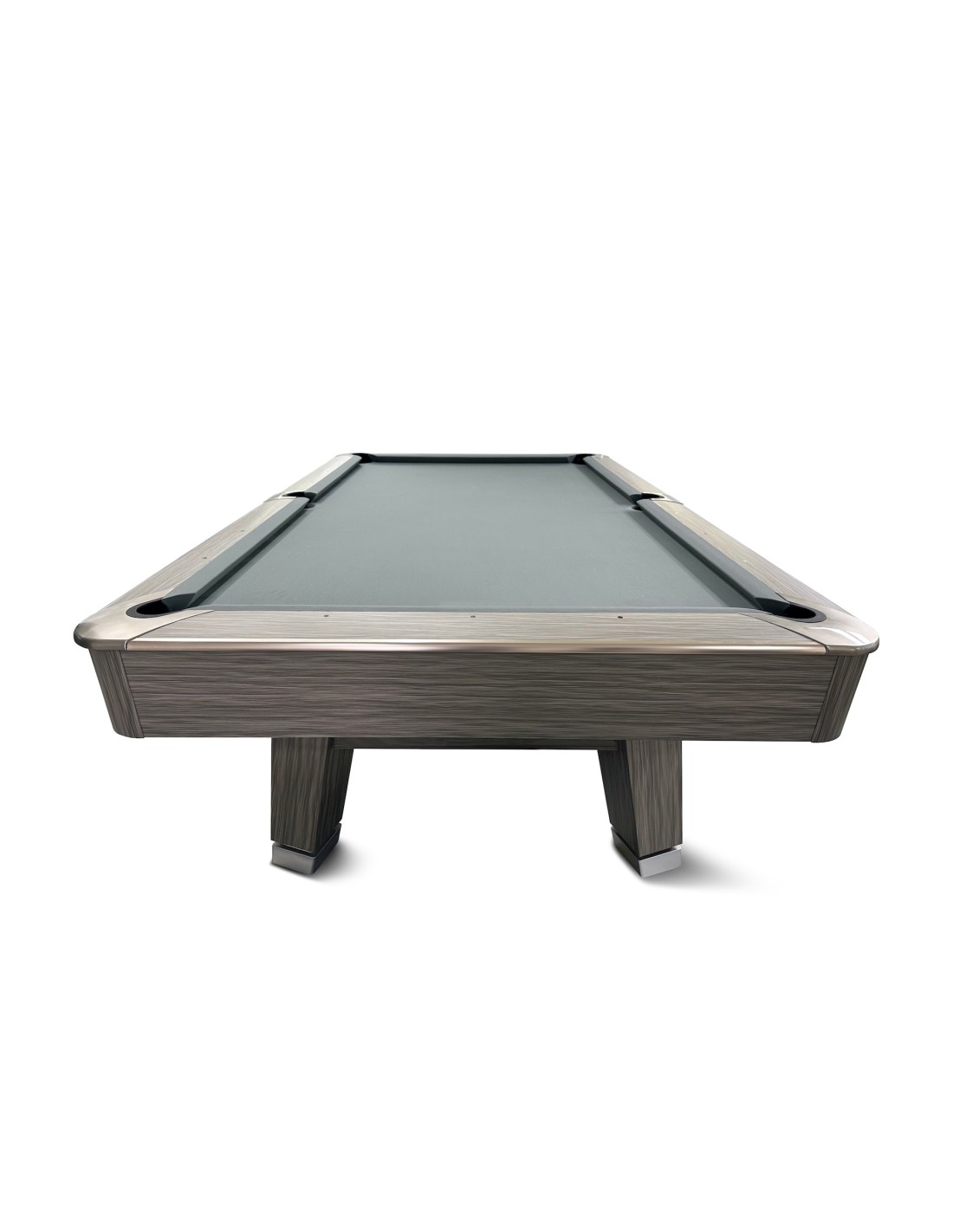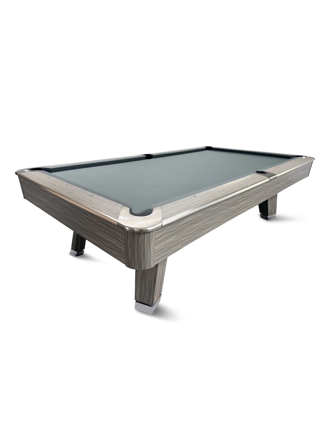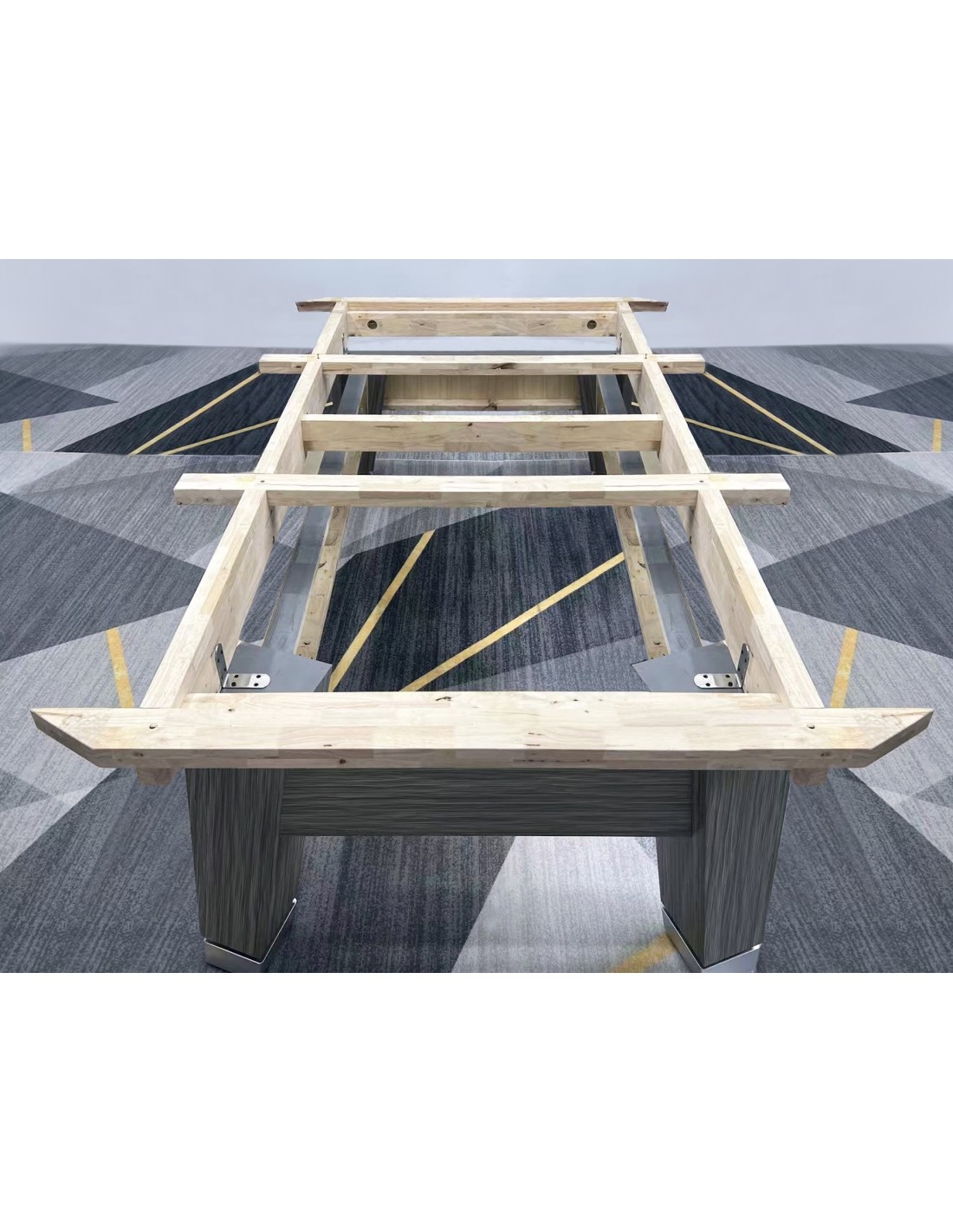 Stalo kojos formuojamos kaip pedestalo tipo konstrukcija, imituojanti raidę „A“, suteikianti modernų ir unikalų stilių. Žaidimo aikštelė pagaminta iš 3 dalių 25 mm akmens, tiksliai šlifuota, užtikrinanti optimalų svajonių kamuoliuko riedėjimą ir stabilumą. Tvirta konstrukcija su plieninėmis bei medinėmis atramomis palaiko pastovų stabilumą intensyviai žaidžiant. Bortai pagaminti iš HPL su medžio lukšto apdaila, dekoruoti aliuminio detalėmis, derančiomis prie viso stalo dizaino. Bortų sistema – K55 profilio gumos, užtikrinanti profesionalų atšokimą. Žaidimo aikštelė 254 × 127 cm. Komplekte: profesionalus pilkos spakvos audinys (galimi įvairūs audinio spalvos variantai)