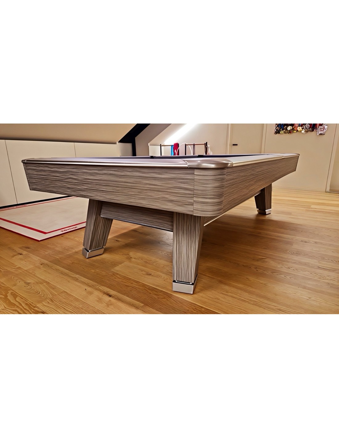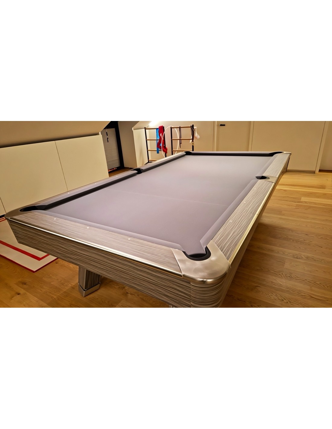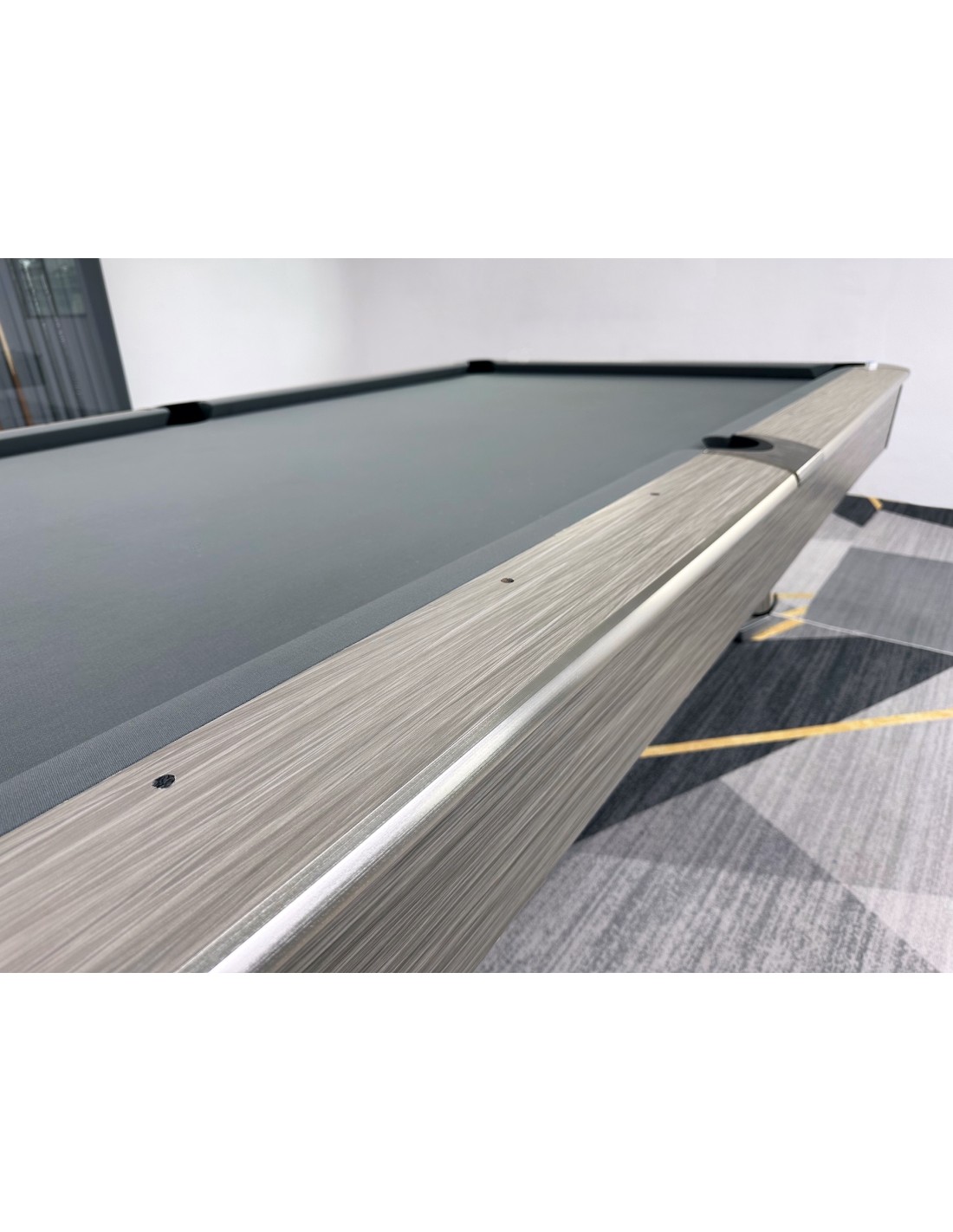 HPL ir aliuminio bortai Bortai pagaminti iš aukštos kokybės HPL su prabangia medžio faneruotės apdaila, kuri užtikrina išskirtinį patvarumą. Aliuminio lydinio juostos idealiai dera prie dizaino, suteikia modernumo bei apsaugo bortus nuo įbrėžimų. Patobulintos guminės pagalvėlės Naudojamos K55 profilio gumos, pasižymi itin tiksliu rutulio atšokimu. Tai profesionalams pritaikytos savybės, kurias ypač vertina reiklus žaidėjai ir turnyrų dalyviai. Profesionali žaidimo patirtis Stalas aprūpintas aukščiausios kokybės skalūno plokšte, suteikiančia visiškai lygų žaidimo paviršių. Stabili konstrukcija, sustiprinti rėmai ir aukštos kokybės danga užtikrina sklandų bei preciziką žaidimą. Modernus dizainas Šiuolaikiškas, minimalistinis stiliaus sprendimas puikiai dera tiek privačiose erdvėse, tiek profesionaliuose klubuose. Neutralios spalvos ir prabangios apdailos detalės suteikia išskirtinumo bet kuriai aplinkai.