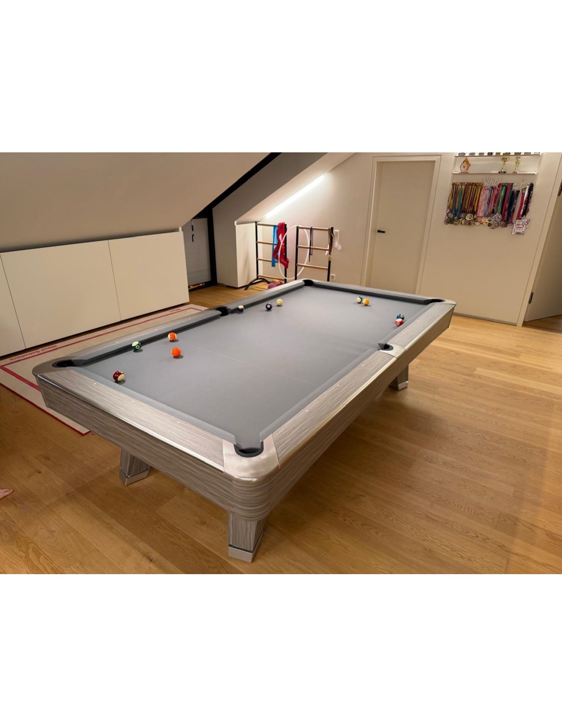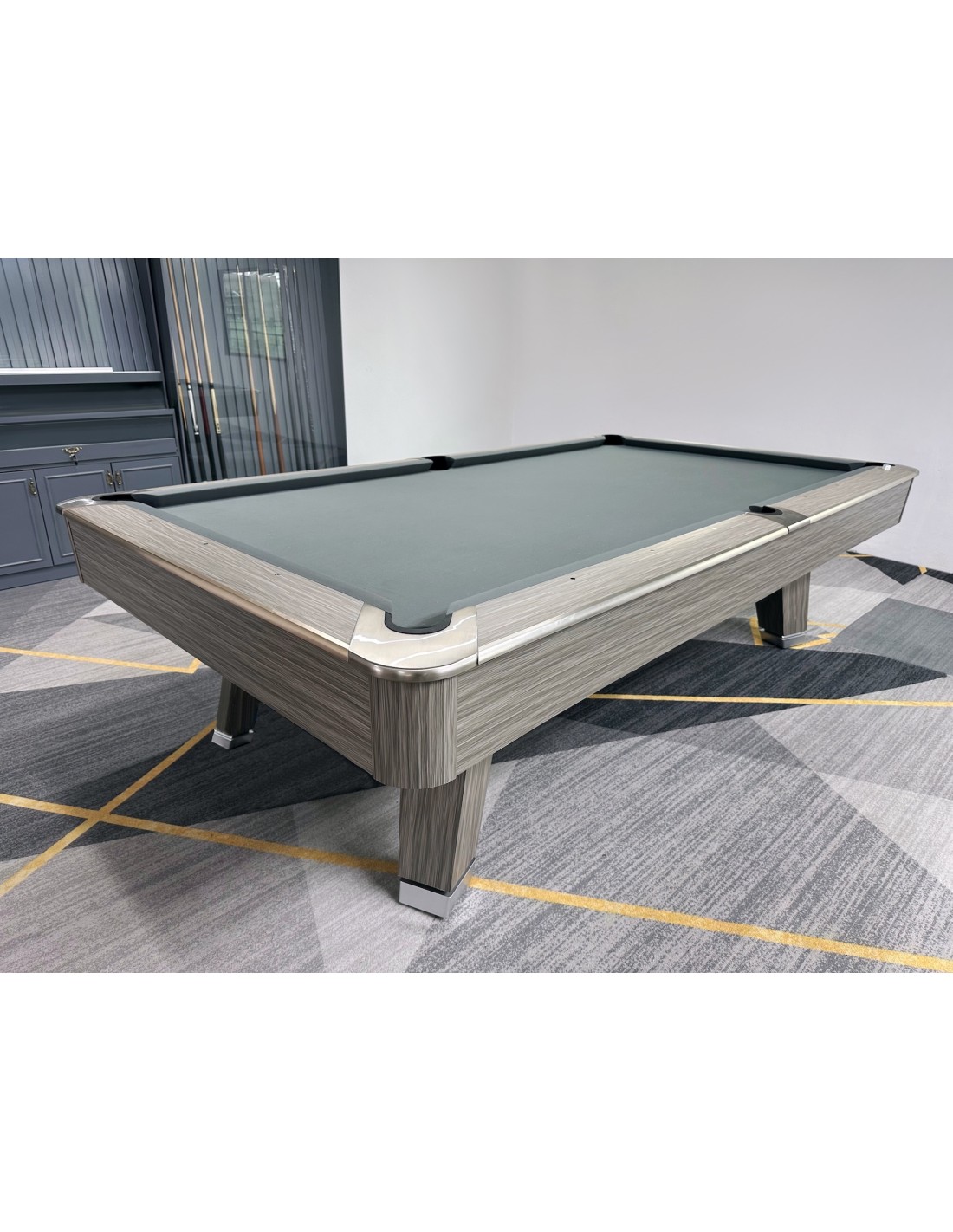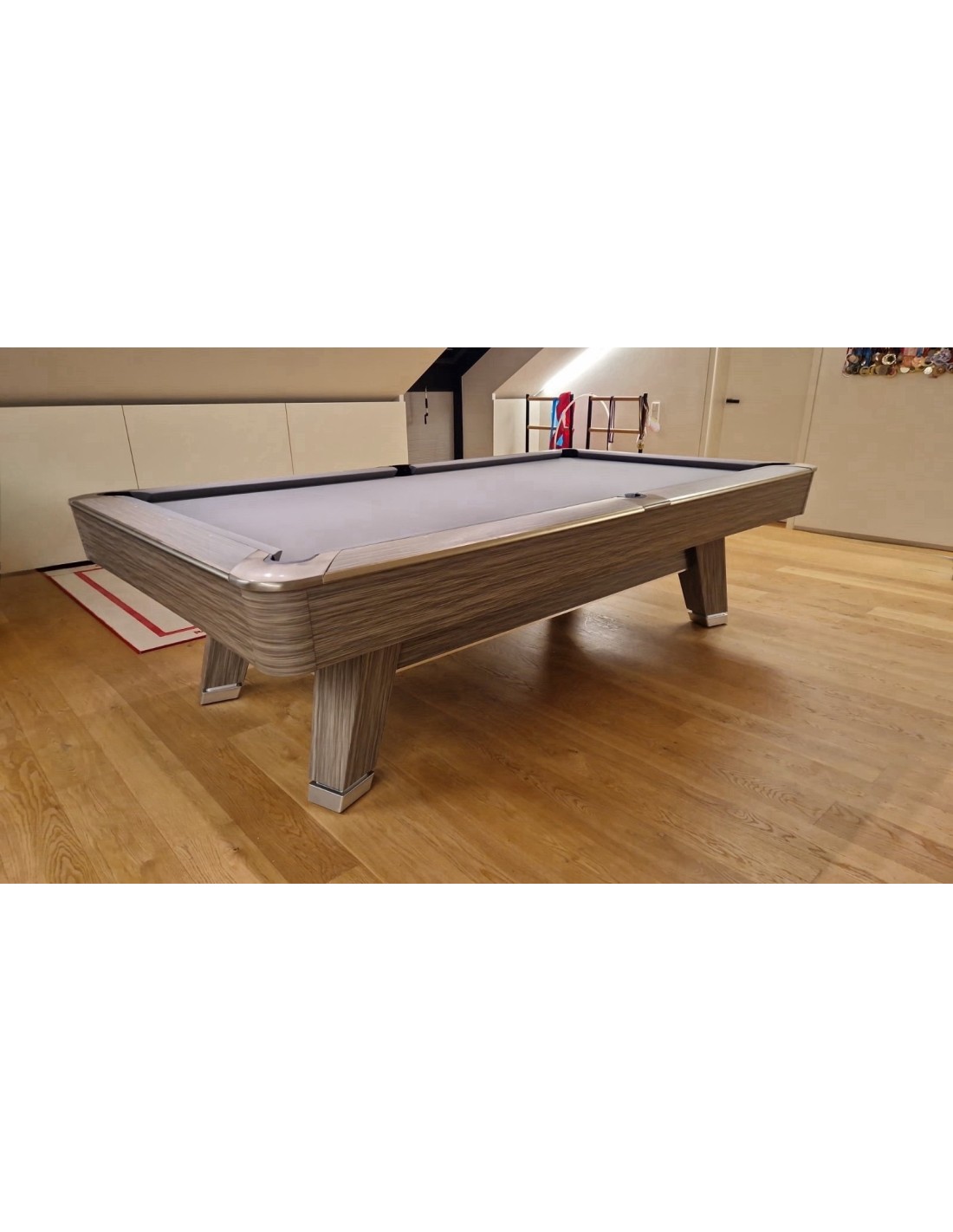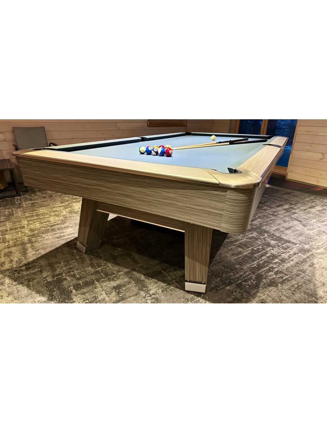 HPL ir aliuminio bortai Bortai pagaminti iš aukštos kokybės HPL su prabangia medžio faneruotės apdaila, kuri užtikrina išskirtinį patvarumą. Aliuminio lydinio juostos idealiai dera prie dizaino, suteikia modernumo bei apsaugo bortus nuo įbrėžimų. Patobulintos guminės pagalvėlės Naudojamos K55 profilio gumos, pasižymi itin tiksliu rutulio atšokimu. Tai profesionalams pritaikytos savybės, kurias ypač vertina reiklus žaidėjai ir turnyrų dalyviai. Profesionali žaidimo patirtis Stalas aprūpintas aukščiausios kokybės skalūno plokšte, suteikiančia visiškai lygų žaidimo paviršių. Stabili konstrukcija, sustiprinti rėmai ir aukštos kokybės danga užtikrina sklandų bei preciziką žaidimą. Modernus dizainas Šiuolaikiškas, minimalistinis stiliaus sprendimas puikiai dera tiek privačiose erdvėse, tiek profesionaliuose klubuose. Neutralios spalvos ir prabangios apdailos detalės suteikia išskirtinumo bet kuriai aplinkai.