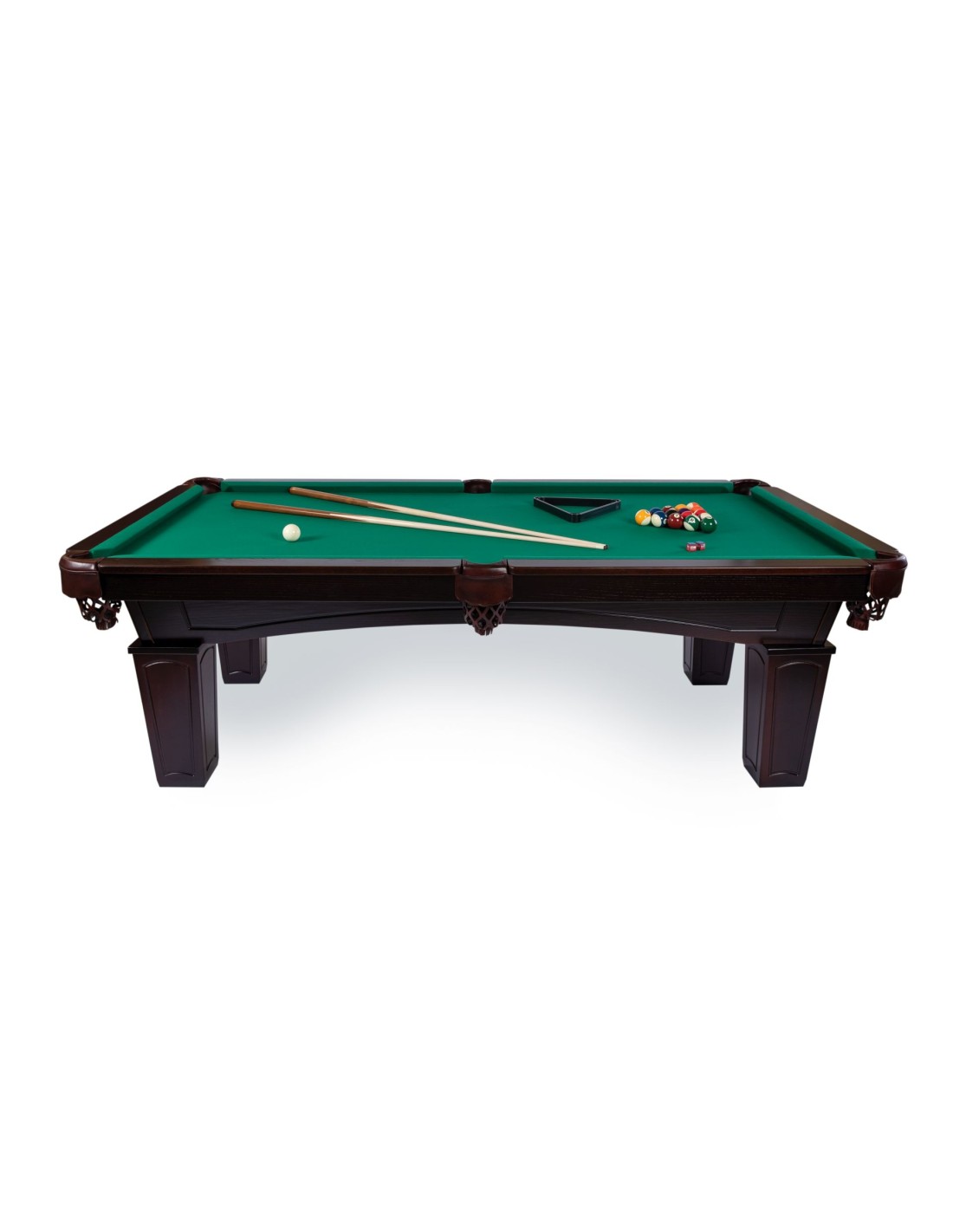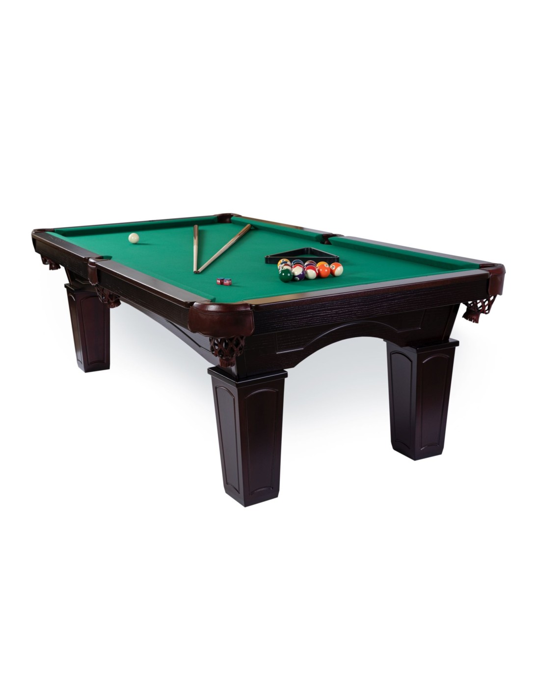 Stalo dydis pėdomis: 8' Stalo dydis: 245x145x80 cm Žaidimo aikštelės dydis: 210x110 cm Rekomenduojamos patalpos dydis: 520x408 cm Žaidimo aikštelė: akmens plokštė Klasikinis žalios spalvos biliardo audinys (renkantis kitą audinio spalvą: priemoka 100-180 Eur) Stalo spalva: tamsiai ruda, riešutmedžio Sklandus kamuolio riedėjimas Šiuolaikiškos patvarios medžiagos Komplektacijoje: 2 lazdos, rutuliai, trikampis, kreida.