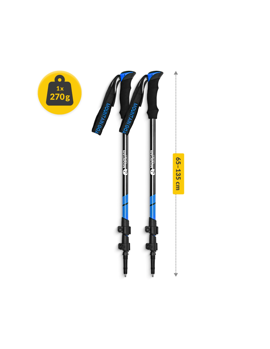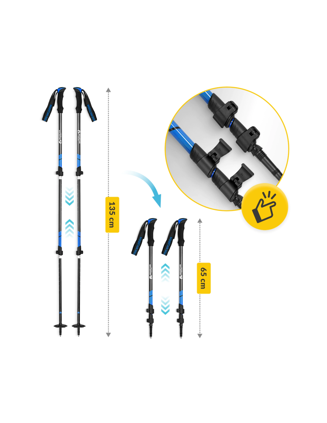✅ Spaustukai leidžia greitai reguliuoti lazdų ilgį nuo 65 iki 135 cm.