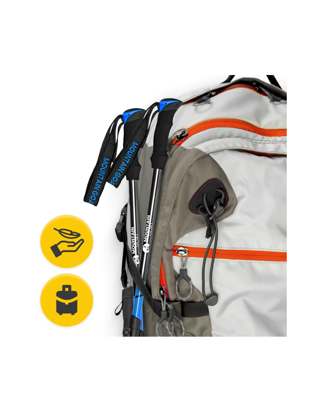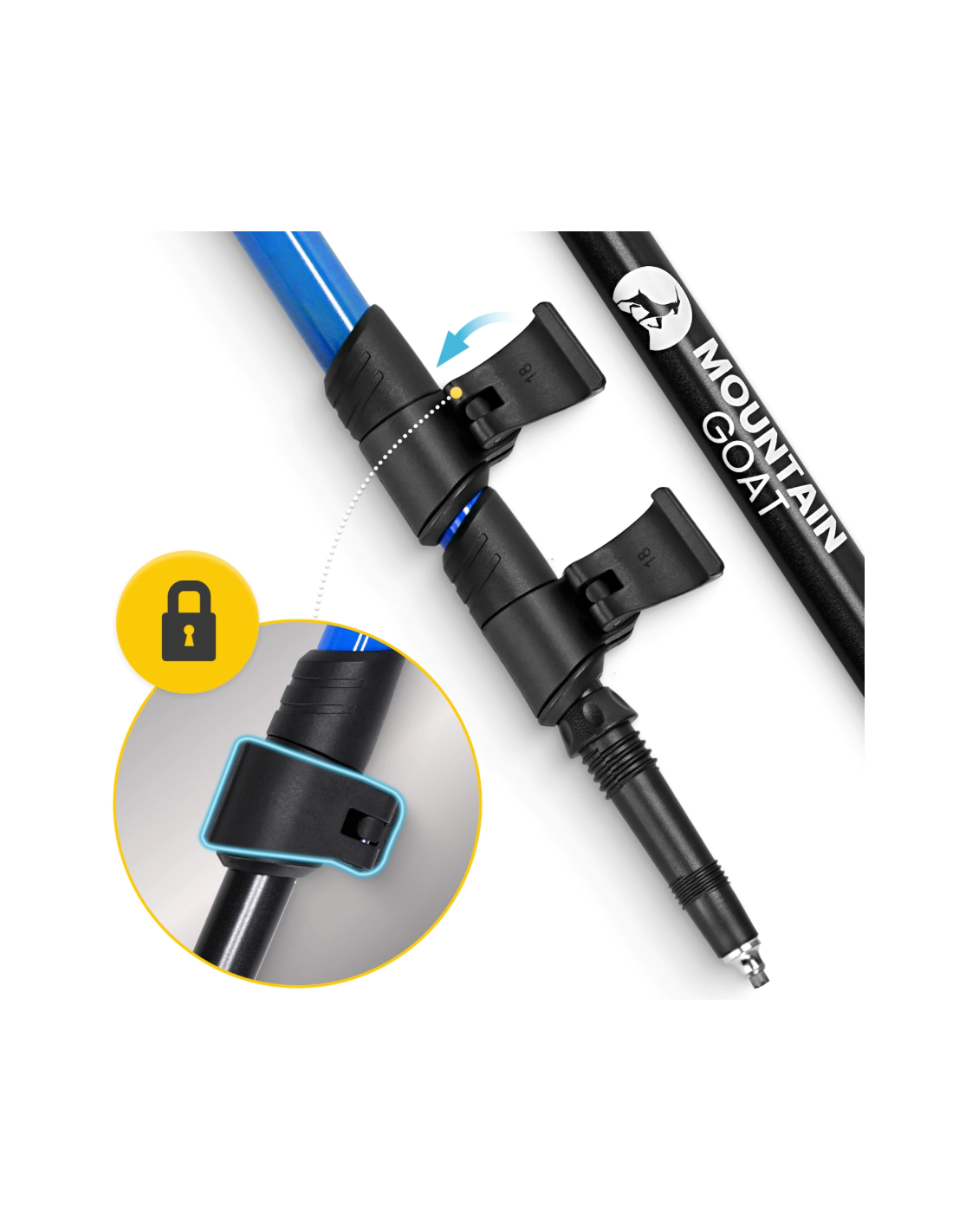 Greito reguliavimo sistema „Safe Lock“ padeda per kelias sekundes reguliuoti „MOUNTAIN GOAT“ šiaurietiško ėjimo lazdų ilgį. Papildomi privalumai – spaustukai ir atspausdinta aukščio skalė , leidžianti lengvai reguliuoti aukštį . Šios savybės užtikrina gerą atramą ir stabilumą , be to, lazdos neatsipalaiduoja net intensyvių treniruočių metu. Sulankstytos šiaurietiško ėjimo lazdos yra tik 65 cm ilgio, todėl jas lengva nešiotis kuprinėje ilgesnių kelionių metu.