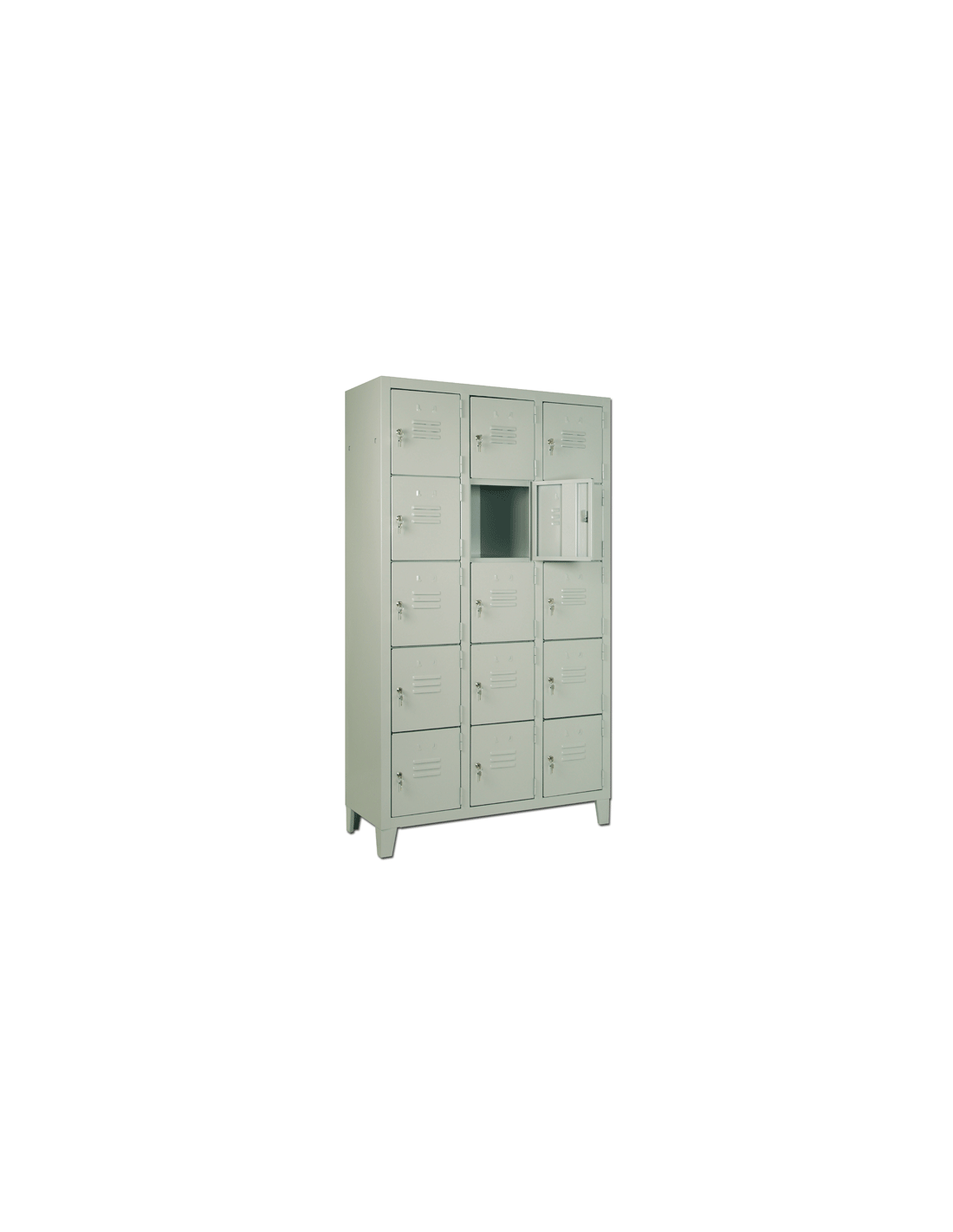 Lakuota, pagaminta iš plieninės konstrukcijos. Sustiprintos skyrelių durys su kvėpavimo angomis, vieta vardo kortelei ir raktų užrakinimo sistema. Spintelė susideda iš 15 atskirų skyrelių.