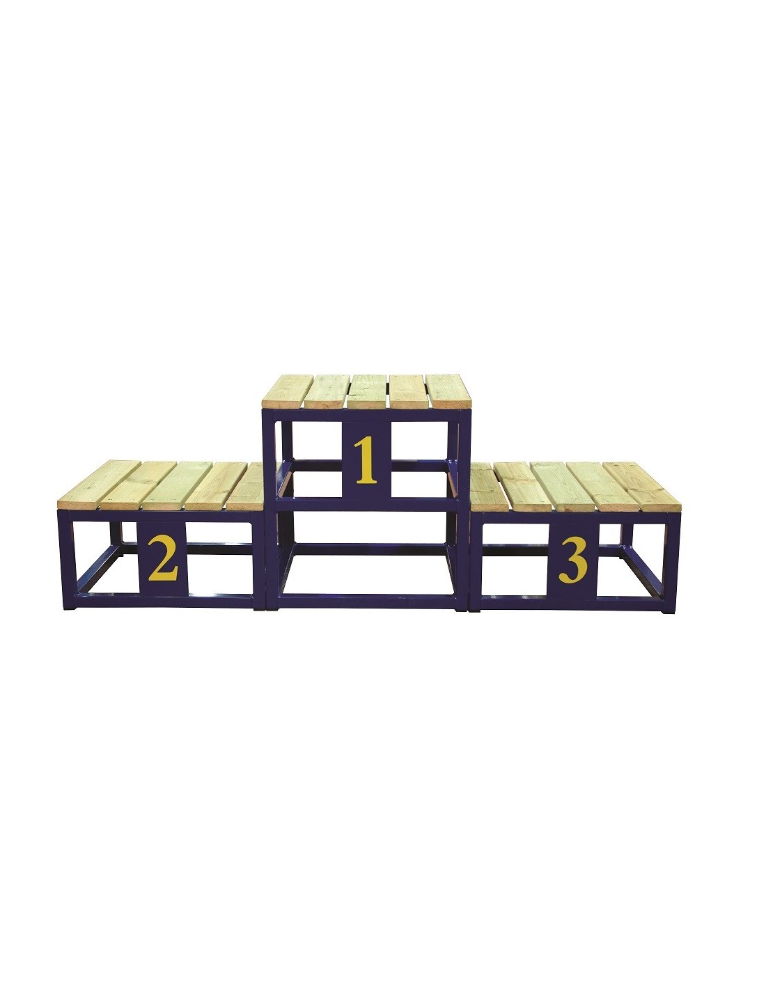 Nugalėtojų pakyla trims asmenims. Tvirta plieninė konstrukcija su medinėmis platformomis.