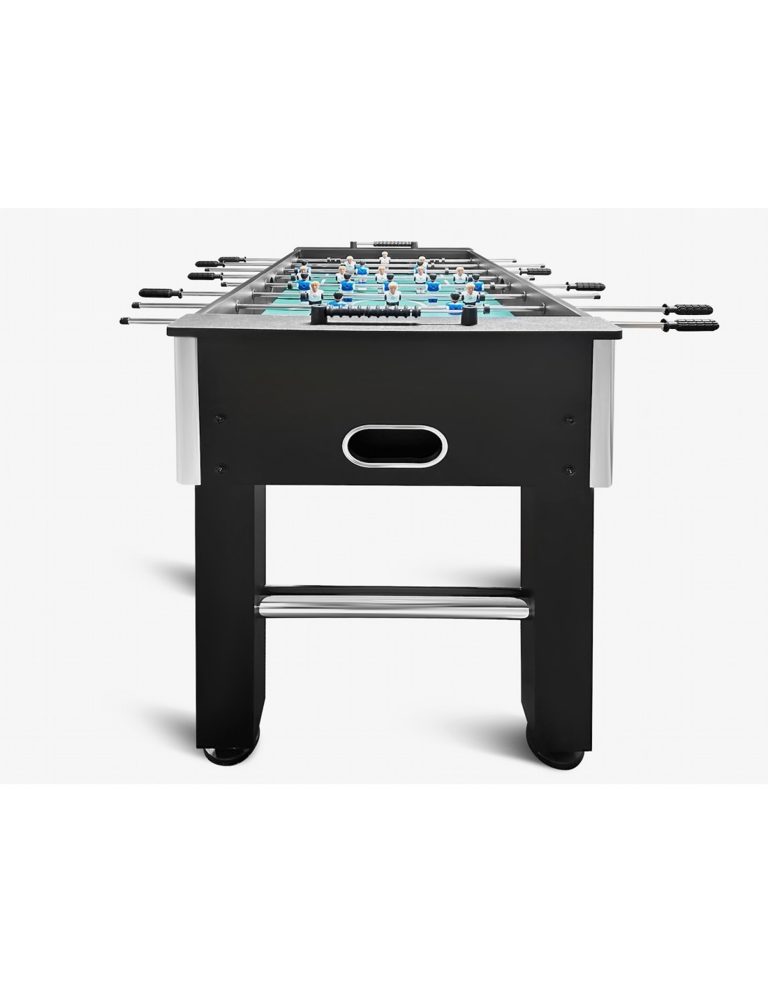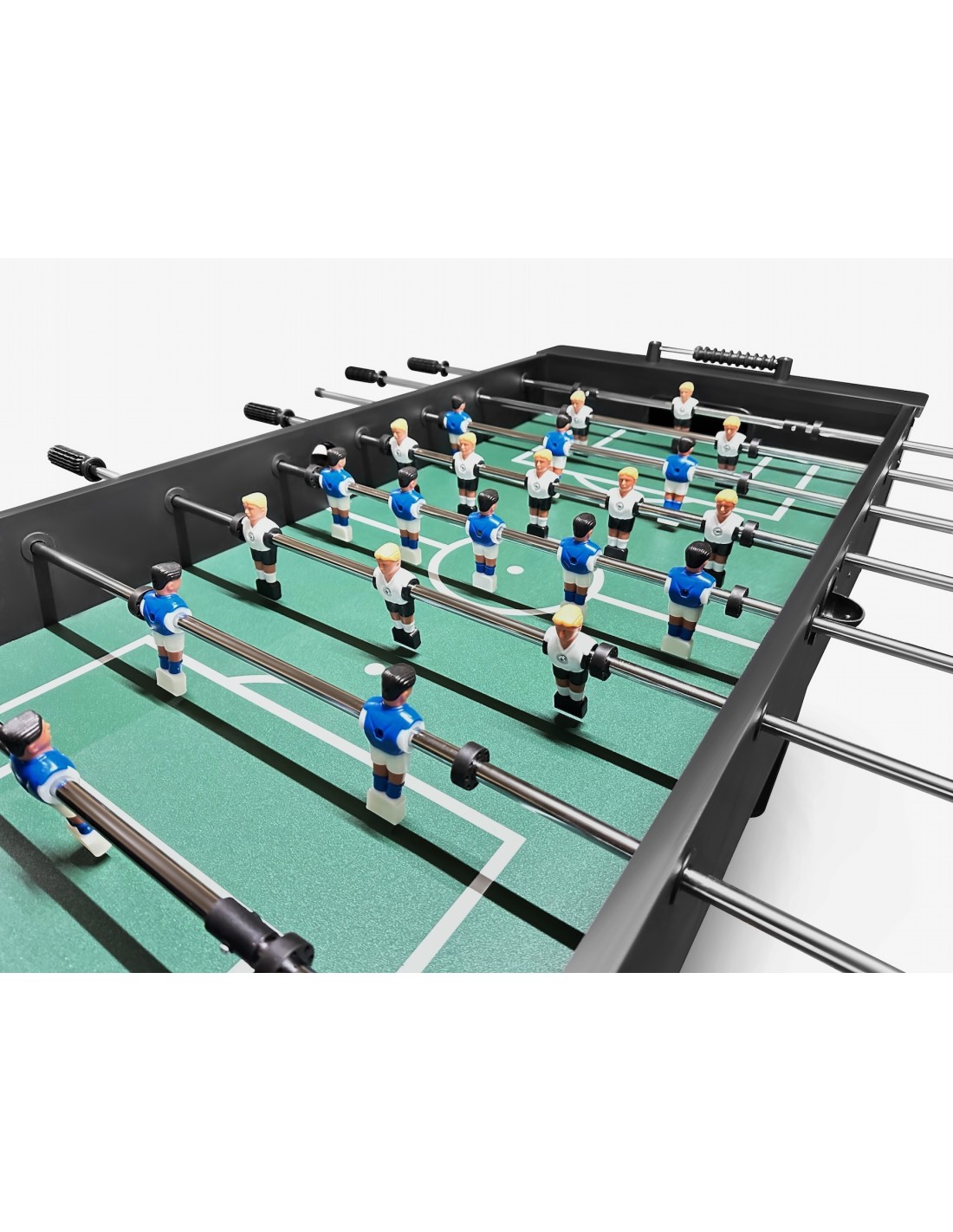 KLASIKINIS BARO ŽAIDIMAS NAMAMS – garantuotai taps vienas iš svarbiausių objektų jūsų poilsio kambaryje, patirsite daugybę smagaus ir azartiško laiko su šeima ar svečiais. GREITAS IR SMAGUS - stalo visuose keturiuose šonuose žaidimo aikštelė yra su nuolydžiu, kuris užtikrina, kad žaidimo metu nebus jokių "mirtinų" taškų sustojant kamuoliukui. Po įvarčio kamuoliukas greitai nurieda į kamuoliukų talpyklą, ir vėl galima žaisti! SUNKUS, STABILUS – masė yra vienas svarbiausių sąvybių, reikalingų stalo futbolo žaidimui. Futbolo stalas sveria 33.5 kg, puikus masės ir stalo dydžio santykis, reikalingas stabiliam ir teisingam žaidimui. ATSPARI KONSTRUKCIJA – pagaminta iš storų MDF plokščių, suteikia stalui stalui masyvią išvaizdą bei stabilų žaidimą, jam nebaisi vibracija ir smūgiai, kuriuos sukuria azartiški lošėjai. PUIKŪS ŽAIDIMO KOMPONENTAI – 13 mm skersmens chromuoti plieno strypai sklandžiai slysta per guolius. Patogios ergonominės rankenos tvirtam sukibimui su ranka ir žaidimo kontrolei. Kokybiški lieto plastiko žaidėjai gerai matomi žalios žaidimo aikštelės fone, dvi rezultatų skaičiuoklės įvarčių skaičiavimui bei 2 klasikiniai juodai balti futbolo kamuoliukai komplektacijoje. Grindų nelygumus padės išlyginti 4 reguliuojamos kojelės su guminiais padais – saugo grindis. SUKURTAS TARNAUTI ILGAI – stabilizuojantis skersinis tarp stalo kojų, masyvios stalo kojos, tvirtas MDF plokščių korpusas, padengtas vinilu, atsparus dėvėjimuisi ir drėgmei, galima naudotis nešildomose patalpose. LENGVA IR PAPRASTA - greitai surinkite pagal pridedamą vaizdinę instrukciją ir mėgaukitės žaidimu iškarto. Rekomenduojame futbolo stalą visiems šio žaidimo mėgėjams naudotis namuose, nedideliuose biuruose ar bendruomenių klubuose.