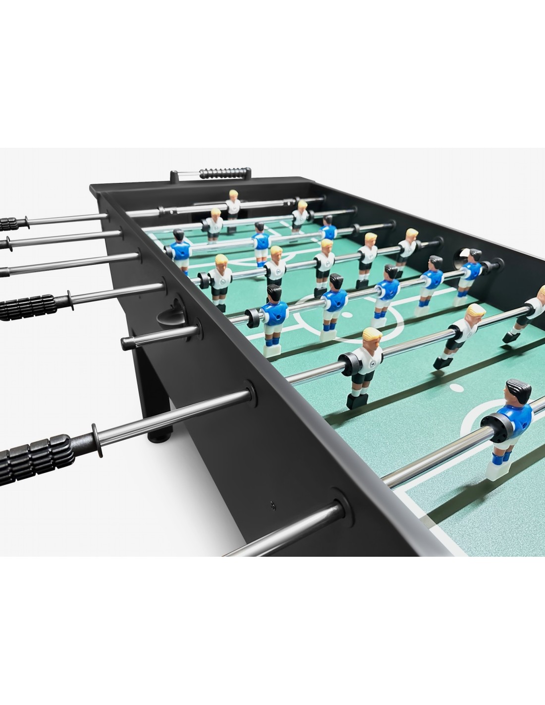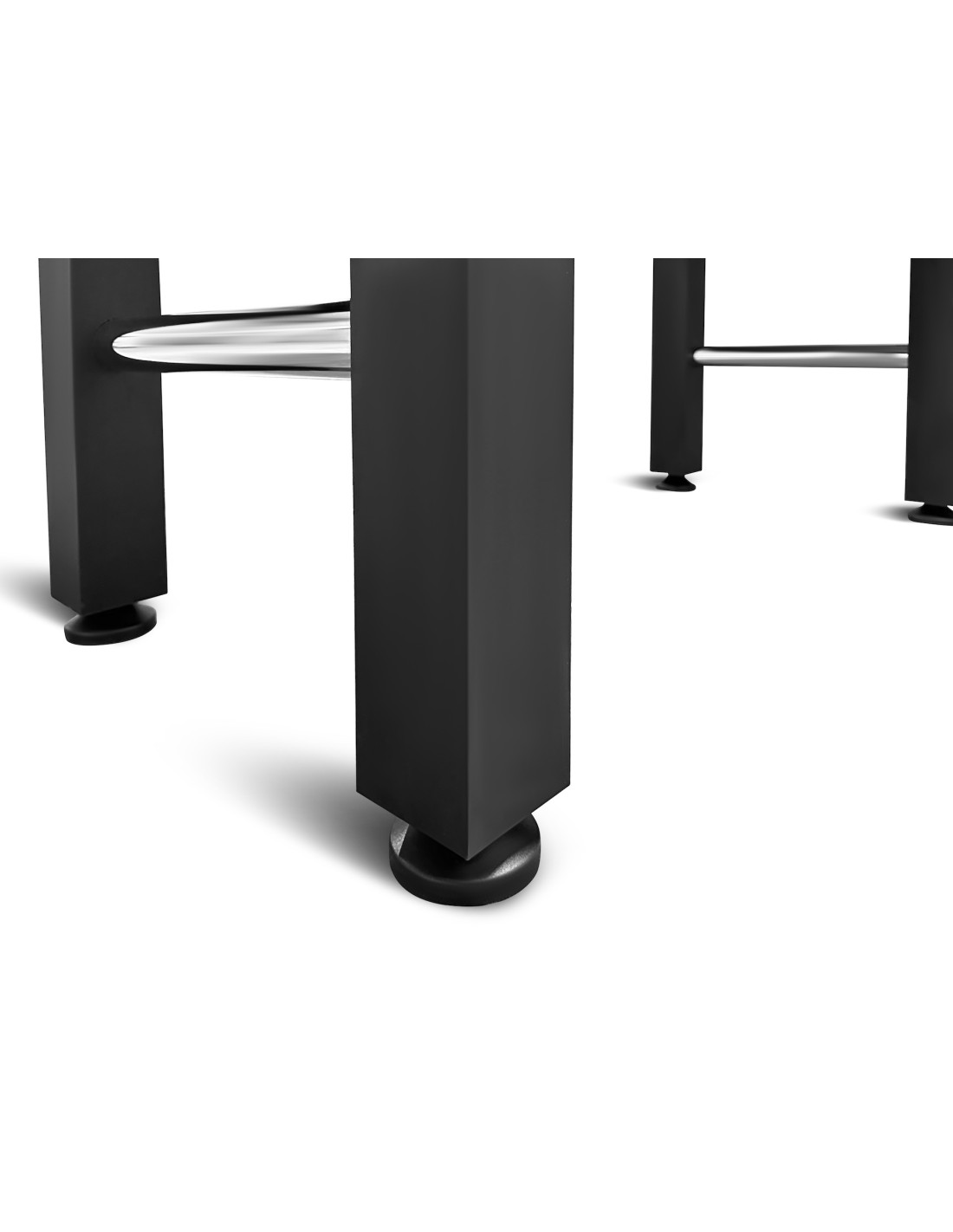 Stalo svoris – 33.5 kg Pagamintas iš aukštos kokybės MDF plokščių Stalo spalva – juoda Stalo išmatavimai: 137 x 65 x 86 Žaidimų aikštelės išmatavimai: 117 x 60 cm Žaidimų aikštelės storis: 9 mm Nuolydžio kampai žaidimo aikštelės šonuose Aikštelėje 22 žaidėjai (išdėstymas: 1-2-5-3) 13 mm storio chromuoti plieniniai žaidėjų strypai PVC strypų guoliai Patogios ergonominės rankenos Kamuoliukų grąžinimo sistema stalo šonuose Kojų apimtis 9,5x9,5 cm Reguliuojamos kojelės 2 gėrimų laikikliai 2 rezultatų skaičiuoklės Komplektacijoje 2 klasikiniai juodai balti futbolo kamuoliukai