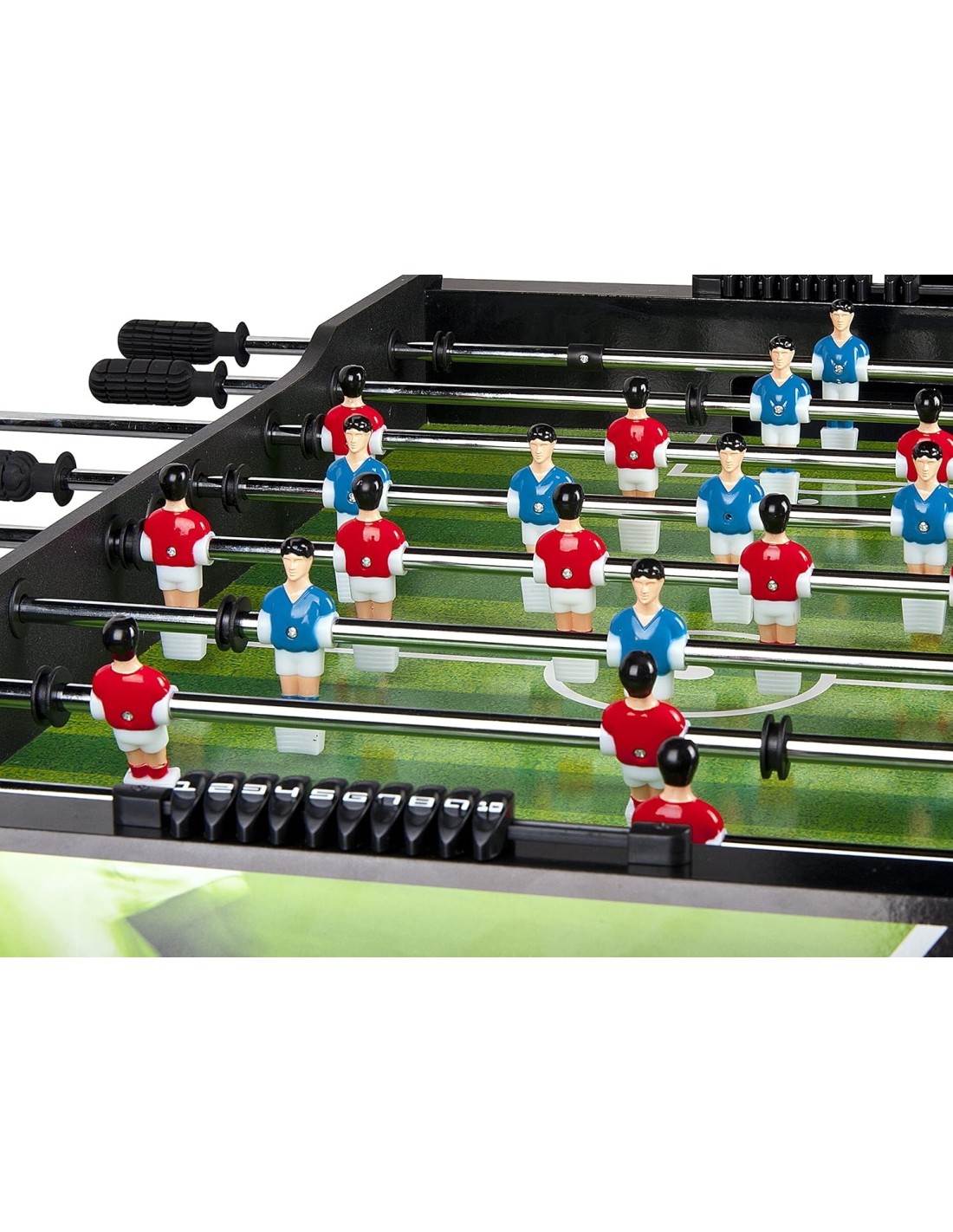 Stalo svoris – 18 kg Pagamintas iš aukštos kokybės MDF plokščių Stalo išmatavimai: 122 x 61 x 81 cm Žaidimų aikštelės išmatavimai: 105 x 58 cm Kampai su nuolydžiu žaidimo aikštelės šonuose Aikštelėje 22 žaidėjai (išdėstymas: 1-2-5-3) 13 mm storio chromuoti plieniniai žaidėjų strypai Patogios ergonominės rankenos Kamuoliukų grąžinimo sistema stalo šonuose Korpuso sienelių storis 16 mm Užlenkiamos į viršų kojos - taupo vietą! 2 rezultatų skaičiuoklės Komplektacijoje 2 klasikiniai futbolo kamuoliukai