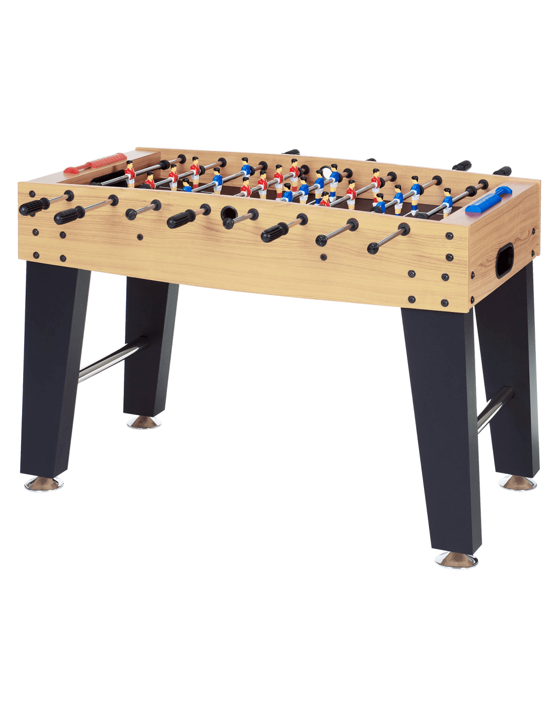 Konstrukcija ir medžiagos: Korpusas pagamintas iš MDF 15 mm storio su melamino danga. Spalva: šviesus ąžuolas. Tvirtos ir elegantiškos įstrižos kojos, pagamintos iš MDF su juoda melamino danga, kartu su chromuotomis jungiamosiomis juostomis užtikrina stalo stabilumą net ir intensyvaus žaidimo metu. Komplekte yra chromuotos reguliuojamos kojelės, leidžiančios tobulai išlyginti žaidimo paviršių, net ir ant nelygių grindų. Žaidimo paviršius: Žaidimo aikštelė taip pat pagaminta iš MDF su melamino danga. Specialus „žolės“ efektas su baltomis šilkografuotomis linijomis atkartoja stadiono aikštę. Strypai : Vamzdiniai strypai, skersmuo 13 mm, storis 1 mm. Galimos dvi versijos: ištraukiami strypai, kurių galai padengti plastikinėmis apsaugomis, ir teleskopiniai (įeinantys) strypai, skirti didesniam saugumui. Žaidimo figūrėlės ir išdėstymas: Žaidimo figūrėlės išdėstytos pagal schemą: 1 (vartininkas), 3 (gynėjai), 4 (saugai), 3 (puolėjai). Vartininkas gali suktis aplink savo ašį, todėl įmušti įvartį yra lengviau ir smagiau. Priedai: Kamuolių atgavimo sistema yra paprasta ir greita, per apavalias angas esančias už vartų. Komplekte du juodai-baltos spalvos kamuoliukai, primenantys futbolo kamuolį.