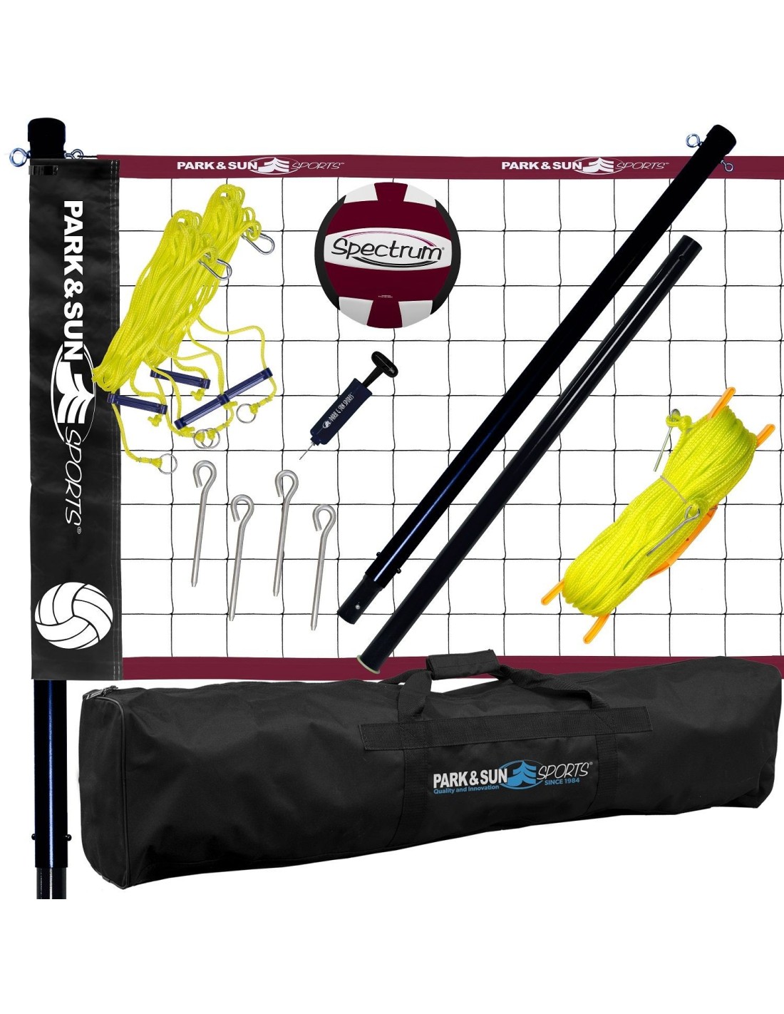 Nešiojamas Park & Sun tinklinio rinkinys lengvai ir greitai montuojasi. Rinkinį sudaro: kaiščiai, 18 panelių dizaino, mašina siūtas, minkštas tinklinio kamuolys, pompa ir transportavimo krepšys.