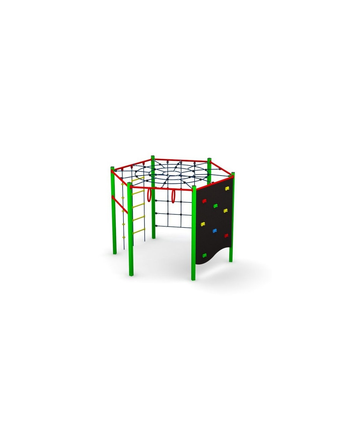 Zestaw sprawnościowy Sześciokąt Wielofunkcyjny na plac zabaw z pajęczxyną i elementami do wspinaczki.