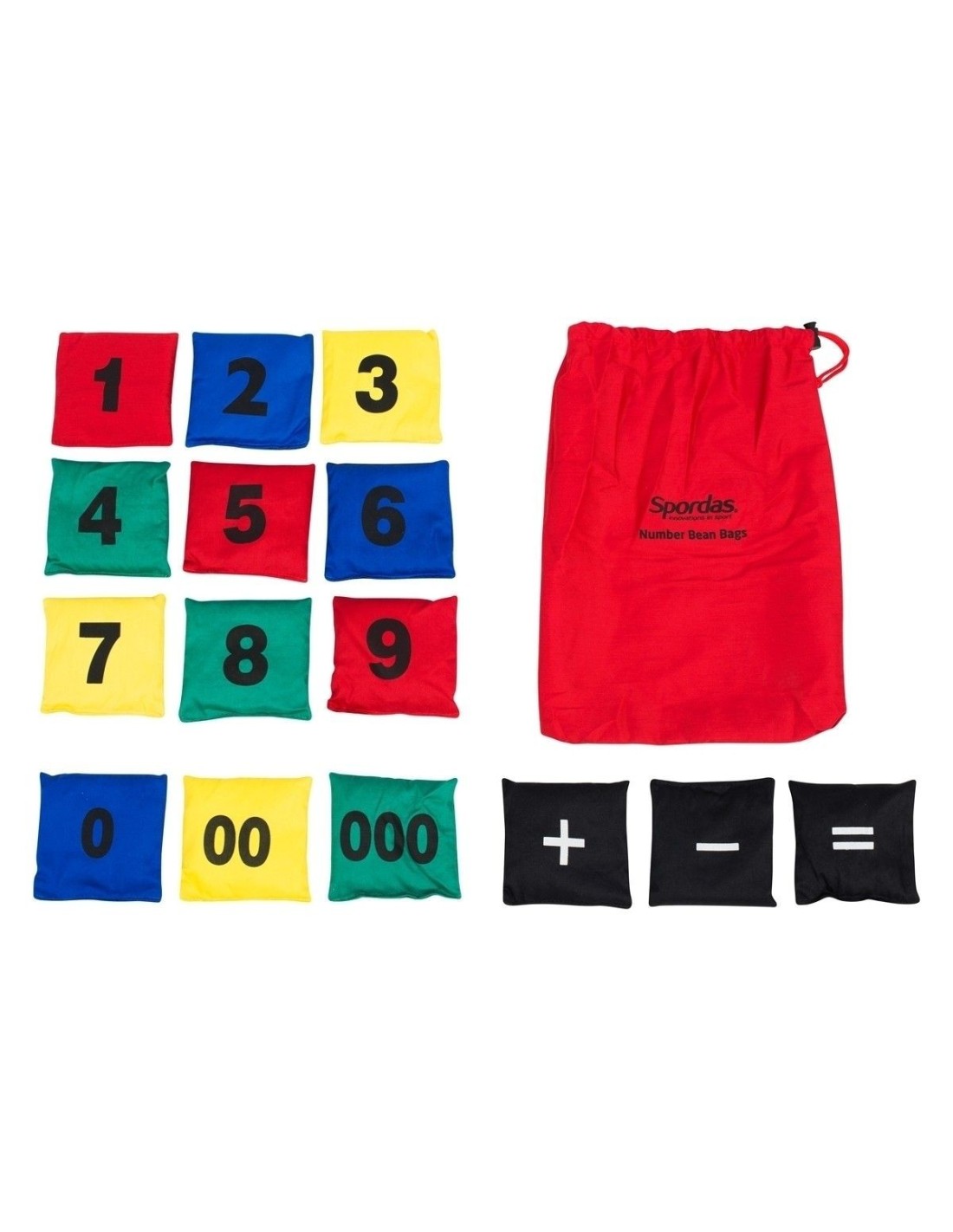 Rinkinį sudaro 15 spalvotų medvilninių maišelių su skirtingais skaičiais (nuo 0 iki 9 plius 00 ir 000) ir matematiniais simboliais (+, -, =).