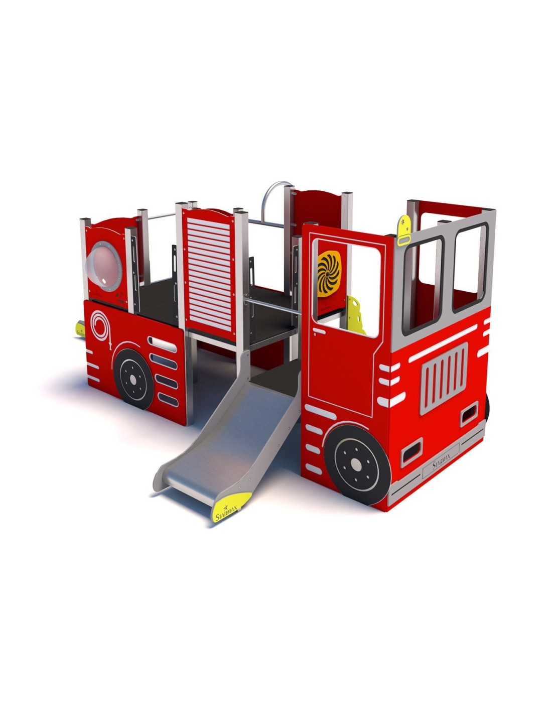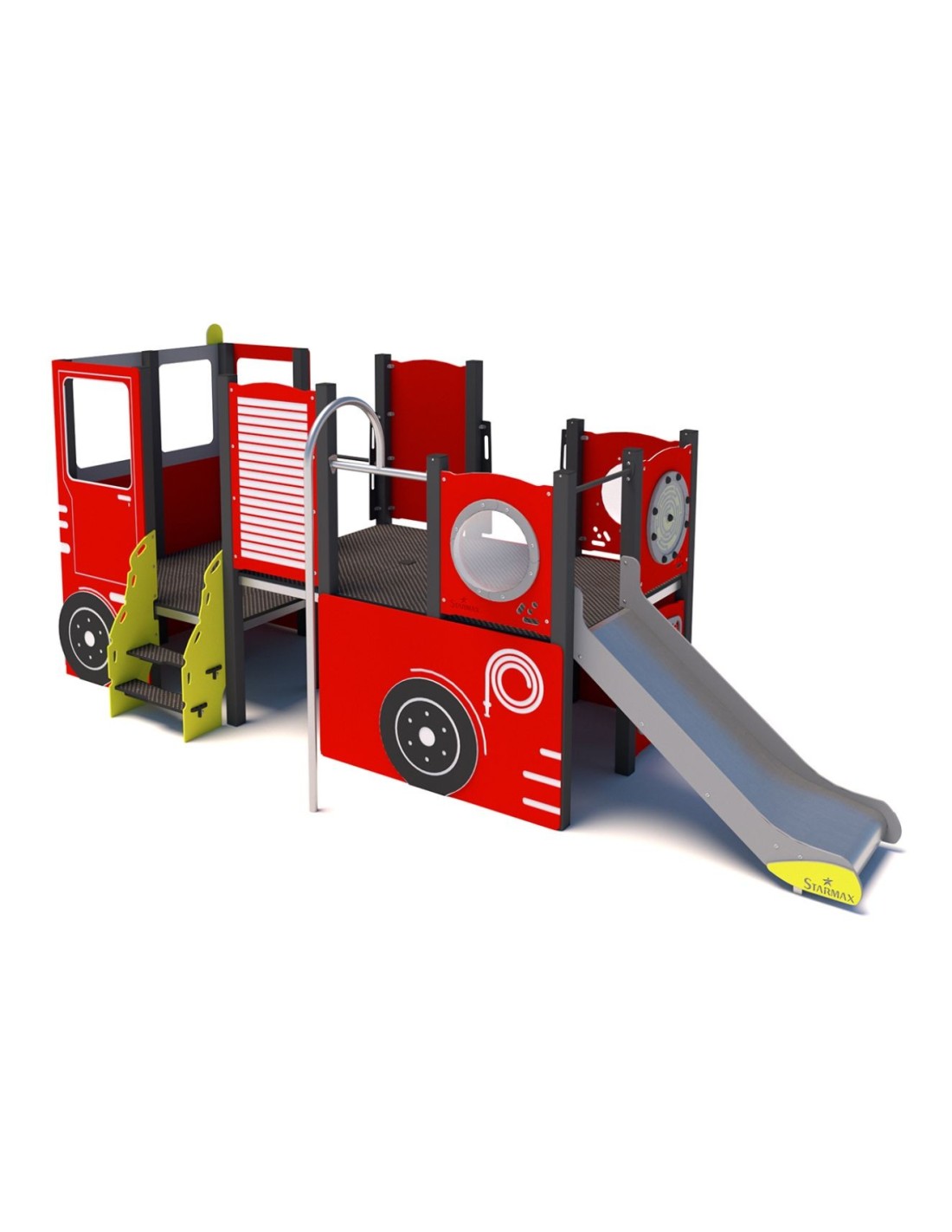 Rinkinyje yra raudonos ir baltos sienos su detalėmis, kurios ištikimai atkartoja gaisrinį automobilį, o tai žadina vaikų vaizduotę. Žaidimų komplekte yra dvi čiuožyklos - mažos ir vidutinės, dvi skirtingo aukščio platformos, laiptelis, iliuminatoriai, ugniagesio vamzdis ir ugniagesio detalės iš spalvingo HDPE. Nedidelis žaidimų rinkinys stilistiškai primena gaisrinį automobilį, kuris bus mėgstamiausia mažųjų ugniagesių žaidimo vieta. Daugelis vaikų svajoja tapti ugniagesiais, todėl šis rinkinys įgyvendina jų svajones.
